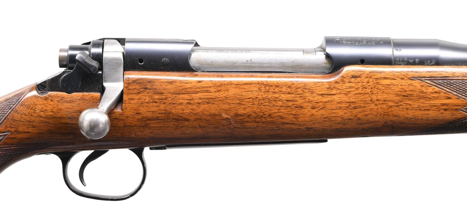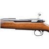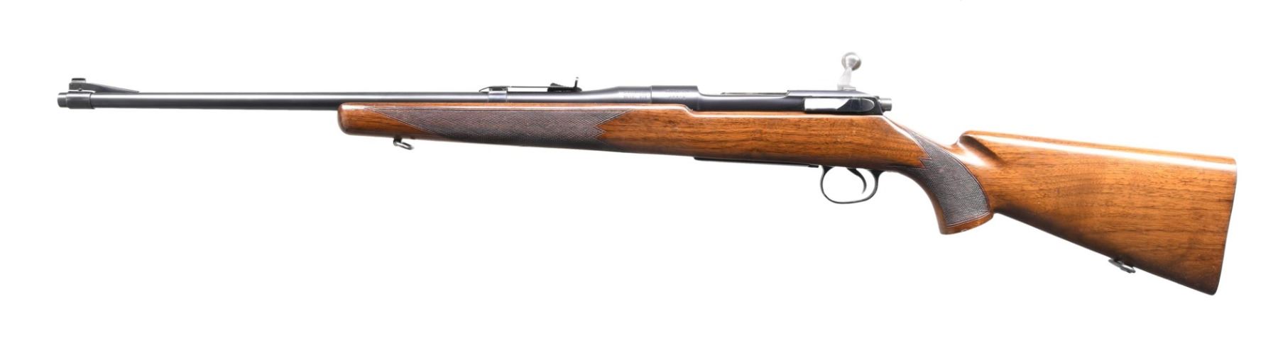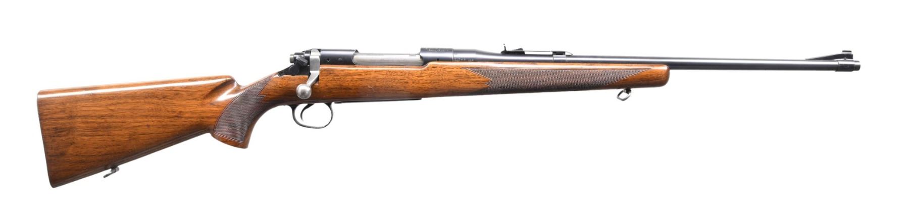 Cal. 30-06. S# 40713. Bbl. 22". Bbl. band ramp mounted bead front sight w/ elevator adj. sporting rear sight. Greatly improved version of the 1917 Enfield action. Classic style walnut stock w/ hand checkering, sling swivels & checkered steel buttplate. Only 2,500 mfg. 1941-44. CONDITION: over 95% original blue. Rear receiver bridge has 1 open hole. Original stock finish shows numerous scratches & marks. (24-2595/DS). CURIO. $2,500-3,250.
