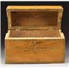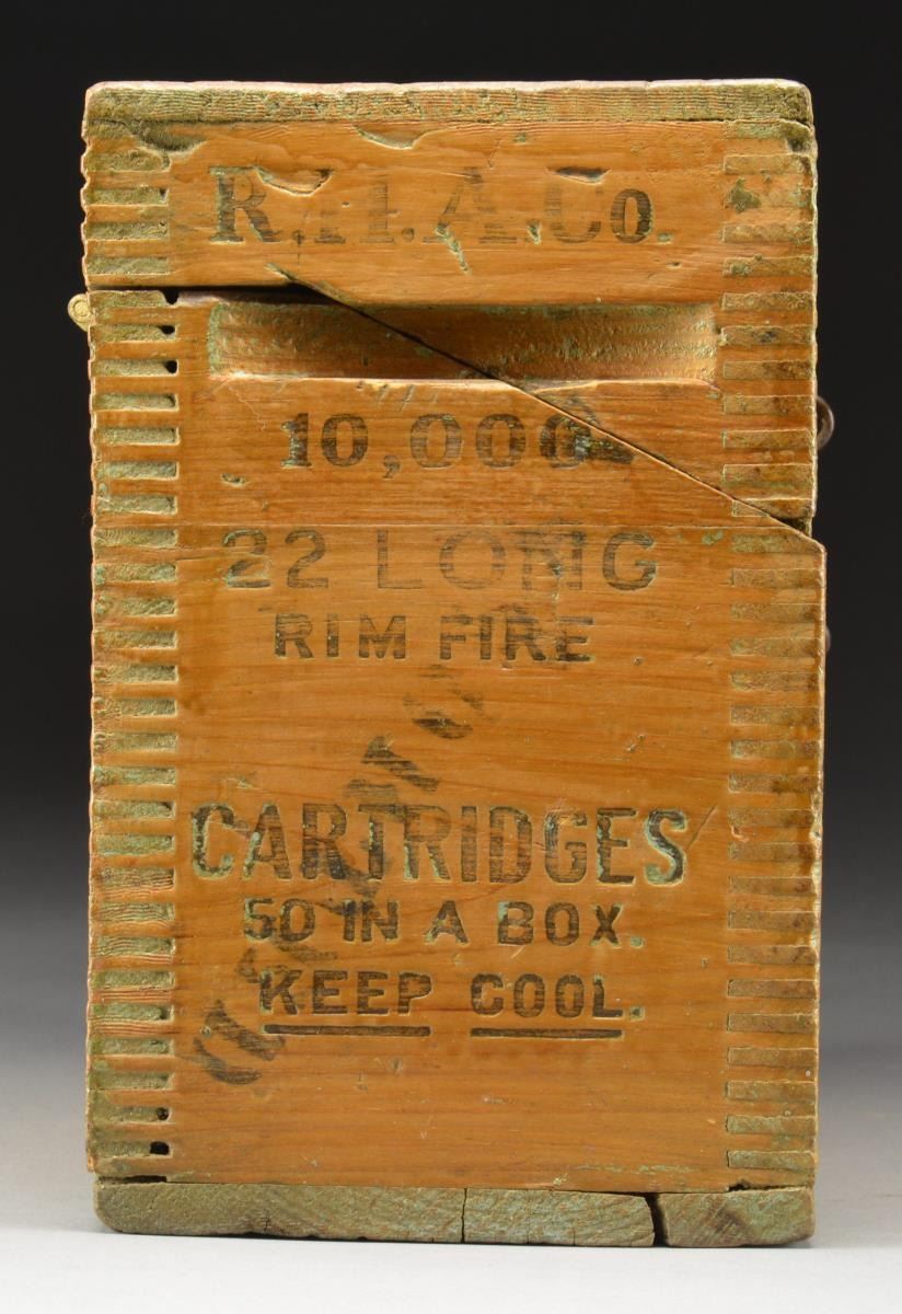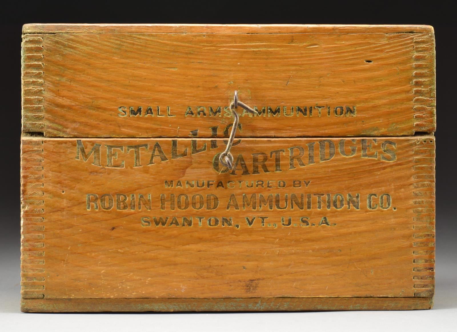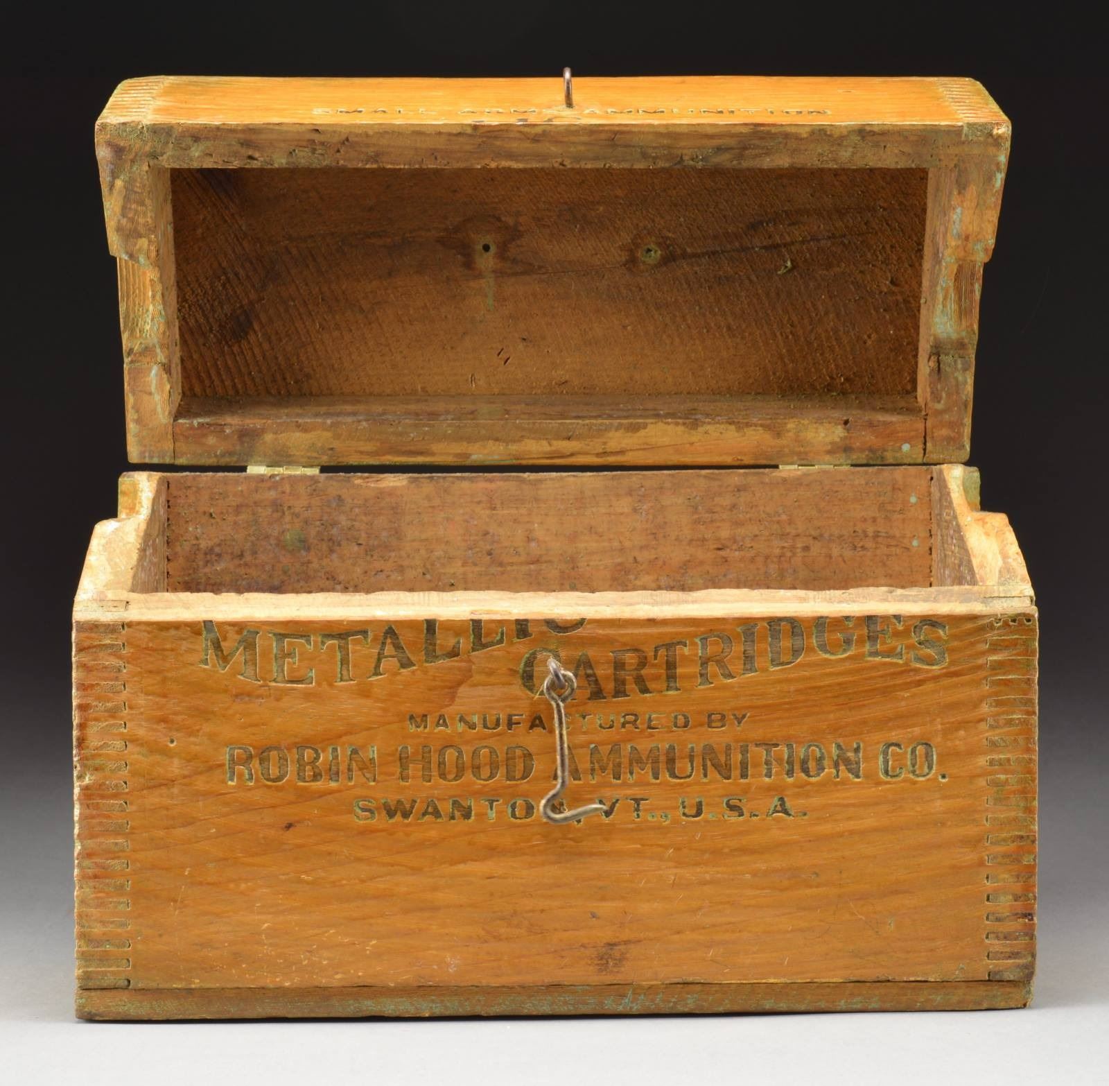 The Robin Hood Ammunition Company was started in 1898 & moved to Swanton, VT in 1909. During WWI, the company & factory was bought by Remington-UMC & produced 8MM Lebel ammunition along side their Berthier & Rolling Block firearms contracts. After the Armistice, the company business closed down as demand contracted. This 15.5" x 11" x 7" crate has a hinged lid that can hold 10,000 22 Long Rifle cartridges. Sides are dovetailed together w/ bottom piece nailed to sides. CONDITION: good overall w/ appearing clear markings including various other markings. Box shows wear, mold staining, marks & lg. wood grain checks. (02-16599-9/MD). $200-400.