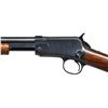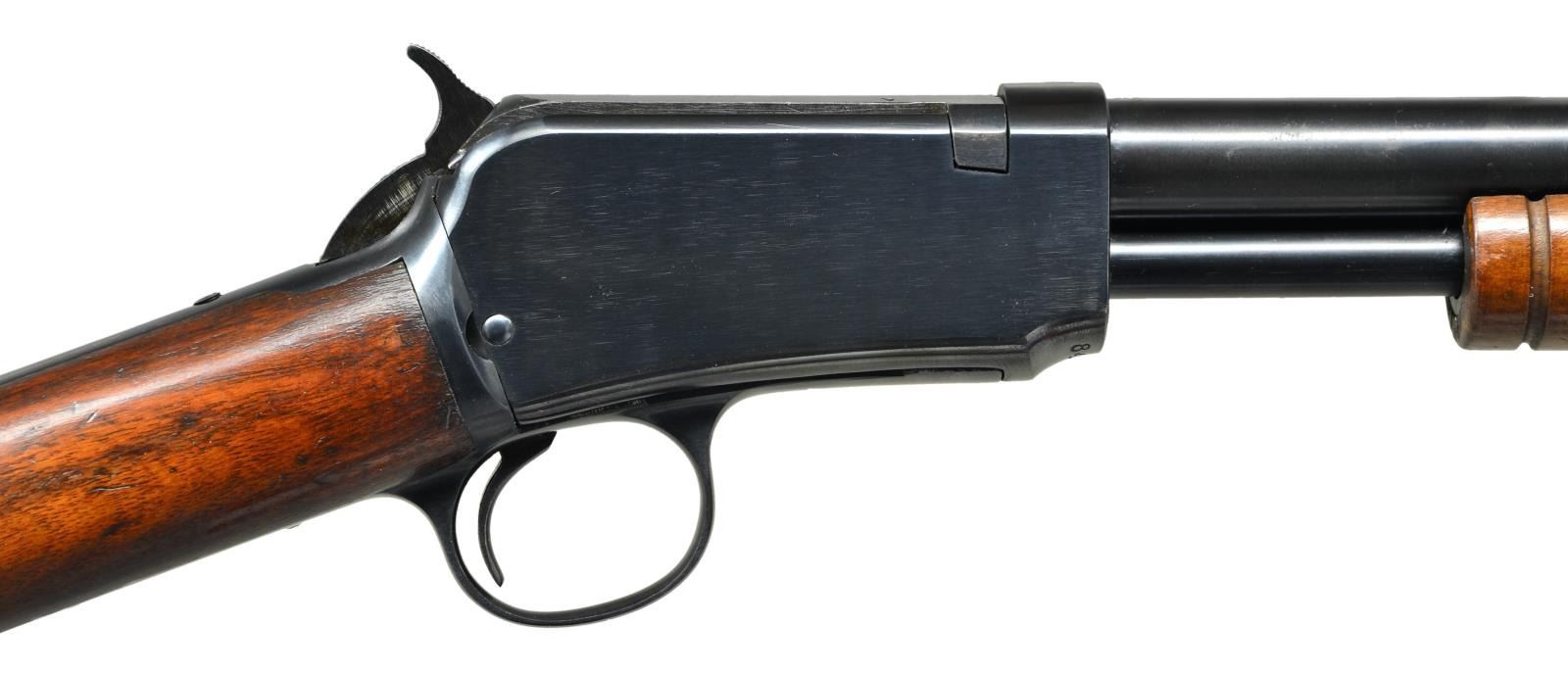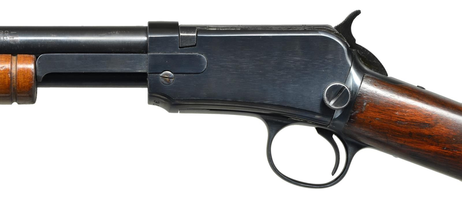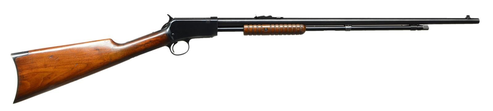 Cal. 22 Long. S# 848476A. Bbl. original 23” round w/ proper “WP” proof marks. Round bbls. were shipped on some late production model 90s. Most round barreled model 90s seen today have replacement bbls. w/ circle "P" parts proofed. Original sporting sights. Tubular mag. Full blue finish. Small round grooved slide handle w/ straight gripped stock having crescent steel buttplate. Regular production was discontinued in 1932, however, cleanup production lasted until 1937 ending at approx. S# 849000. CONDITION: very fine retaining over 97% blue. Original wood finish shows light wear & darkening w/ scattered scratches & marks. Bright near excellent bore. (23-477/DS). CURIO. $2,500-3,500.