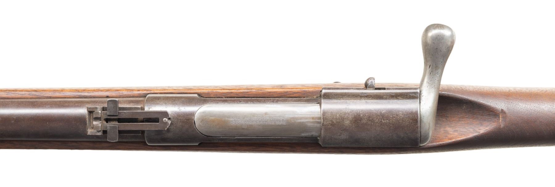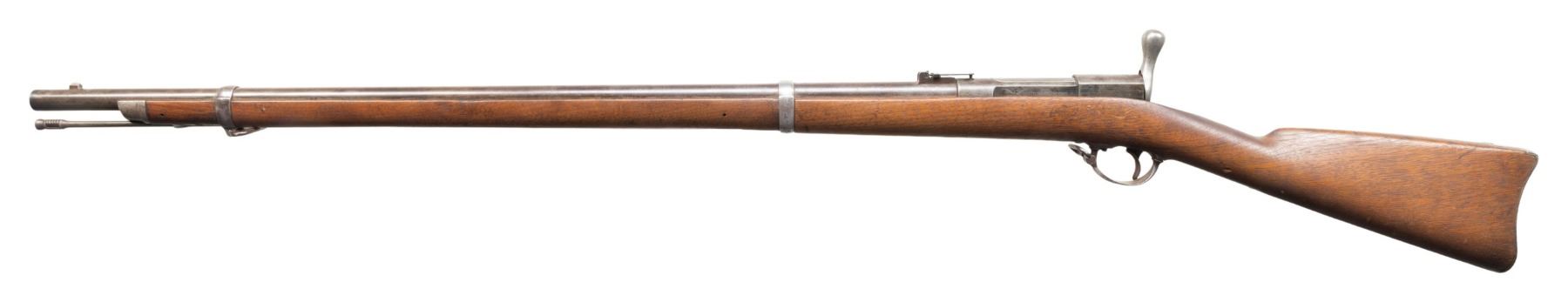 RIFLE.Cal. 50-70. NSN. Bbl. 32 5/8". Blade front sight. Ladder rear sight graduated to 900yds. Scarce early Springfield Armory bolt action rifle with only 1,011 rifles made. Walnut stock with bottom mounted sling swivels. Left side of stock has faint inspector's cartouche. Ramrod present. UNATTACHED ACCESSORIES: repro manual. CONDITION: stock appears lightly sanded with some improper band removal wear, light chipping in ramrod channel, dings & handling marks. Bands & buttplate have a bright appearance with dings & oxidation. Other metal parts have a dull gray appearance with scattered old oxidation edge wear & light dings. Action appears to function properly when hand cycled. Bore shows scattered pitting but strong rifling. PROVENANCE: From the PMRB Collection. (01-28415/MJC). ANTIQUE. $1,000-1,500.