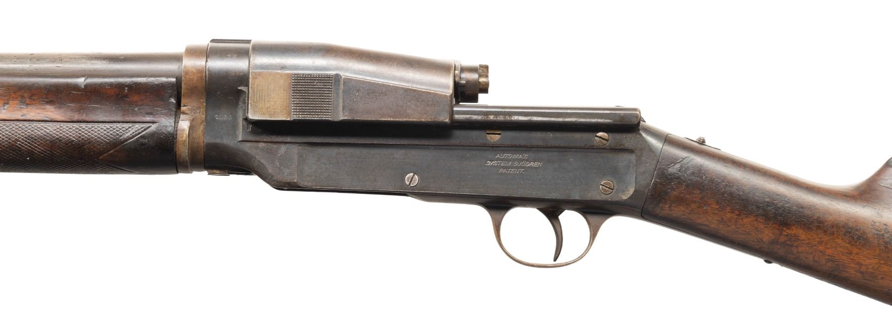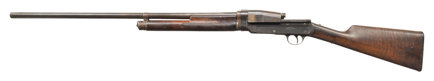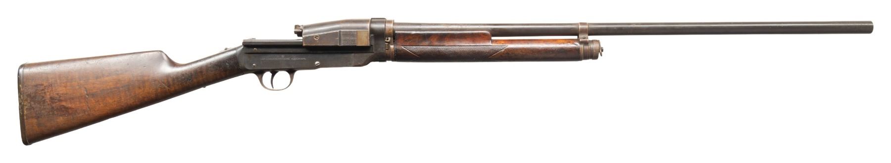 Cal. 12 Ga. S# 1066. Approx. 5000 mfg. 1907-1909 in Copenhagen, Denmark & designed by Carl Zel Theodor Sjogren of Sweden. Plain 28" bbl. w/ matching numbered barrel extension & no bead. Fixed Full choke. Recoil operated action w/ tubular mag. British crown "V" proof on receiver. Checkered walnut stock set w/ swivel on mag. tube & hard rubber buttplate. CONDITION: barrel has brown patina with cleaned pitting, numerous dents & wear 4.5" from chamber. Receiver has fair worn blue mixed with brown patina & scattered spots of corrosion. Worn wood finish with deep gouges, missing toeline sling swivel & numerous dings throughout. Bright shiny bore. Bore shows fouling & sm. dents throughout. Action has weak spring & loose functioning; breech block only locks into breech when trigger is pulled. PROVENANCE: From the PMRB Collection. (25-5911/MD). CURIO. $800-1,200.
