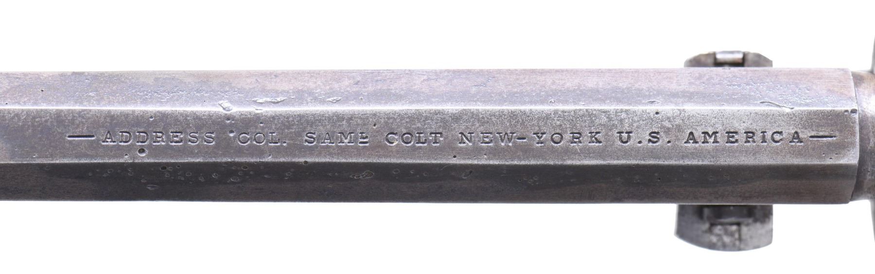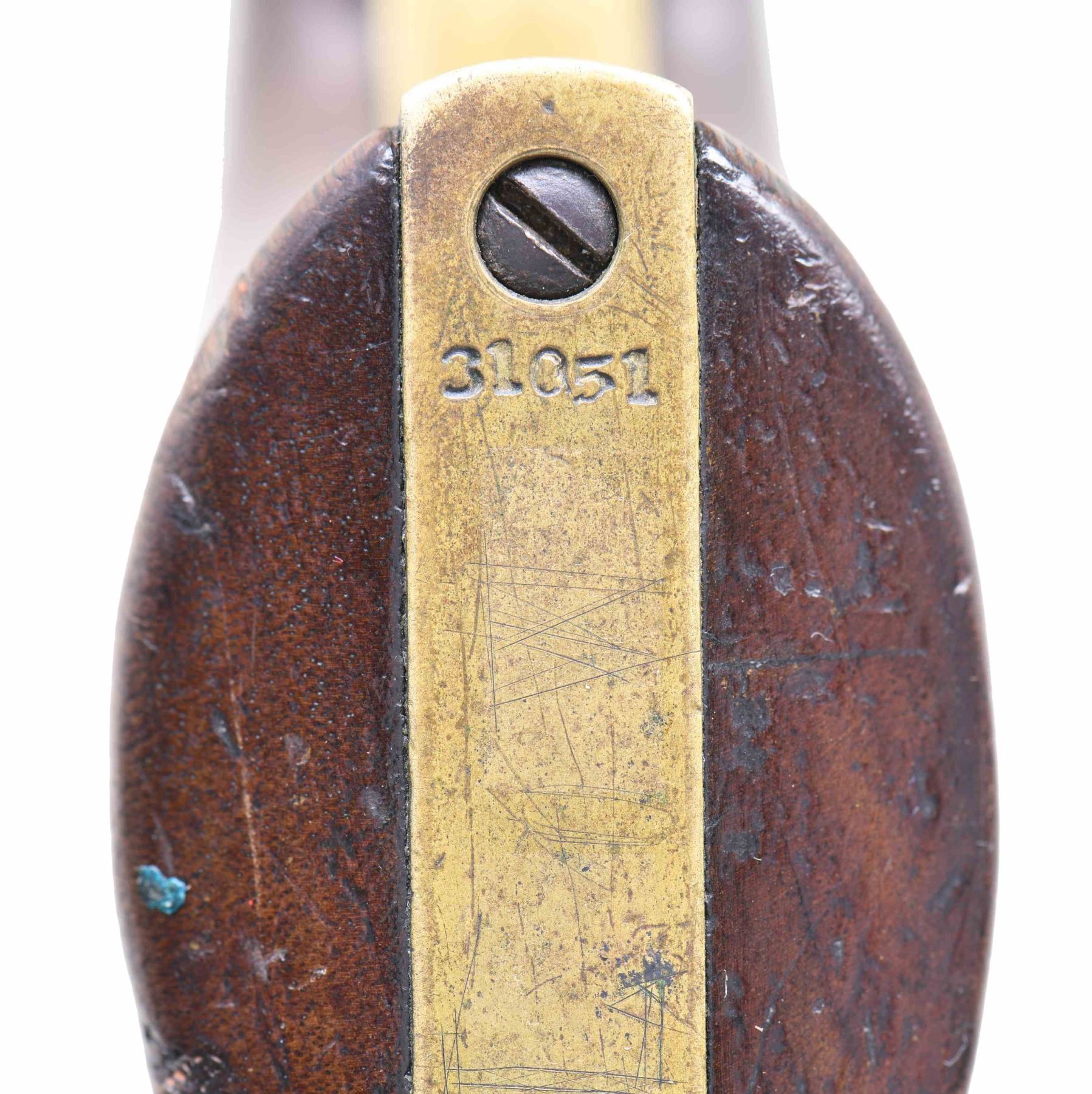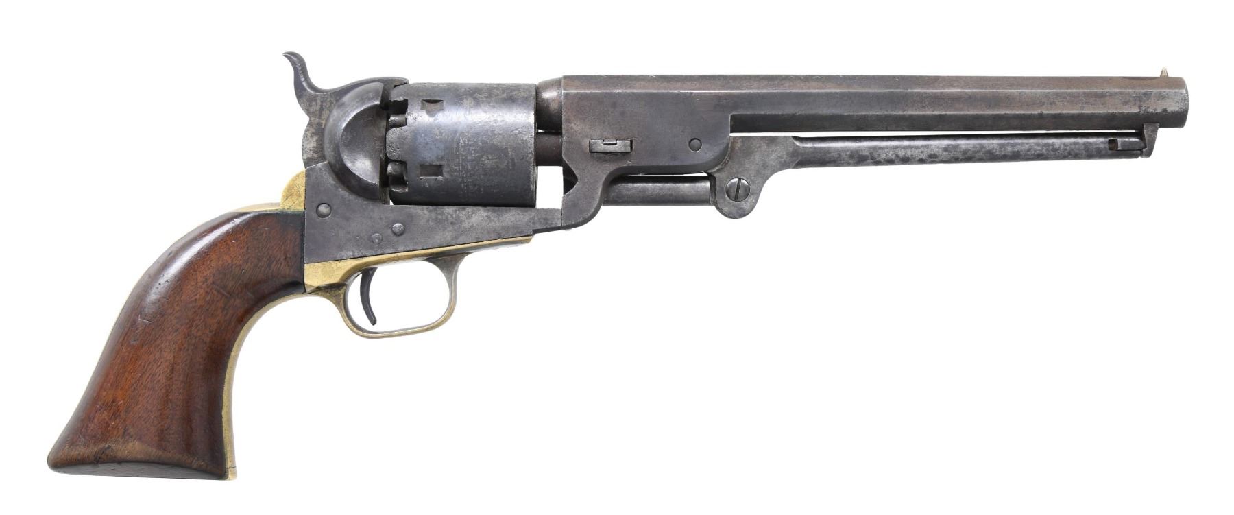Cal. 36. S# 31051. Transitional 3rd model 1851 navy, made in 1854. It is among the highest serial numbers noted still with earlier loading lever screw entering from right side opposite side of frame & barrel lug screws, small non-beveled "V" notch loading aperture in barrel lug, otherwise standard 3rd model features: 7.5" octagonal barrel, brass pin front sight, 1-line New York address, brass backstrap & triggerguard, small "COLTS PATENT" stamped on left side of frame, varnished walnut grip. CONDITION: very good overall, all original & matching, overall mottled gray patina, crisp markings, grips retain 90% of their original factory varnish. Mechanically fine, crisp rifled bore. PROVENANCE: Roger Ballard collection. (01-26615/JS). $1,500-2,500.
