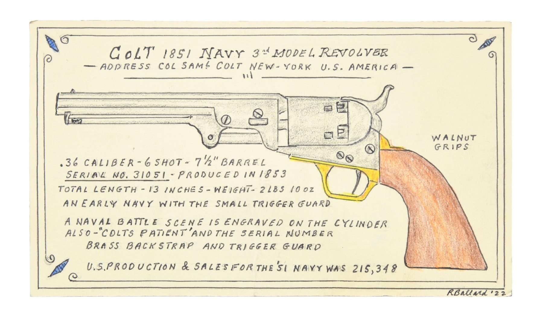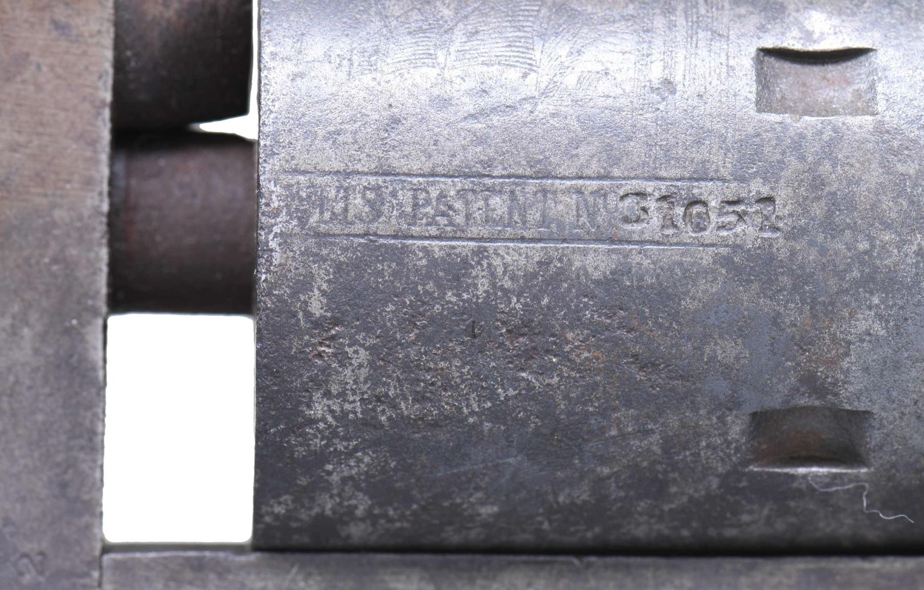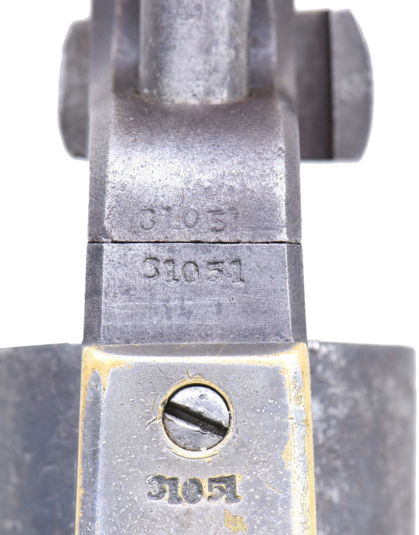 Cal. 36. S# 31051. Transitional 3rd model 1851 navy, made in 1854. It is among the highest serial numbers noted still with earlier loading lever screw entering from right side opposite side of frame & barrel lug screws, small non-beveled "V" notch loading aperture in barrel lug, otherwise standard 3rd model features: 7.5" octagonal barrel, brass pin front sight, 1-line New York address, brass backstrap & triggerguard, small "COLTS PATENT" stamped on left side of frame, varnished walnut grip. CONDITION: very good overall, all original & matching, overall mottled gray patina, crisp markings, grips retain 90% of their original factory varnish. Mechanically fine, crisp rifled bore. PROVENANCE: Roger Ballard collection. (01-26615/JS). $1,500-2,500.