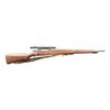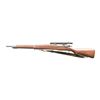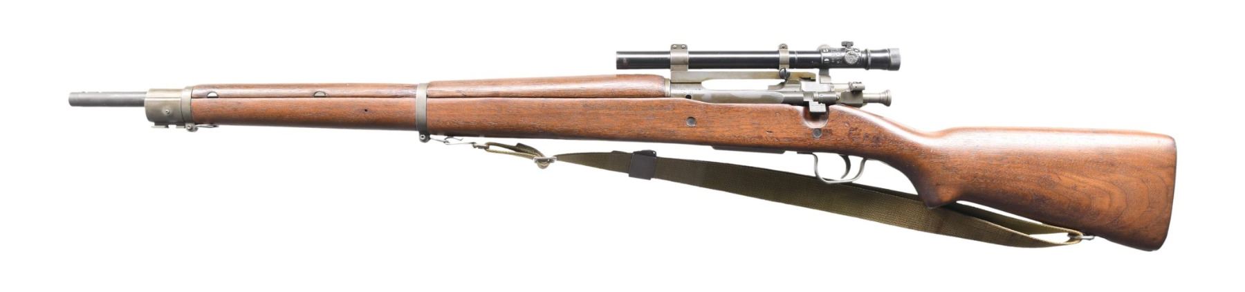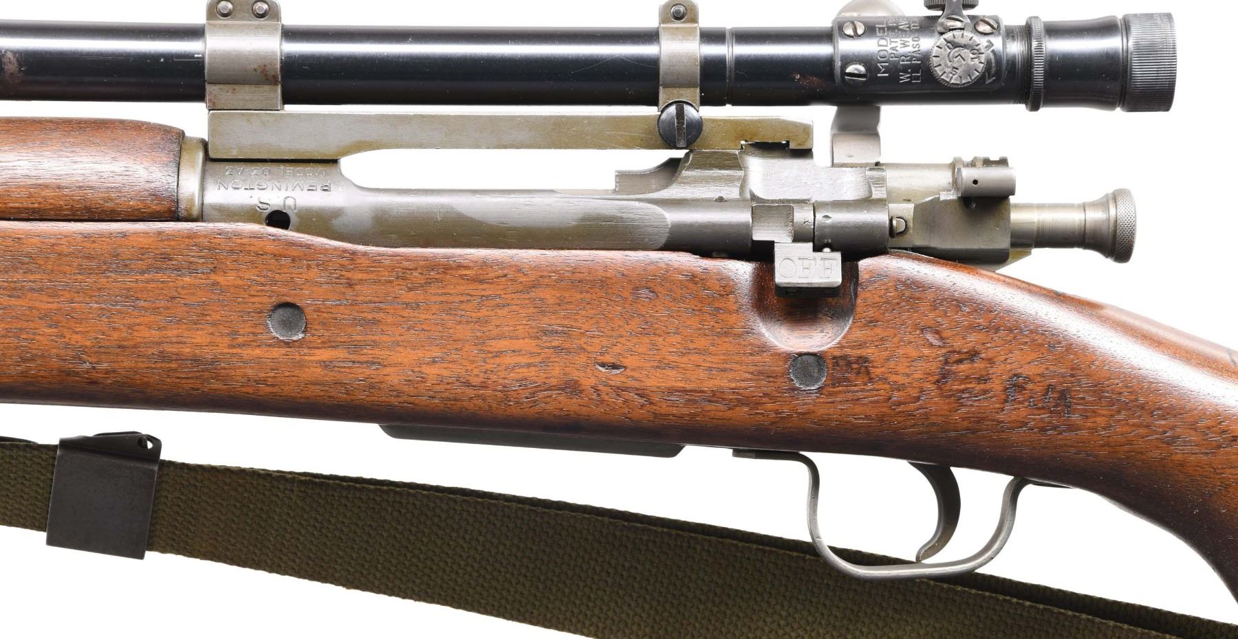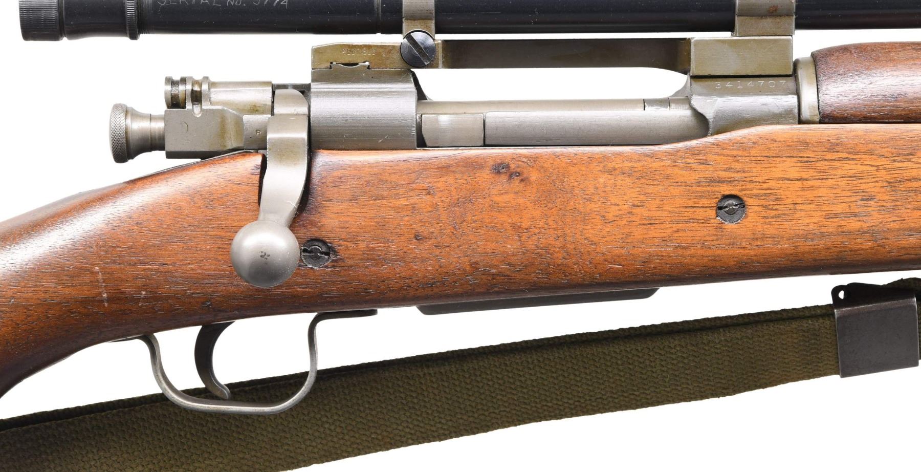 ACTION SNIPER RIFLE.. Cal. 30-06. S# 3414707. Bbl. 24". Marked near muzzle "RA / flaming bomb / 9 43". The rifle has the correct offset markings to accommodate the Redfield Jr. one piece scope base. The base carries a Weaver Model 330 3/4" tube 2.75 power telescopic sight with fine crosshair reticle. This telescopic sight has been given an electro pencil marking on the right side "TELESCOPE M73B1 / SERIAL NO 9774". The first 200 scopes assembled used this electro pencil marking as they were commercial production scopes. The bbl. was not fitted with a front sight which is a correct feature of these rifles. The scope base is marked "REDFIELD" on the right rear. The base is correctly tapered downward at the rear. Bolt has the correct handle to clear the scope and the relief cut in the stock and the bevel in the receiver for the bolt handle seat is correctly done. Walnut stock set with full pistol grip. Stock has 2 recoil bolts and is marked on the left side over trigger guard with faint "RA" cross cannons "FJA". The buttstock also has a boxed "RIA / EB" in the cheek area. Encircled "P" proof under grip and 5 assembly marks in front of trigger guard. All stamped furniture including large bow trigger guard has greenish parkerized finish. WWII vintage green web sling. UNATTACHED ACCESSORIES: nickel plated oiler in butt. CONDITION: rifle was given an arsenal rework finish on both wood and metal accounting for the Rock Island Arsenal marking. The edges of the cutoff recess and bolt handle clearance cut are softened but there is otherwise little loss of wood and the rifle has a visually attractive finish. The scope mount retains most of its gray green parkerizing. The scope tube retains a large degree of its original finish with sm. spots of missing finish and several small areas of light oxidation. Scope optics are slightly cloudy but appear serviceable. 2 Groove bore is shiny but edges of lands show moderate wear. PROVENANCE: from the Lifelong Collection of Jim Williams. (24-2707/RW). CURIO. $2,000-3,000.