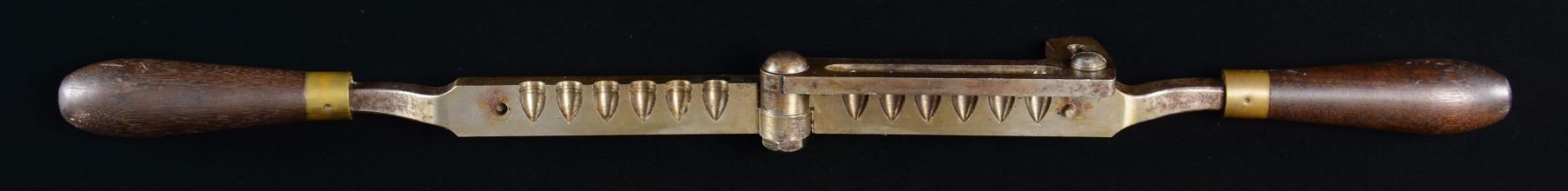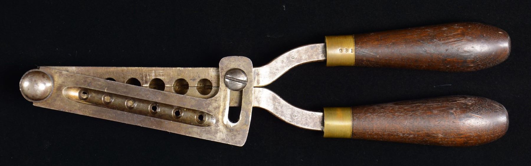 This is a very nice Colt military 6-cavity gang mold, stamped "44H" on right side. Each half has factory quality stamp, original wood handles with brass ferrules, numbered "221". Robin Rappley in his text on Colt percussion accouterments classifies as #M51. CONDITION: very good to fine overall. PROVENANCE: From the Collection of a Tennessee Gentleman. (02-23039/JS). NON-GUN. $800-1,500.