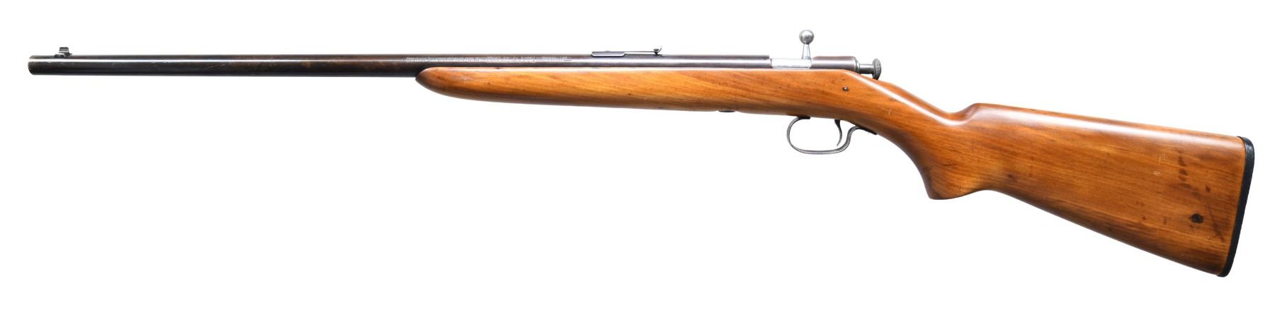 Cal. 22 S, L, LR. NSN. Bbl. 23" round w/ sporting sights. Single shot action. Gumwood stock w/ Winchester buttplate. Approx. 9,200 mfg. 1930-1931, making this the rarest of the Winchester bolt-action single shot Boy's rifles. CONDITION: 80% blue showing light fading to brown. Sanded & refinished stock. Very good bore. (25-723/DS). CURIO. $400-600.