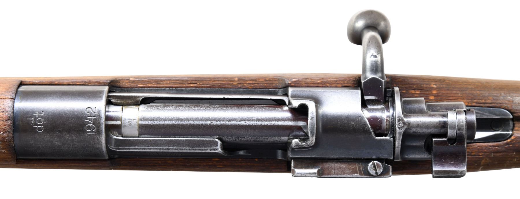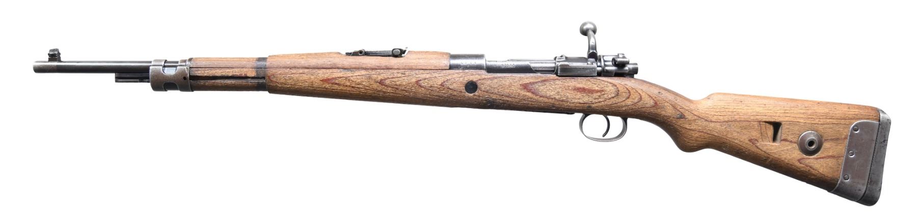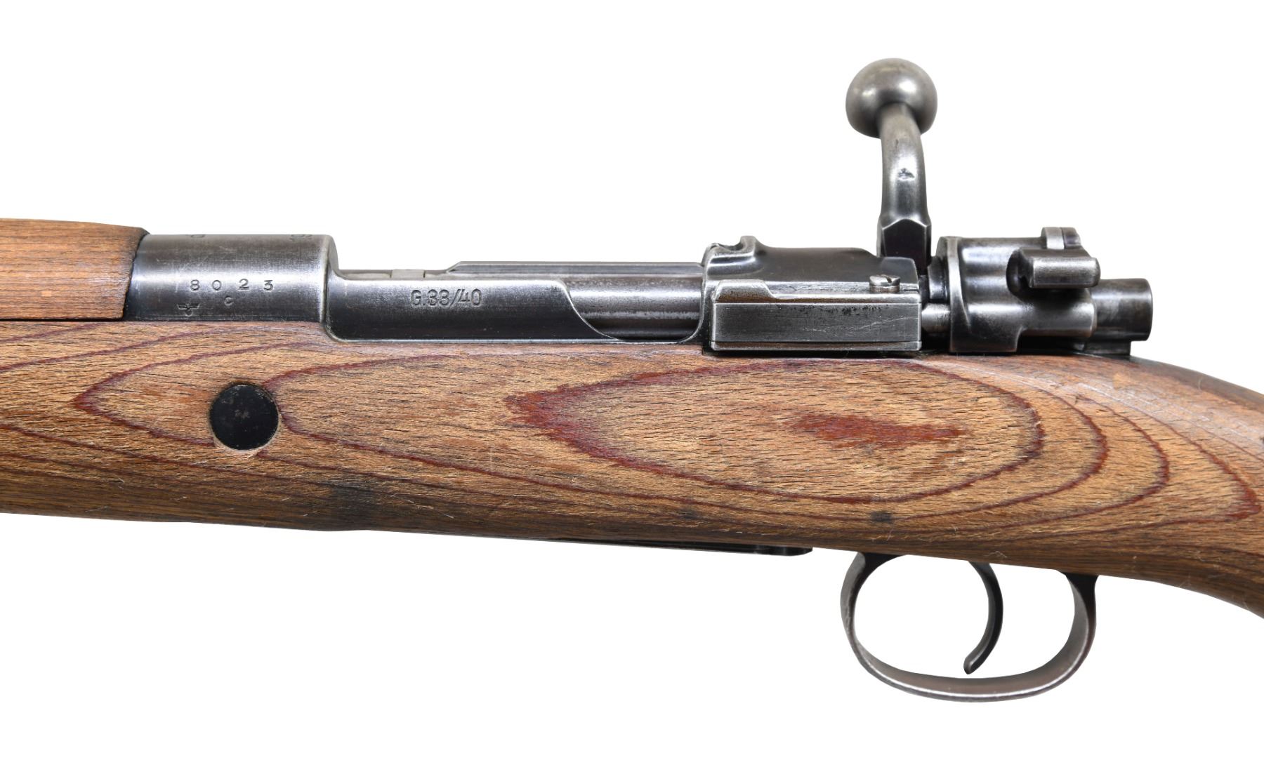 Cal. 8x57 (8mm Mauser). S# 8023c. Bbl. 19 1/4". Blade front sight without hood. Tangent rear sight graduated to 1000m. Mismatched numbers throughout but bolt body & stock are of correct G33/40 type. Receiver top has "dot 1942" marking denoting mfr. by Waffen Werke Brunn I in 1942. Blued finish. Laminated stock set with kick plate & left side sling provisions. Rear band, band spring & cleaning rod missing. CONDITION: stock set shows a few notable cracks on handguard, a few abrasions, scattered dings, flaking & handling marks. Metal retains 40% blue with overall fading to gray, the floorplate having a silvery-gray appearance, a couple small spots of light pitting, some scattered light dings, oxidation & edge wear. Action functions properly when hand cycled. Bore has scattered light pitting & oxidation but strong rifling. (25-474/MJC). CURIO. $2000-3000.