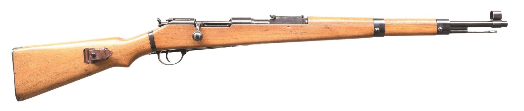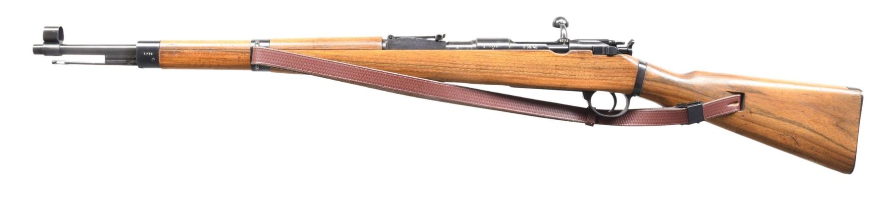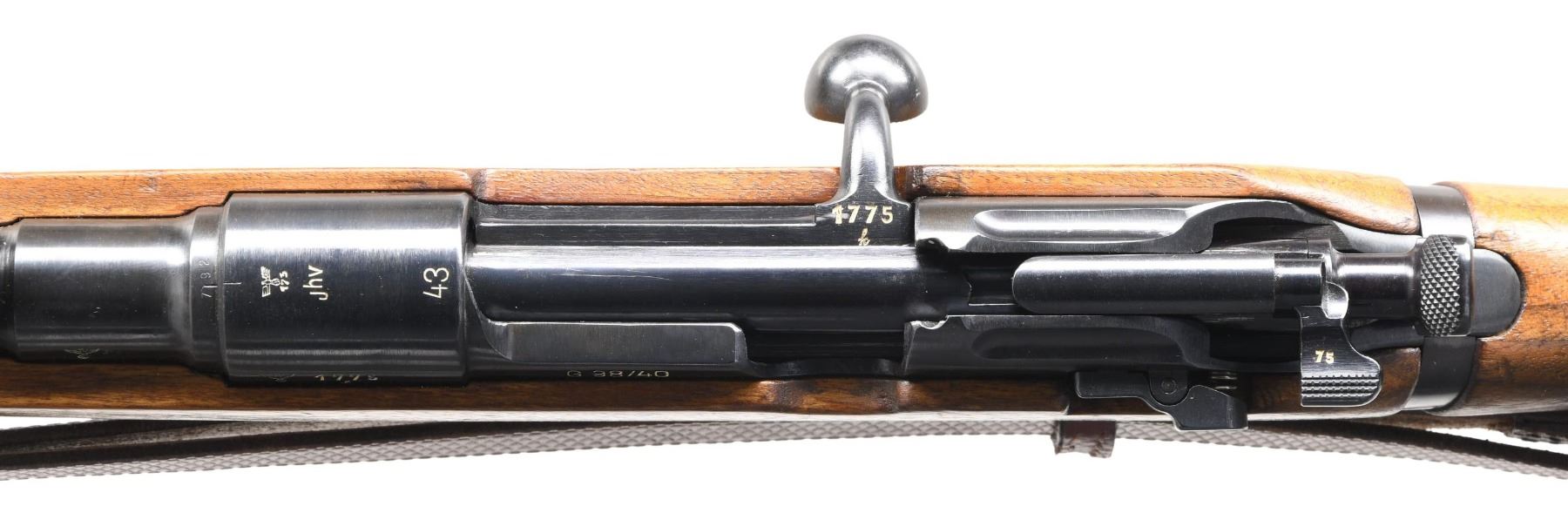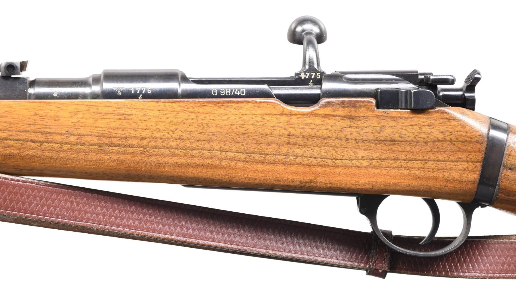 Cal. 8mm Mauser. S# 1775k. Bbl. 23 5/8". Blade front sight with K98k style hood. Tangent rear sight graduated to 2000m. Scarce Hungarian-made G98/40 rifle used by the Germans in WW2. Mismatched replacement cleaning rod, other visible matching numbers. Receiver top has WWII German eagle "173", "jhv" for FEG factory, and 43 date. Many markings have added white highlight paint. Blued finish. Walnut stock set with left side sling provisions and repro K98k sling. Stock has strong "jhv" and eagle "173" markings. CONDITION: stock set appears lightly cleaned with added oil finish, a few abrasions, scattered dings, and handling marks. Metal retains 95% of what appears to be a museum-grade reblue with some light fading and a couple areas of light pitting. Action functions properly when hand-cycled. Good, bright bore, with some light pitting and frosting but strong rifling. PROVENANCE: from the collection of Mark Ivey Godfrey. (24-5225/MJC). CURIO. $800-1,200.