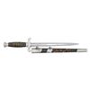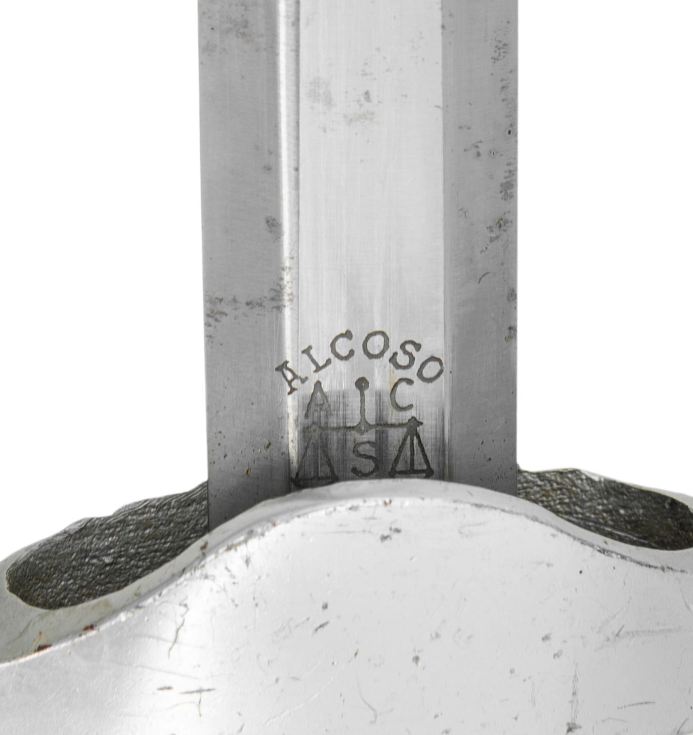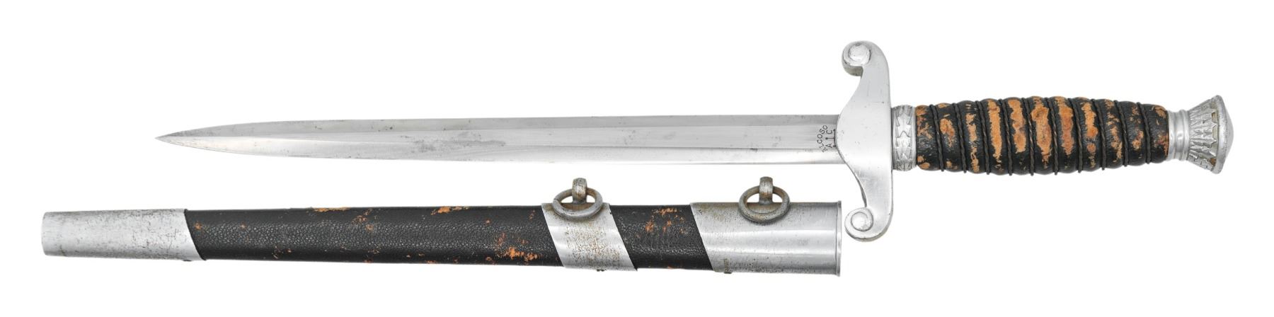 A rare example of a WWII German Land Customs dagger measuring 16 1/4" overall with a plain blade marked "ALCOSO (logo) SOLINGEN" on one side and "ALBERT KUHL, MUNSTER I/W. ESSEN" on the other. Aluminum Customs eagle cross guard with leaf decorated pommel and ferrule. Wire wrapped leather grip. Leather covered steel scabbard with plated steel mounts. CONDITION: blade shows ample factory polish but has a bit of very light staining. Crossguard has had the Party symbol removed after the war. Grip leather has a well worn finish but the wire is complete. The scabbard also shows wear to the leather with a roughly 1/2" loss of leather 4" up from the tip. Mounts are solid with minor oxidation. (02-25780/BF). NON-GUN. $1,000-1,600.