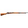 RIFLE. Cal. 6.5 Japanese. S# 2472 matches on receiver, extractor, trigger guard tang & bolt handle. Bbl. 31". Ladder rear sight graduated to 2400 meters. Inverted V front sight w/ protective ears. Adopted in 1937 the Type 97 Sniper rifle was slightly modified from the Standard Type 38 Infantry rifle. Equipped w/ a telescopic sight base on the left side of receiver, a longer turned down bolt handle & a lower bbl. band which is designed to accept a monopod which is not present on this rifle. The receiver has had the "mum" removed leaving the Type 97 characters. The receiver is marked on the left side with the Kokura interlocking circles & has the attached sliding scope mt. The telescopic sight is not present on this rifle. Bolt w/ turned down handle is equipped w/ a checkered notched safety knob. Bayonet lug is present. Cleaning rod is not present. Hardwood stock & handguard. Buttstock w/ typical 2 piece construction. Flat steel buttplate. CONDITION: original finish stock set has moderate wear w/ the extensive handling marks throughout commensurate w/ a military rifle which has seen long service. Grip has crack on right side from receiver tang curving forward toward the trigger approx. 2" long. Metal retains a large degree of its original blue finish w/ thinning & light wear. Trigger rear sight spring shows straw coloration. Follower shows original fire blue. Good shiny bore. (23-910/RW). CURIO. $1,200-1,500.