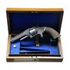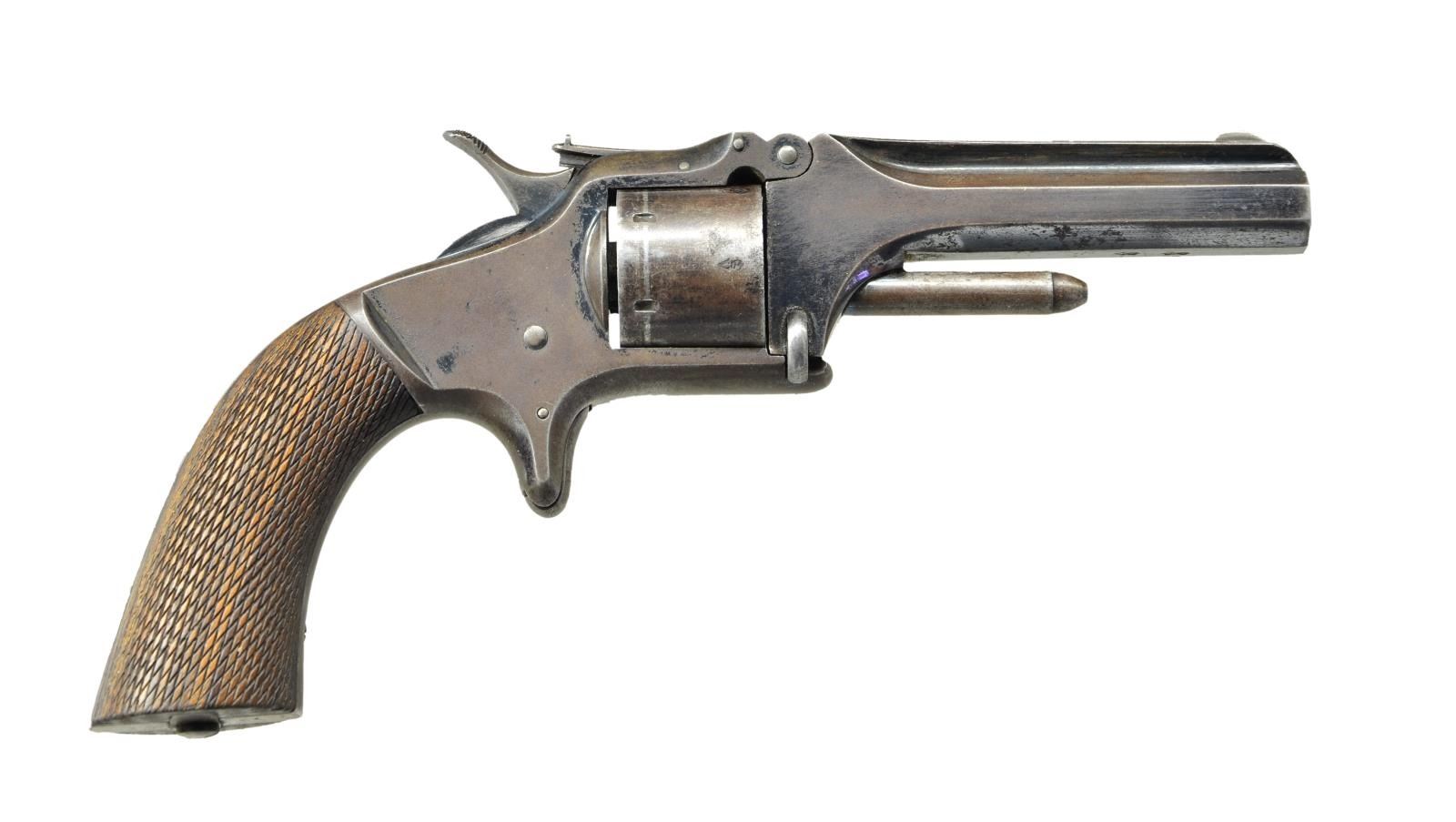 SMITH & WESSON REVOLVER WITH CASE. Cal. 32 RF. S# 1273. Most patent infringements were made in Belgium, this good quality revolver is British made and proofed. Top rib of 3 1/4" octagon barrel is engraved "C. Ingram, Glasgow". A small "V" blade rear sight is integral with bolt latch which sweeps up at rear. Hammer profile is lower than any original Smith & Wesson revolver. Unfluted cylinder is six shot. Fully checkered walnut grips are retained in British style with a transverse bar on bottom of grip frame. Frame itself is stamped with S#, as is barrel. Cylinder is unnumbered. UNATTACHED ACCESSORIES: this interesting revolver is house in what appeared to be its original fancy burl walnut veneered, mahogany case which is lined in blue cloth. No accessories are present, there is one covered compartment with bone knob. CONDITION: good to fine. Barrel retaining over 30% original bright blue. Frame has traces of blue showing were protected but is mostly brown. There are traces of blue on cylinder, hammer retains about half of its temper blue. Grips are good. Bore is good with some scattered pitting. Mechanically good. Case is fine with most of its original exterior finish, interior cloth is quite good with some rubs. (01-22737/MGM). ANTIQUE. $1,000-2,000.