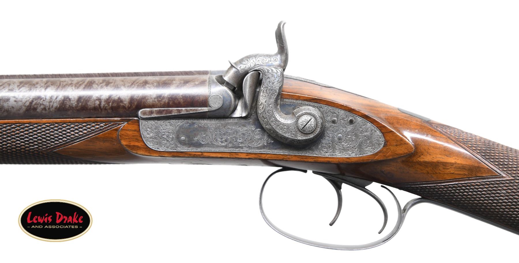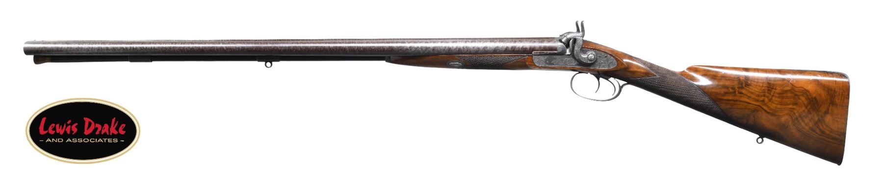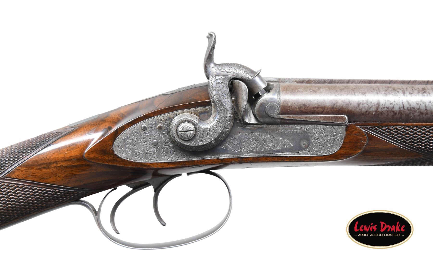 FINE ORIGINAL CONDITION. Cal. 14 Bore. S# NSN. Hugh Lumsden Snowie is listed at 83 Church St. Inverness in 1874. This well built gun most likely dates from 15 years before that time. It has 29" barrels made of intricate skelp damascus. Broad top rib is engraved with maker's name and address. Breech plugs are well filed and have unvented platinum blowouts. Bottoms of barrels are stamped with London black powder proofs for "15" bore. Breech iron is nearly fully scroll engraved. Front spring locks are fitted with serpentine hammers and are engraved with very well cut shaded scroll. "H. Snowie" is at the front of each lockplate. Trigger plate has scroll engraved stylized pineapple finial. Trigger guard is engraved with open scroll. Stock of very attractive well marbled and lightly figured European walnut measures 14-1/4" over steel buttplate with scroll engraved long top tang. Stock attaches to barrels with captive side bolt and is checkered at grip and forend. A vacant silver oval is at top of grip. Ebony ramrod with brass tip and tail (worm under cap) mounts through two plain pipes and pineapple thimble. MEASUREMENTS: DAH: 2-1/16". DAC: 1-9/16". CAST: neutral. LOP: 14-1/4". WEIGHT: 7 lb. 0 oz. CONDITION: exceptionally fine. Barrels retaining over 90% original brown which shows off distictive damascus pattern. Nearly all color case hardening remains on locks. Trigger guard and buttplate retain most of their original blue. Stock retains most of its French polish original finish with a goodly amount of marks and scratches most of which are at rear of butt. Bores are bright and shiny. Locks are crisp. A very handsome shotgun. PROVENANCE: from the renowned collection of quality sporting arms from Lewis Drake together with inventory of Lewis Drake Associates. (01-26118/MGM). ANTIQUE. $3,000-5,000.