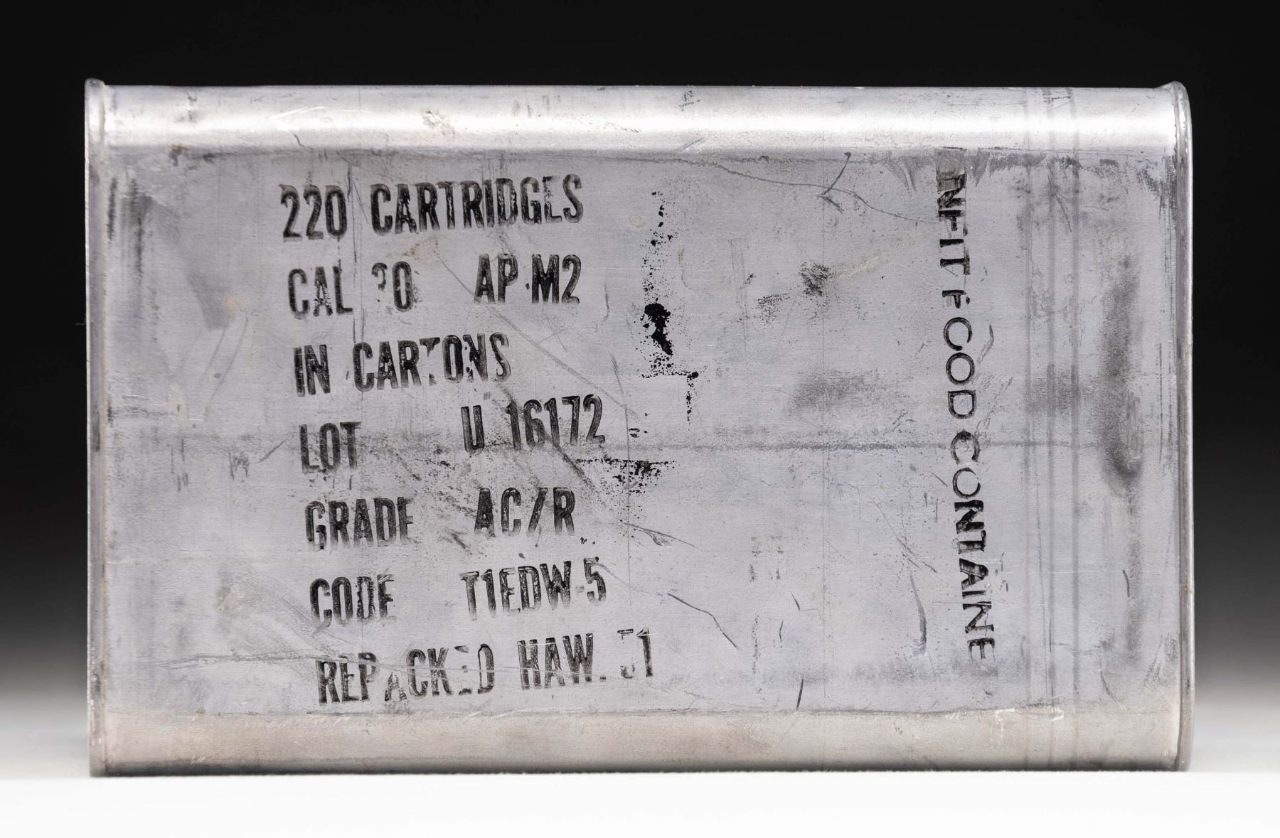 Sealed 220-rd. M10 can of .30-06 M2 AP ammunition. Side of can is marked "220 CARTRIDGES/ CAL 30 AP M2/ IN CARTONS/ LOT U16172/ GRADE AC/R/ CODE T1EDW-5/ REPACKED HAW. 51". Can retains opener on rear. CONDITION: can remains sealed, exhibiting scattered handling marks, with areas / patches of oxidation present on one of the ends. PROVENANCE: Norman Olliff Estate. (02-25689/MLW). AMMO. $100-200.