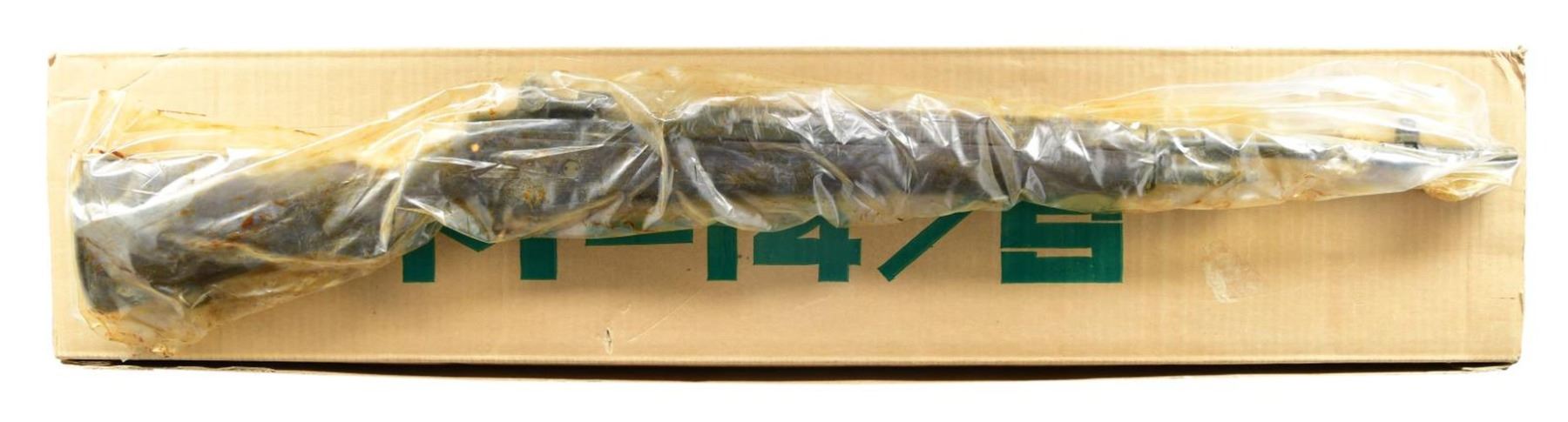 WITH FACTORY BOX. Cal. 308 Win. S# 14627. Bbl. 21 1/2". Model M14S semi-automatic rifle, mfg. in China by Polytech and imported by IOE. Left side of the receiver is marked with the model and cal. designations above IOE's importer information, followed by the S# and "MADE IN/ CHINA". Metal components exhibit a parkerized finish overall. Plain wood pistol grip buttstock with brown plastic handguard. Standard M14 pattern blade front sight and aperture rear sight, with bird cage flash hider. MAGS: two sealed 5-rd. mags. and one sealed 20-rd. mag. UNATTACHED ACCESSORIES: original Polytech box matching in sharpie and containing mags., as well as a green canvas web sling. CONDITION: virtually new, with the rifle still being sealed in its original plastic factory packaging, exhibiting protective grease overall. Bore condition cannot be verified but is presumed to be near new, like the rest of the rifle. Wood and plastic furniture are excellent overall. Box shows some light exterior wear but otherwise remains sturdy and serviceable. PROVENANCE: the lifelong collection of Terrence McCarty. (24-316/MLW). MODERN. $1,200-1,800.