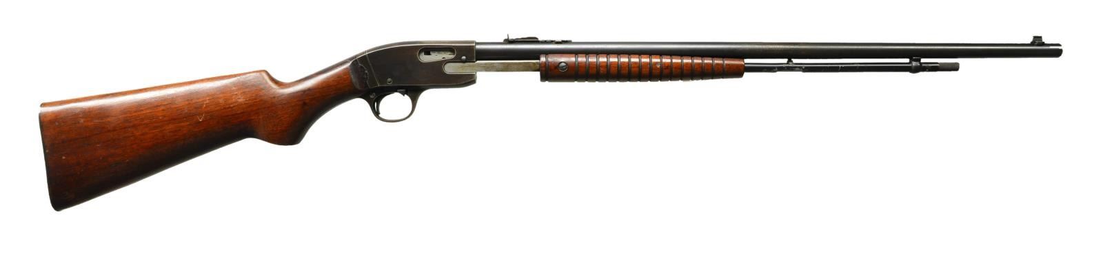 Cal. 22 S, L & LR. S# 32373K. Bbl. 24" rnd. Adj. elevator rear sight. Gold bead front sight. Upper tang has two vacant screw holes. Tubular mag. Pistol grip walnut stock w/ smooth buttplate. Grooved forend. CONDITION: stock set has varnish w/ some flaking, scattered dings & handling marks. Top & left side of receiver both show a large cleaned area w/ some scratches. Metal otherwise retains 40% original blue w/ overall fading to gray, operational wear, some flaking on mag tube & scattered oxidation. Good bore. (22-6214/MJC). CURIO. $250-350.