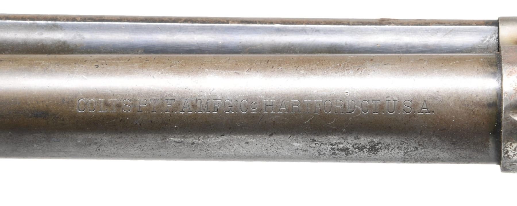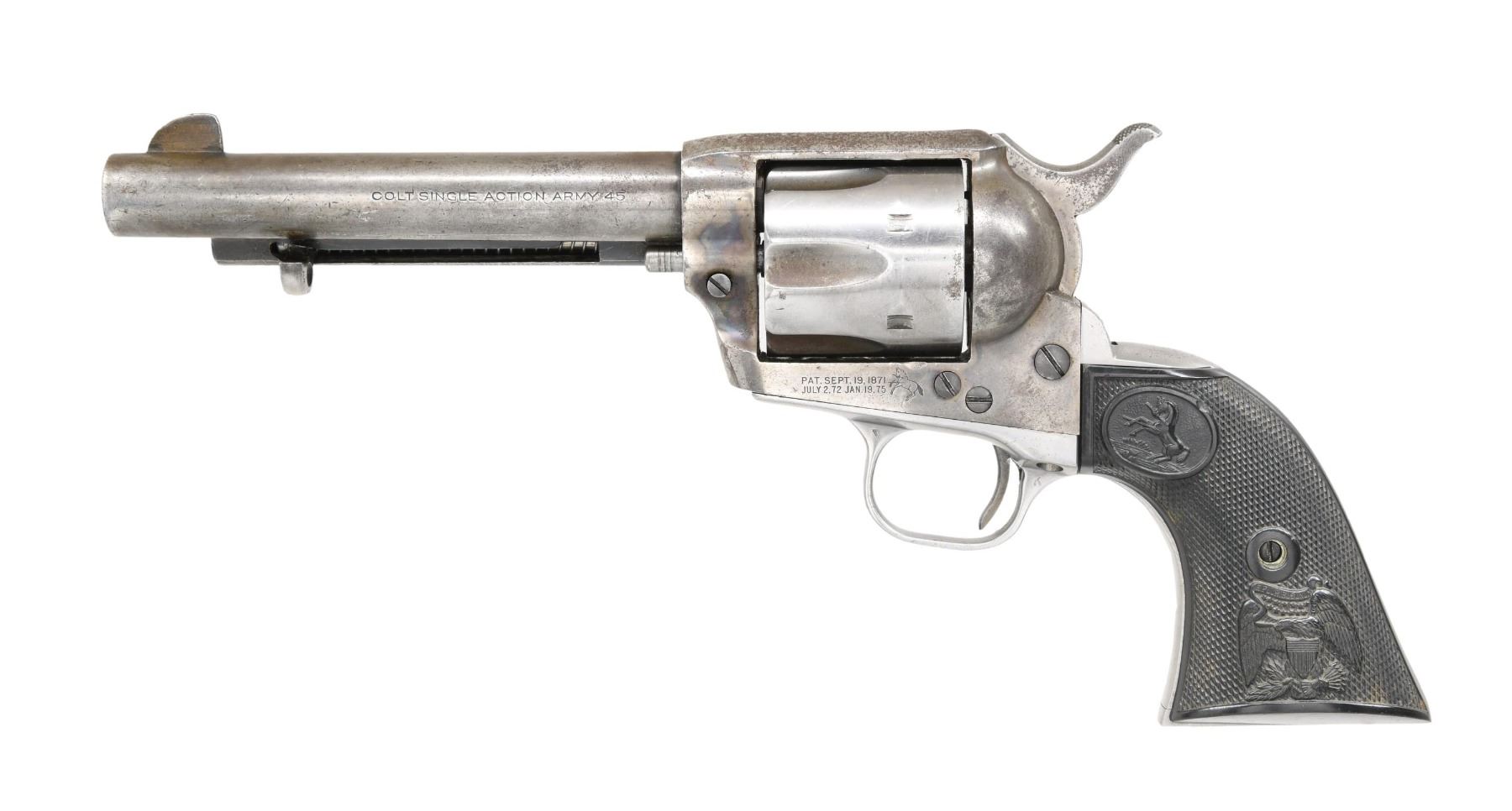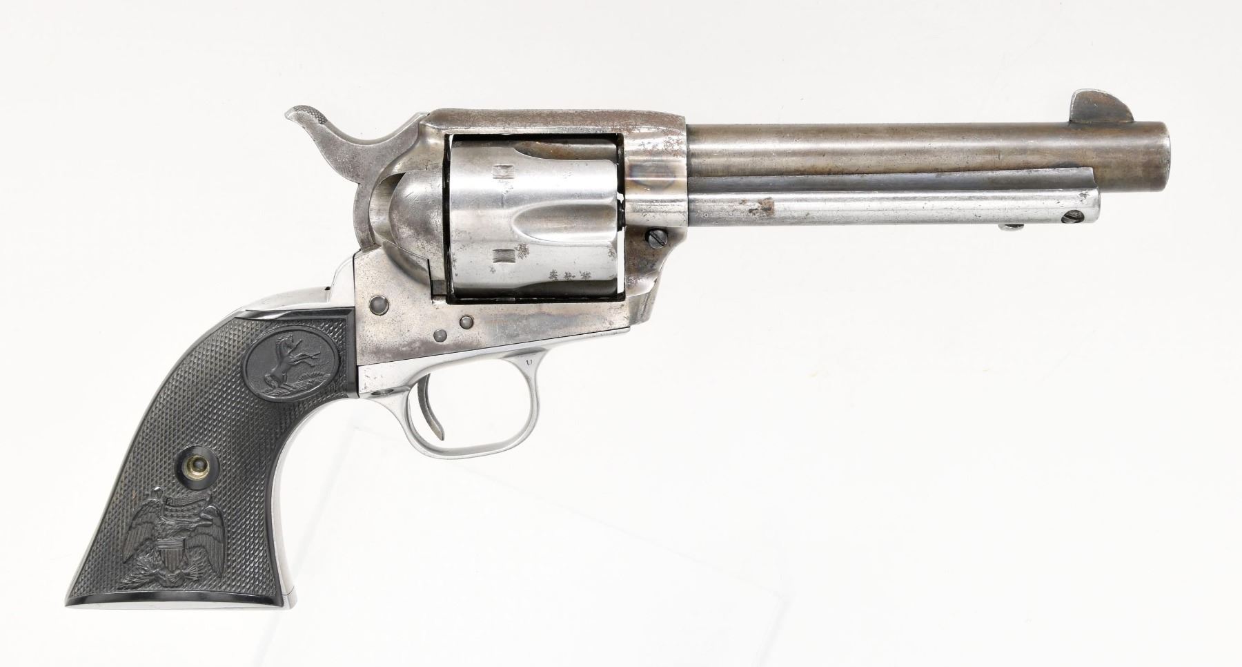 REVOLVER. Cal. 45 Colt. S# 28727SA. Bbl. 5 1/2". Second Generation Single Action Army revolver mfg. by Colt in 1960. Left side of the bbl. is marked "COLT SINGLE ACTION ARMY .45", with Colt's single line address marked across the top. Left side of the frame is marked with Colt's 2-line patent information, closely followed by the Rampant Colt logo. Frame exhibits a case-color-hardened finish, with the ejector rod housing exhibiting a blue finish. Frame is mounted with 2-piece Colt checkered black plastic grips. No matching S#s are present. S#s on the left side of the trigger guard and rear grip strap have been crossed out. Cyl. is unmarked. Frame and loading gate exhibit matching assembly numbers. Cyl. base pin is a replacement. CONDITION: frame retains trace to fair amounts of its factory case color hardened finish, with the balance exhibiting fading to gray patina with light to mild surface oxidation overall. Ejector rod housing retains fair amounts of its factory blue finish, with the bbl. retaining traces of its factory blue finish. Trigger guard and grip strap have been heavily cleaned and are in-the-white. Bright bore, exhibiting some pitting and oxidation while retaining strong rifling throughout. Grips exhibit some superficial marks and a few chips from handling and storage, but otherwise remain sturdy and serviceable. PROVENANCE: from the Martin Lane Historic & Western Americana Lifetime Collection. (24-2413/MLW). CURIO. $800-1,200.