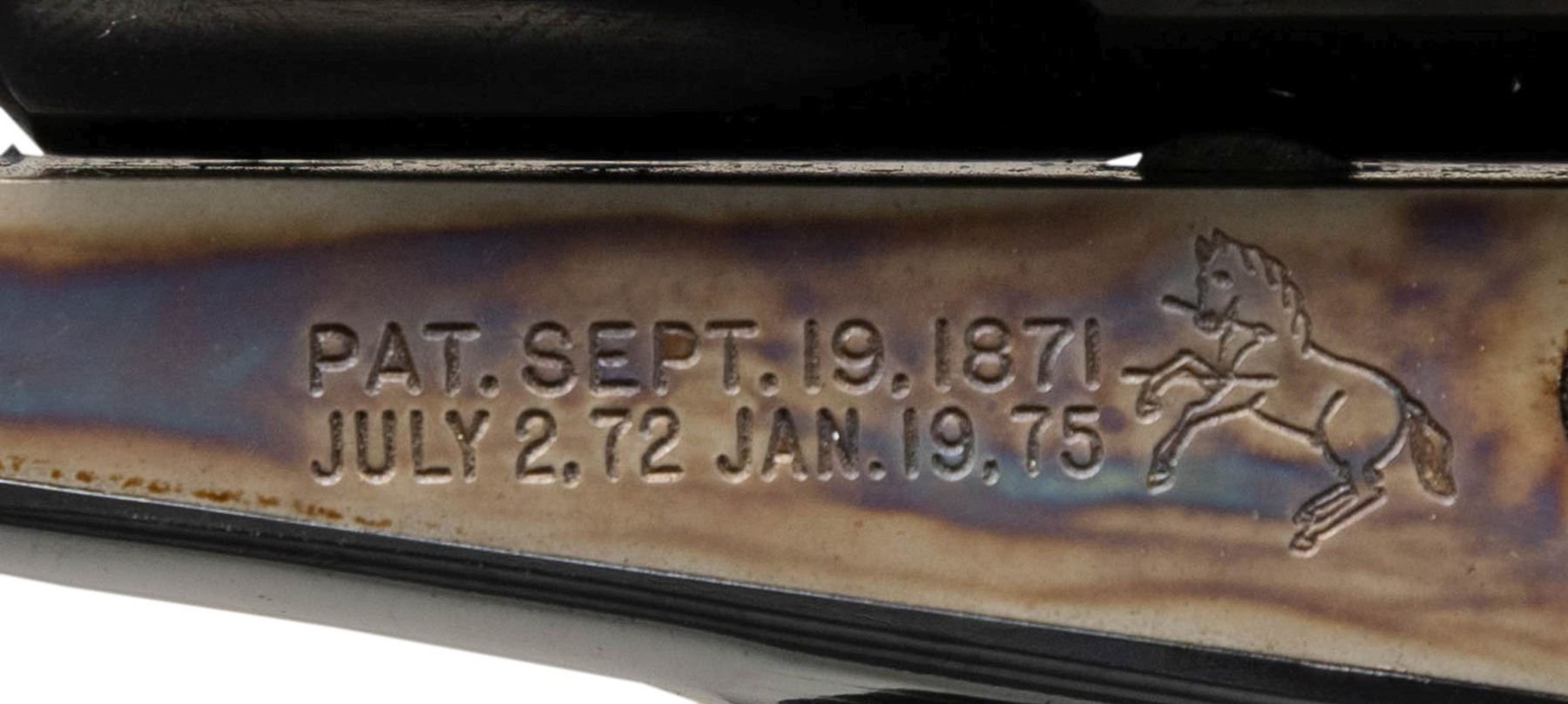 REVOLVER. Cal. 45 (45 Colt). S# 24633SA. Bbl. 4 3/4". Second Generation Single Action Army revolver mfg. by Colt in 1959. Left side of the bbl. is marked "COLT SINGLE ACTION ARMY" followed by what appears to be a poorly stamped ".45", with Colt's single line address marked across the top. Left side of the frame is marked with Colt's 2-line patent information, followed by the Rampant Colt logo. Frame, loading gate, and hammer exhibit a case colored finish, with remaining metal components exhibiting a blue finish. Bbl. has been refinished at one time. Frame is mounted with Colt 2-piece checkered brown synthetic grips. Standard SAA pattern blade front sight and frame notched rear sight. All serialized parts are matching and include the frame, cyl., as well as the trigger guard and rear grip strap (beneath left grip panel). Grips are matching via a handwritten "633" on the interior of the panels. Matching assembly # "474" is present on the frame and loading gate. CONDITION: frame, loading gate, and hammer retain the majority of their original case colored finish, showing some spots of fading, as well as some spots of light surface oxidation and age related discoloration overall. Blued parts are excellent, with some scattered small superficial handling marks. Mirror bore, exhibiting a few scattered spots of light surface oxidation, while retaining well defined rifling throughout. Proper manual mechanics, with tight lock up. Grips are very good overall, with a few superficial handling marks. (25-5773/MLW). CURIO. $2,500-3,500.