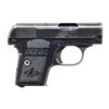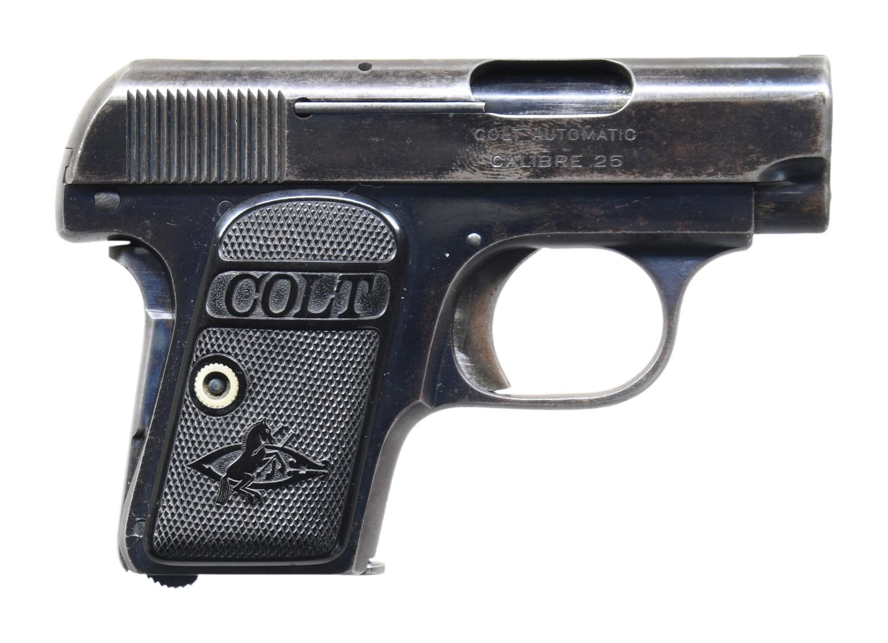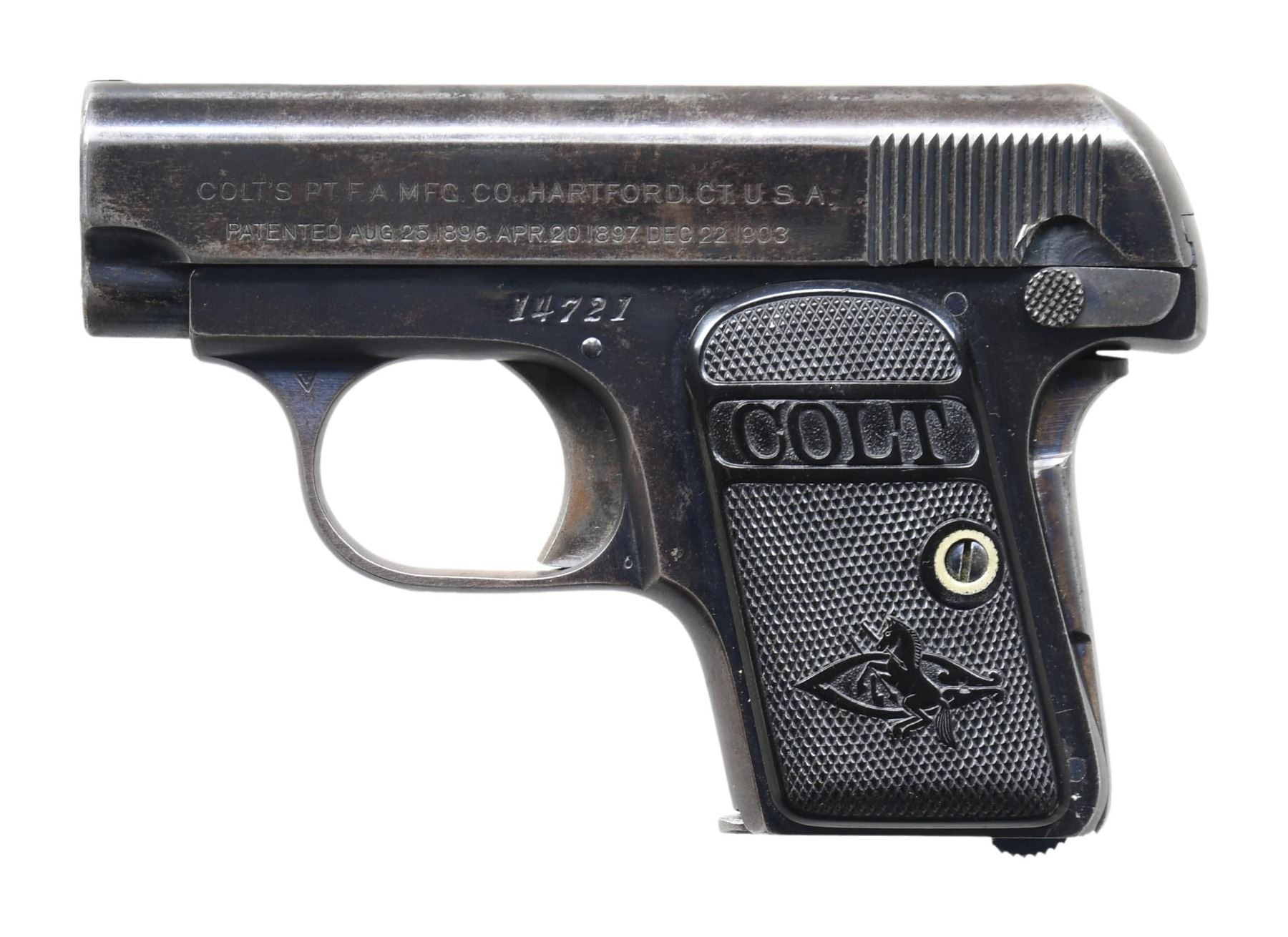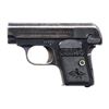 SEMI-AUTOMATIC PISTOL. Cal. 25 ACP. S# 14721. Bbl. 2". Hammerless action with grip safety. Blue finish. 2-piece checkered hard rubber grips. Mfg. in 1909, second year of production. MAGS: 1 detachable 6-rd. mag. CONDITION: 60% dull blue, showing areas fading to gray. Trigger has traces of case colors. Grips show light wear. Sound action. Bore retains strong rifling. (25-2686/DS). CURIO. $300-500.