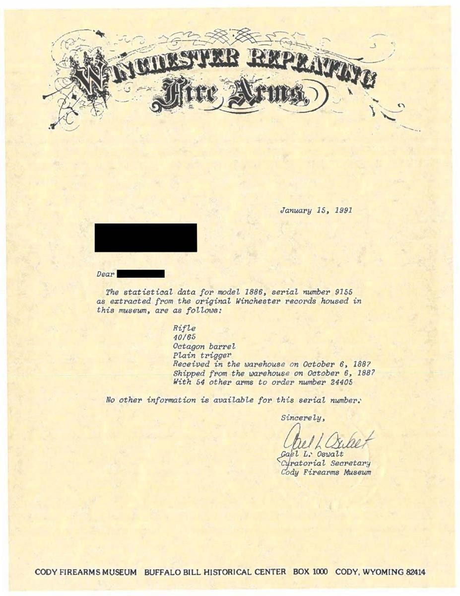 LEVER ACTION RIFLE WITH CODY LETTER. Cal. 40-65. S# 9155. Bbl. 26". Model 1886 lever action rifle mfg. by Winchester in 1887. Top flat of the octagonal bbl. is marked "-MANUFACTURED BY THE-/ -WINCHESTER REPEATING ARMS CO. NEW HAVEN. CONN. U.S.A.-", with the cal. designation stamped at the breech. Upper receiver tang is marked with the model designation, with the lower tang being stamped with patent information. Metal components exhibit a blue finish. Plain American walnut straight grip buttstock with crescent buttplate and smooth wood handguard. Buttstock and handguard have been revarnished at one time. Front sight has been replaced with a Lyman blade front sight (bead no longer present), with an unmarked aftermarket V-notch rear sight. UNATTACHED ACCESSORIES: Cody Firearms Museum letter indicating that this example was received in the warehouse on October 6th of 1887 and was shipped with 54 other arms (Order Number: 24405) that same day. CONDITION: receiver, lever, buttplate, and forend cap exhibiting a mottled gray patina, with scattered areas of light to moderate pitting present overall. Bbl. and mag. tube exhibit wear and thinning overall, with areas of wear showing through to a pleasant brown patina. Bright bore, exhibiting moderate pitting and retaining good rifling throughout. Wood furniture exhibits scattered marks, dings, and impressions from handling and storage, but otherwise remains sturdy and serviceable. (01-25218/MLW). ANTIQUE. $2,500-3,500.