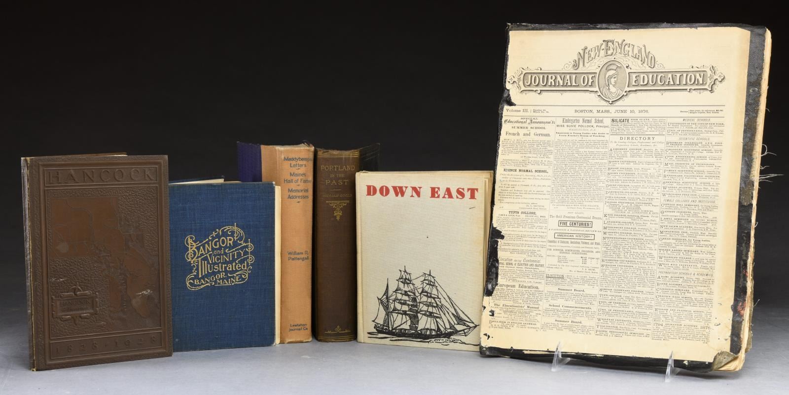NEW ENGLAND. Late 19th, early 20th century. "Bangor and Vicinity Illustrated Bangor, Maine", circa 1890; "Portland in the Past" by William Goold, copyright 1886; "The Meddybemps Letters Reproduced from The Machias Union of 1903-1904 and Maine's Hall of Fame Reproduced 1909-1910", copyright 1904; "Down East" by Lewis Pendleton, copyright 1937, Harcourt, Brace and Company, Inc.; "Hancock 1828-1928" by Alfred B. Crabtree and Hattie B. Martin, published by Kennebec Journal Company circa 1928; "New England Journal of Education" soft leather binding, Index to Volumes III & IV. CONDITION: one book is poor, the remaining are fair to good. (05-399-3/TG). $50-100.