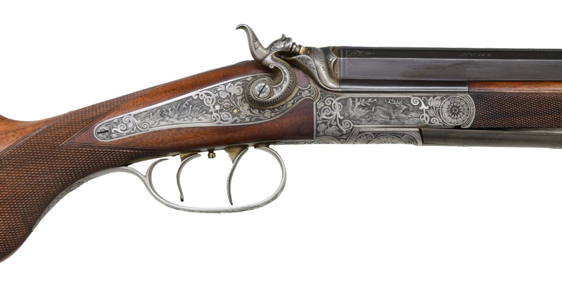 Cal. 20 Ga. S# 4615. This pre World War II shotgun has similar profile to the "stalking rifles" of the time with a 27 5/8" barrel with 7" octagon breech section. Matte top rib has German silver blade front sight. Bottom of barrel has swivel & German Nitro proofs. Coin finished underlever action with elaborate floral scroll & woodland scene engraving featuring pigeons on right hammer plate, elk on right side of action, doe on trigger guard bow & hares on left side. Underlever is made of horn. Double set triggers; rear is set. Checkered walnut forearm with tip acting as retaining latch. Round knob pistol grip walnut stock with sling swivel on toeline, & cheekpiece on left side. LOP: 13" terminates to horn buttplate. WEIGHT: 4 lbs., 1.5 oz. CONDITION: very good barrel blue showing scattered areas of worn finish & scratches. Very good coin finish. Horn lever has large separation crack extending from forearm; lever sits proud from forearm. Good wood finish showing large area of worn finish on buttstock, several gouges in the checkering & scattered impressions. Shiny bore with light pitting near muzzle. (24-1817/MD). CURIO. $2,500-4,000.