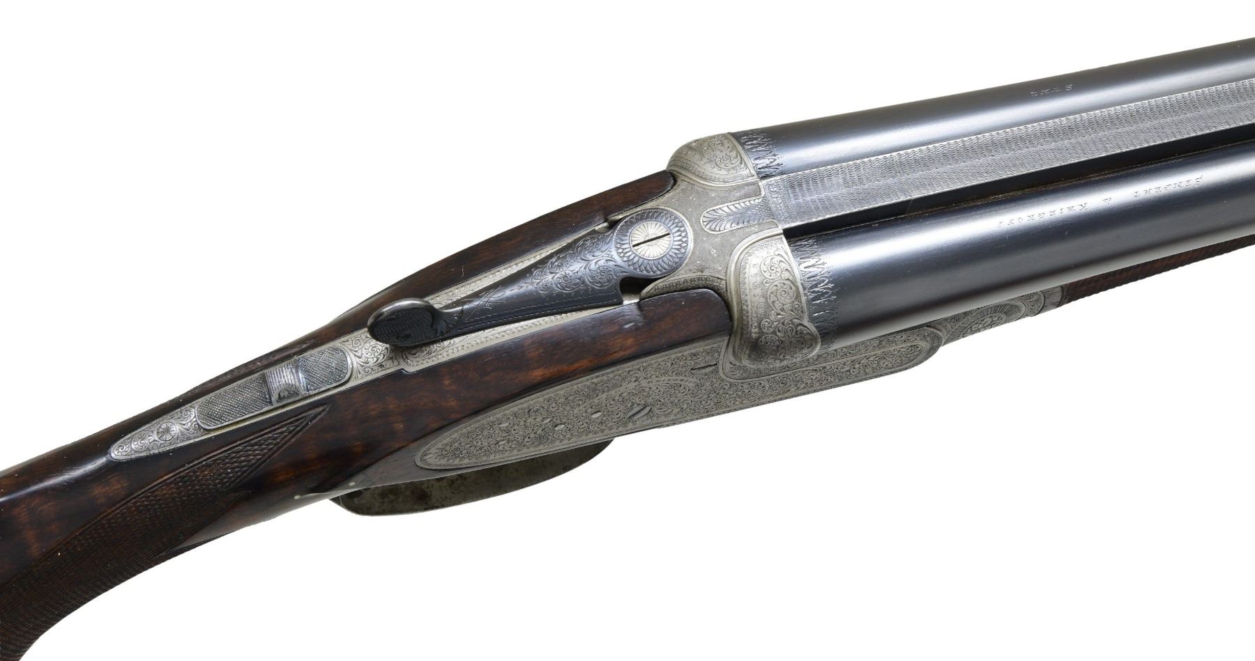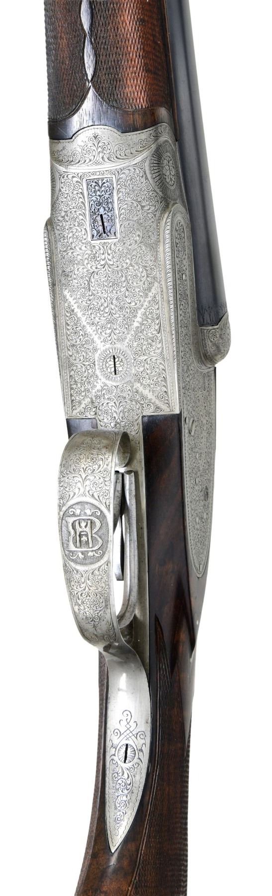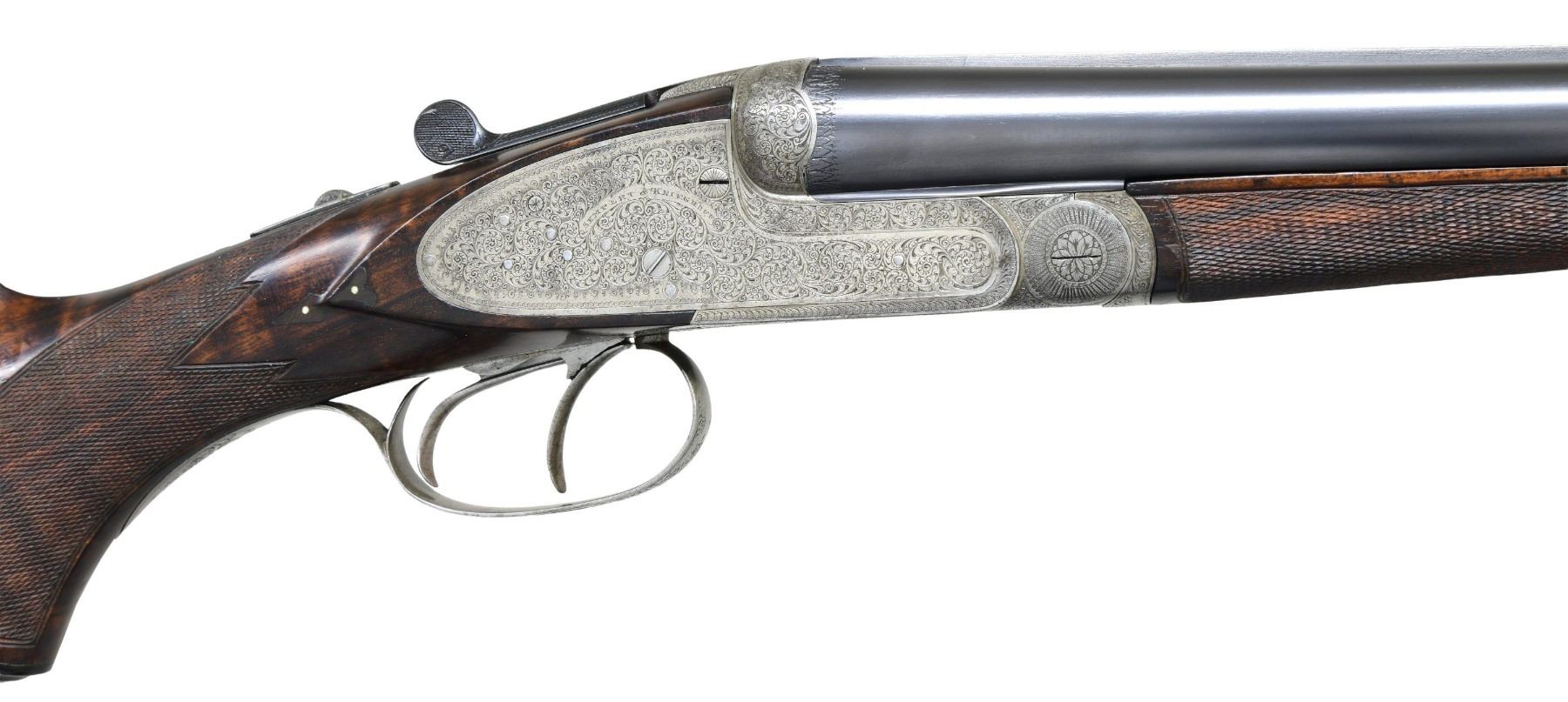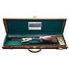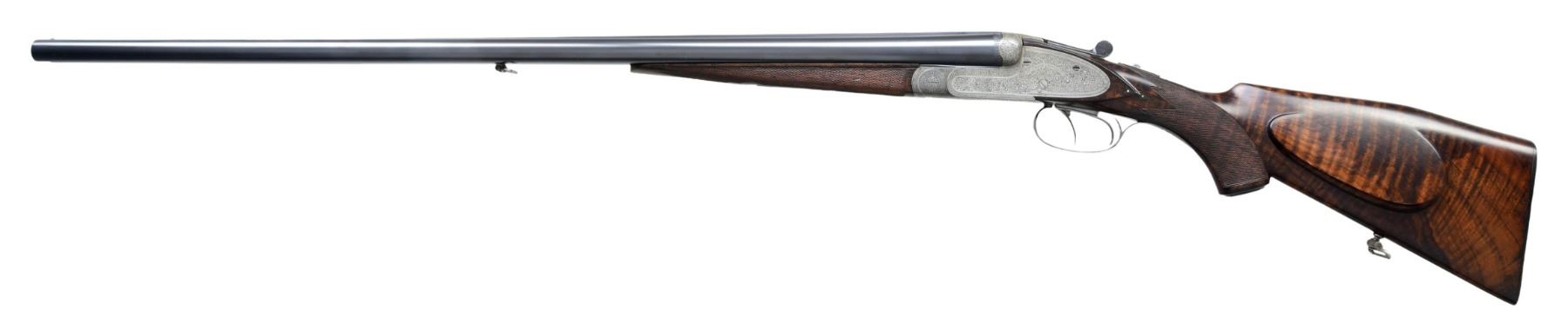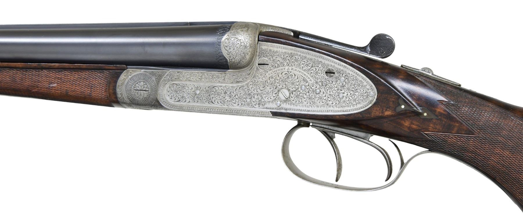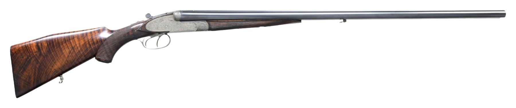 SHOTGUN. Cal. 16 ga. 2 9/16". S# 9570. Bbls. 29 1/2" w/ steel bead & nitro proofs. Sidelock action has full coverage of arabesque scroll engraving. Features include double underlug & crossbolt locking w/ side clips & cocking indicators. Selective ejectors. Double triggers, front trigger is articulated. Ebony tipped splinter forearm & Monte Carlo cheekpiece pistol grip stock & horn grip cap. LOP: 13 5/16" over grooved horn buttplate. DAC: 1 5/8". Drop at Monte Carlo: 2 1/4". DAH: 3 3/8". Bore diameter: R .670 L .669. Choke constriction: R .028 L .045. Minimum wall thickness: R .031 L .030. WEIGHT: 6 lbs, 14.2 oz. UNATTACHED ACCESSORIES: leather covered case w/ green fitted interior has added Sempert & Krieghoff label. Case contains 2 piece cleaning rod, snap caps, brass accessory bottle, oil bottle & cleaning accessories. Also included is a Sempert & Krieghoff catalogue reprint. Copy of "The Journal of the German Gun Collectors Association" no. 14 summer 2002 w/ an article titled "Krieghoff Guns, Now And Then". CONDITION: bbls. retain 95% blue. Action finish has faded to gray. Stocks have good finish & checkering showing a few small marks. Action is tight & on face w/ top lever sitting at center. Very good bright bores. (24-2172/DS). CURIO. $4,500-6,500.