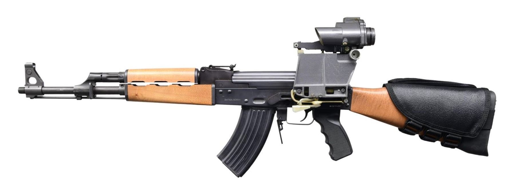 SCOPE. Cal. 7.62x39. S# N-PAP004367. Bbl. 16.5". Dark black finish on exposed metal surfaces. Stamped receiver. Threaded muzzle. Onboard cleaning rod. Protected post front sight. Elevation adjustable rear tangent sight marked from 100 meters to 1000 meters. Blond hardwood forend & shoulder stock. Black plastic checkered pistol grip. Left side receiver scope rail currently sporting Russian 1P29 4x35 scope. Safety / selector on right side possesses notch to engage charging handle and hold bolt to the rear. M48 Ops black nylon cheek pad on stock w/ recoil pad. Mag release extension. MAGS: 3 steel 30 rd. UNATTACHED ACCESSORIES: Black nylon woodland camoflauge carry bag, factory cardboard box. CONDITION: Original finish complete & consistent w/ some thinning on high spots. Bright bore w/ strong rifling. Fire control mechanism appears to function correctly when cycled by hand. PROVENANCE: From the Working Reference Collection of Military Arms Instructor, Master Sergeant Vincent Pestilli. (23-7556/JZ). MODERN. $600-1,000.