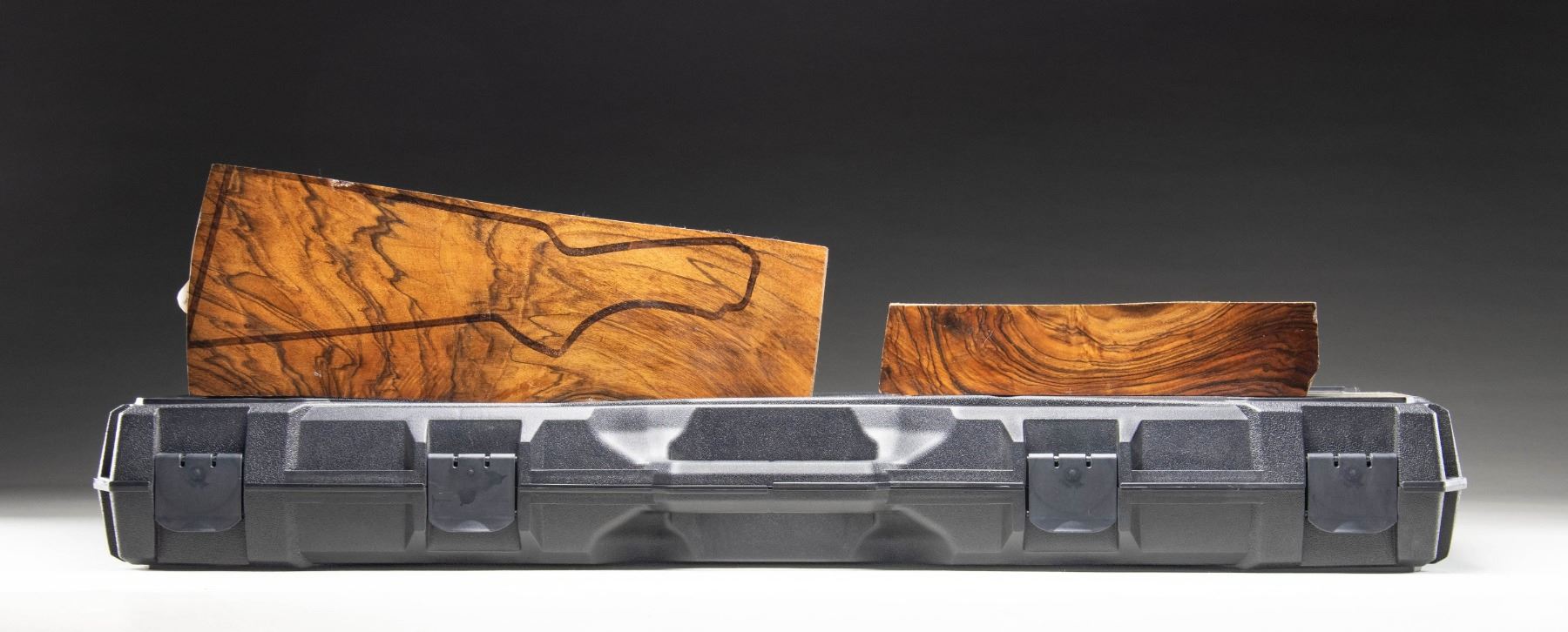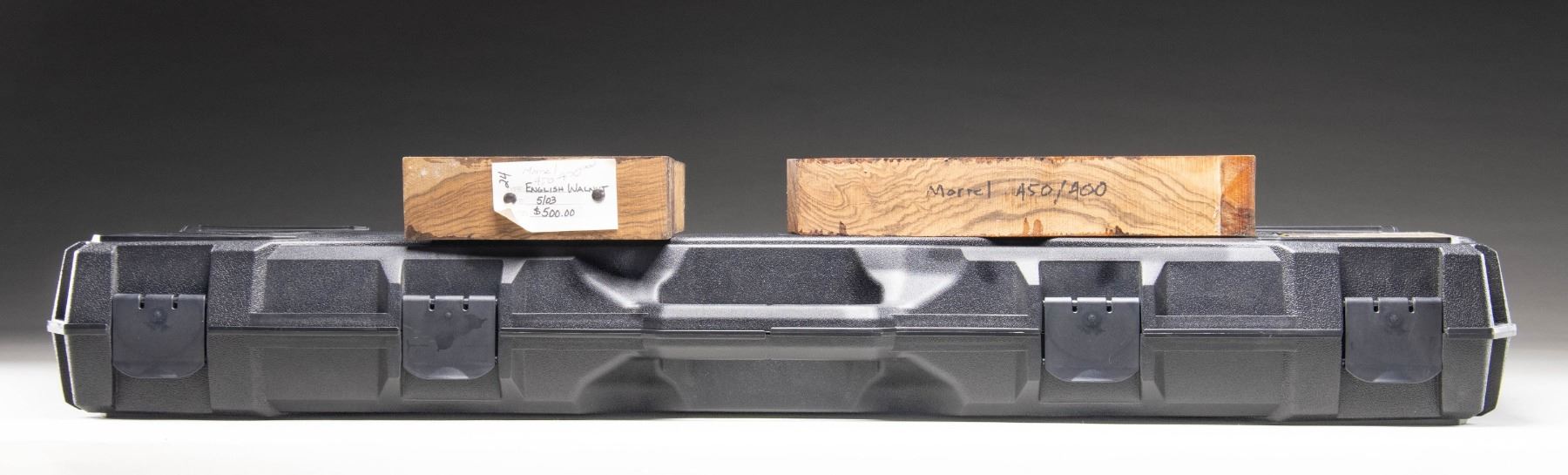 Set of English Walnut blanks consisting of: 1) x1 buttstock blank. Blank measures: Length: 20 1/4, Width: 7 1/4" (widest point), Thickness: 2 5/16". Blank is stenciled with the outline of a pistol grip buttstock in black ink on either side. One edge of the blank is tacked with a label that reads "TYPE: ENGLISH WALNUT/ Date: 5/03/ PRICE: $500.00". 2) x1 forearm blank. Blank measures: Length: 13 5/8", Width: 2 7/8", Thickness: 2 3/8". UNATTACHED ACCESSORIES: generic black polymer hard case. CONDITION: blanks are very good, with some light superficial handling marks. (02-24222/MLW). NON-GUN. $250-500.