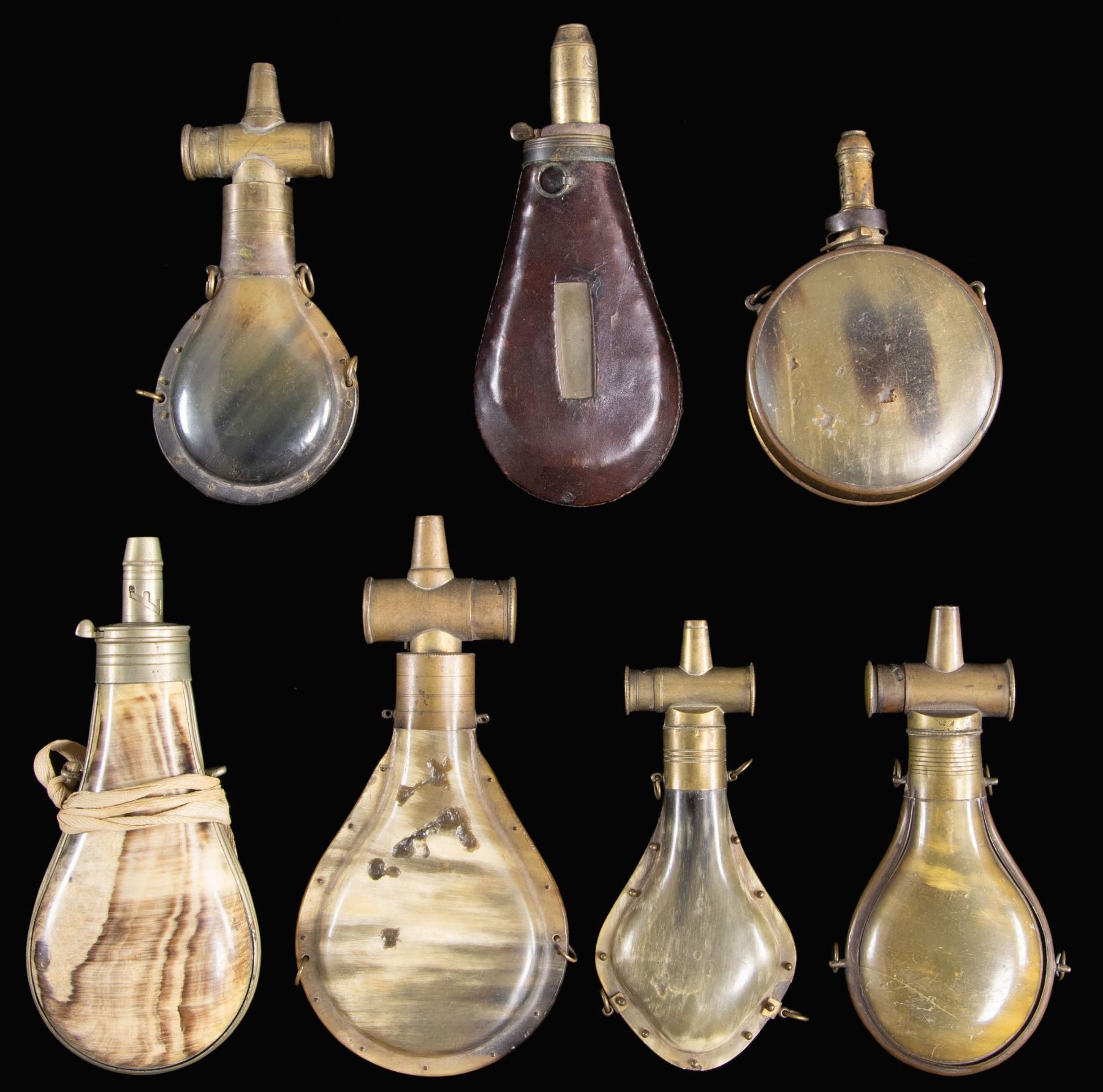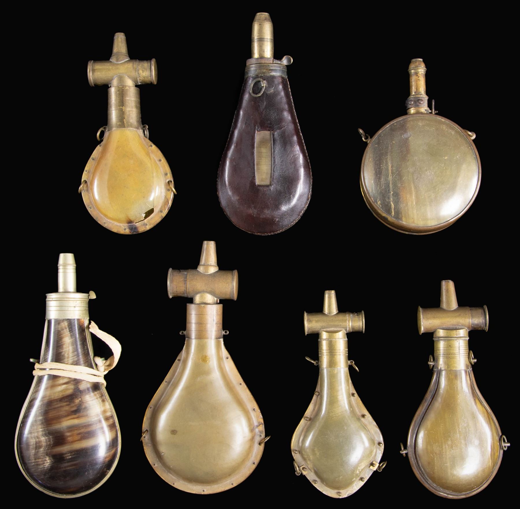 HORNS. Four have the early cylindrical chargers often associated with Paterson shotguns & rifles, 6.5" to 8". 7" leather covered with cut-out windows to see powder levels, 8" white metal bounded, 4" round. CONDITION: 2 with insect damage, 7" Paterson style has break out on one side, charger stamped "2". PROVENANCE: The Esteemed Norm Greenberg Collection. (02-24848-24/JS). NON-GUN. $800-1,200.