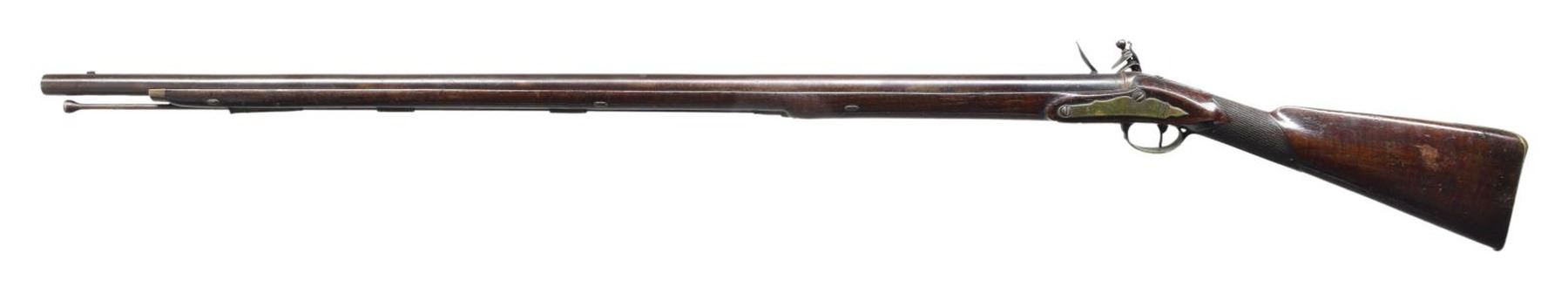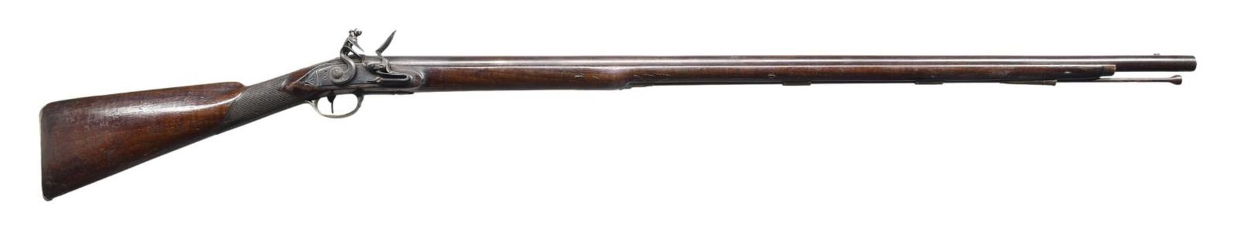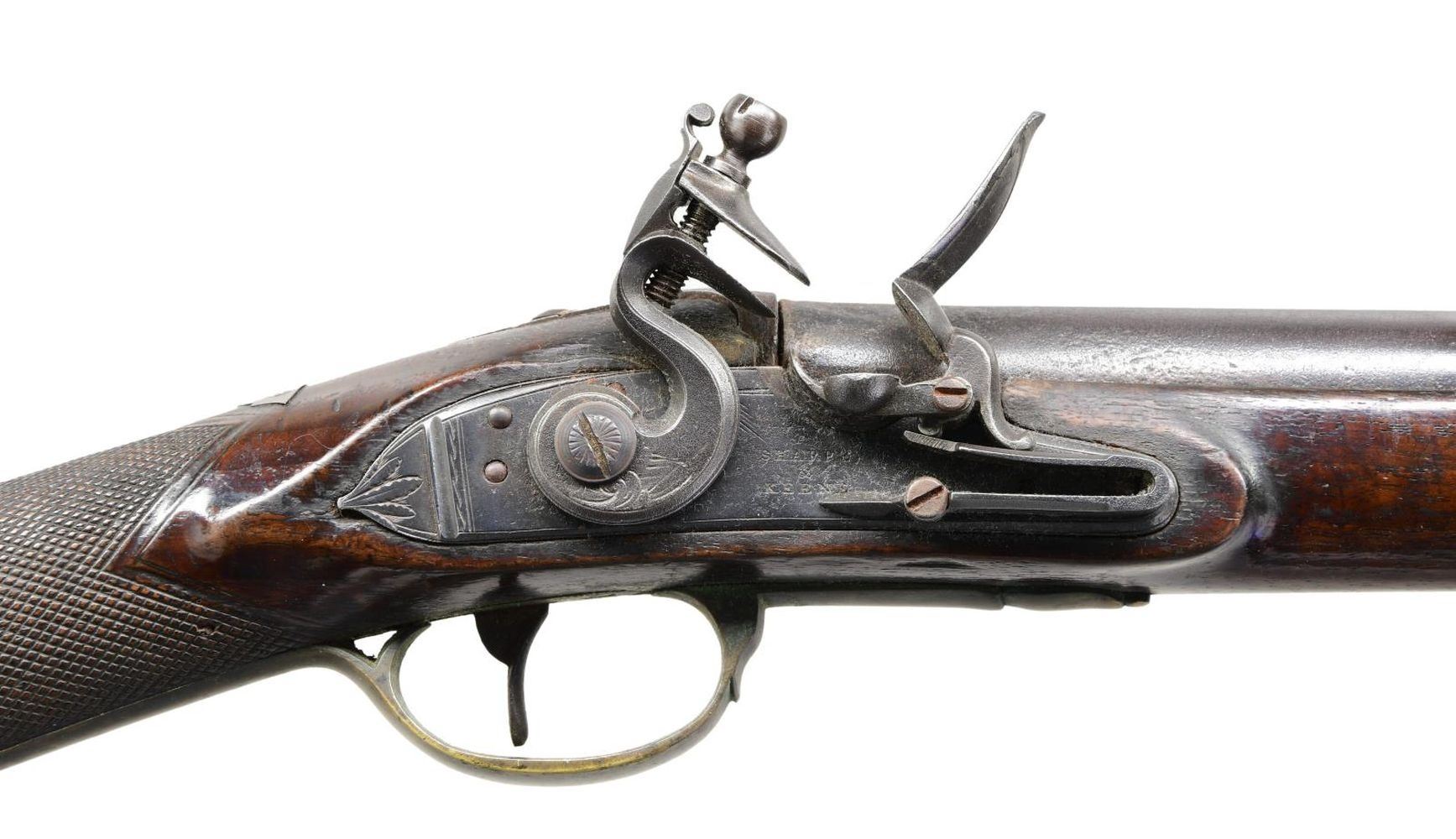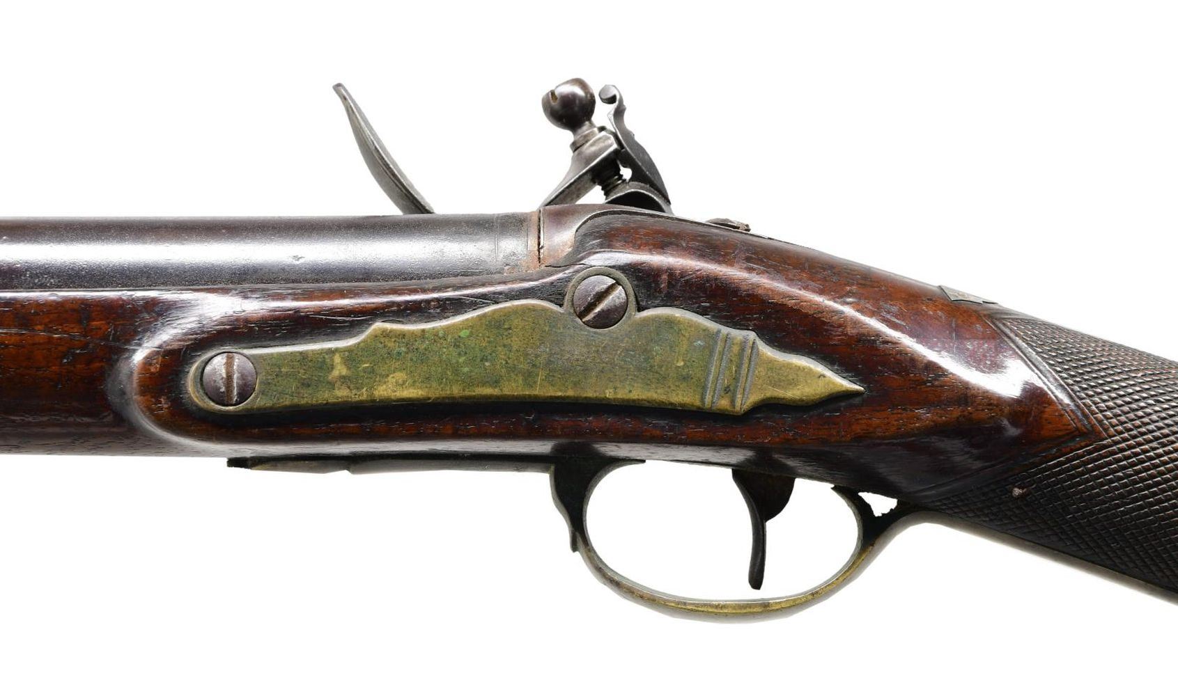 Cal. 72. NSN. Bbl. 39". Birmingham made flintlock musket by Sharp & Keene. Lock marked "SHARPE & KEENE". Gun otherwise appears unmarked. Hardwood stock w/ checkering at wrist, brass nosecap, sideplate, trigger guard & buttplate. Top of stock has silver decoration. Iron ramrod secured by brass thimble & three pipes. CONDITION: stock has added varnish w/ a few long repaired cracks on left side, a few chips, scattered dings & handling wear. Lock is stiff but functional when hand cycled. Brass parts are a dark yellow patina w/ scattered oxidation. Balance of metal is a dull gray patina w/ scattered oxidation & pitting. Pitted smoothbore. (01-25175/MJC). ANTIQUE. $1200-1500.