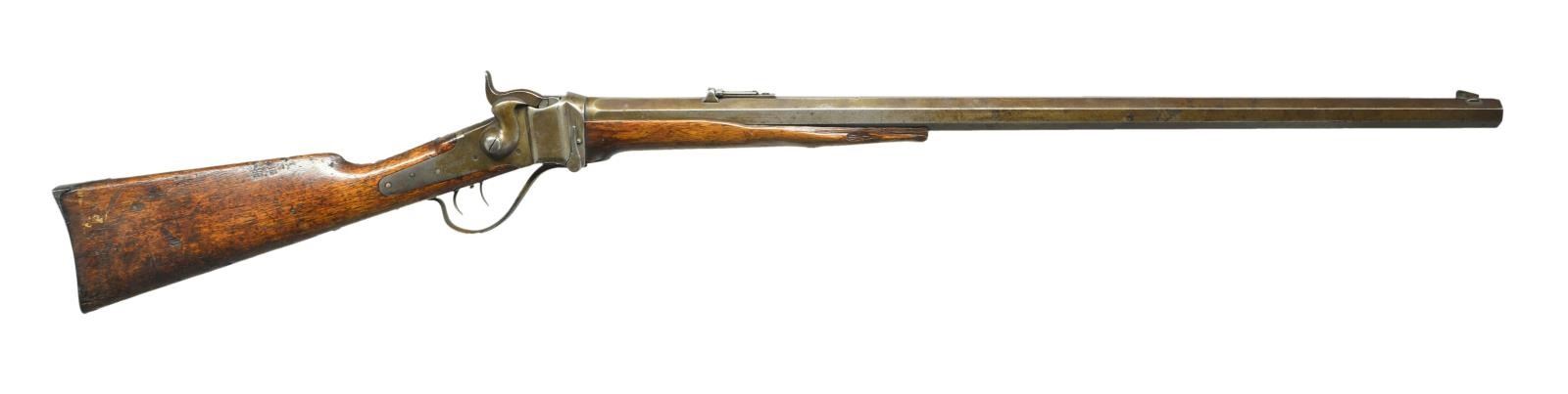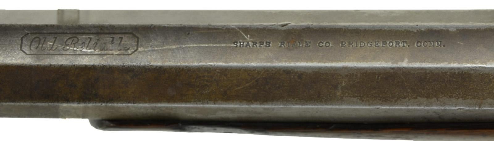 Cal. 45 2 1/10’’ (45-70). S# 98517. Bbl. 30’’ heavy octagon measuring 1’’ across flats at muzzle. Top flat is marked “Old Reliable” w/ 1 line Bridgeport address. German silver blade rocky mountain style front sight w/ Lawrence patent leaf rear sight. Conversion New Model carbine action w/ cartridge style replacement breech block & hammer. Original 1852 dated lock plate is ground to 1874 style. Double set triggers. 2 screw walnut forearm. Original straight grip percussion stock w/ steel buttplate having fitting for saddle ring bar on left side. WEIGHT: 10 lbs, 9.8 ozs. After the civil war, many cartridge conversions were sold in the American west & are commonly associated w/ Buffalo hunting. CONDITION: metal has a mottled brown appearance w/ small marks. Wood shows heavy wear & dents. Forearm is missing large chips along both sides of the bbl. channel. Stock has cracks extending from the buttplate. Trigger will not set properly. Lightly pitted bore retains sound rifling. PROVENANCE: From the Lifelong Collection of Glen E. Mattox. (01-22526/DS). ANTIQUE. $2,500-4,000.