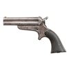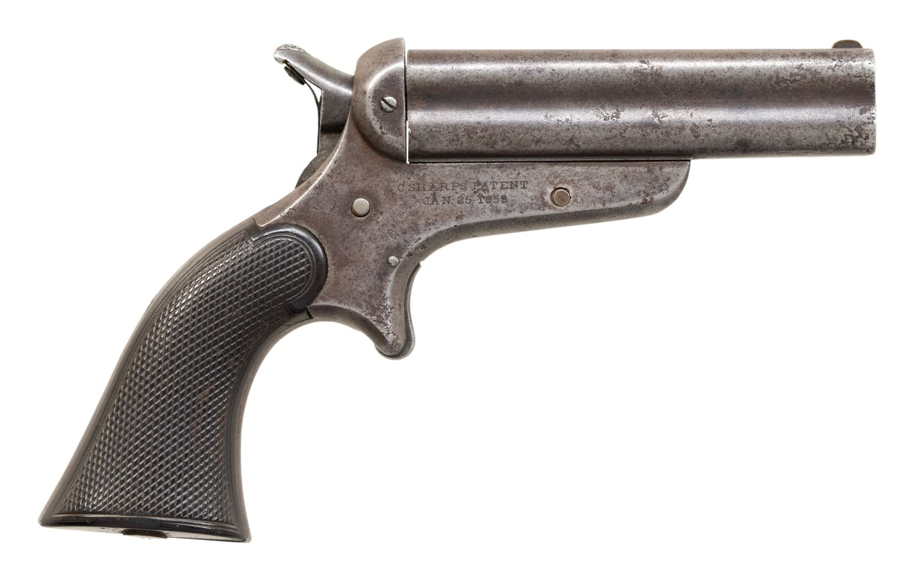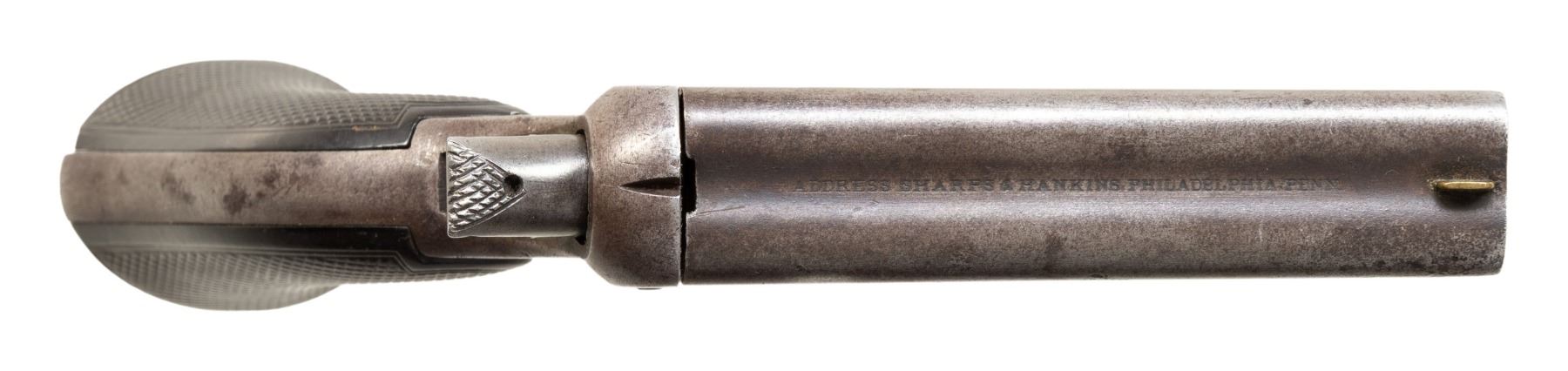 Cal. 32. S# 3642. 6.5" overall, 3.5" 4-barrel cluster. Steel frame stamped "C. SHARPS PATENT / JAN. 25, 1859", top of barrel cluster "ADDRESS SHARPS & HANKINS, PHILADELPHIA PENN". CONDITION: good overall, checkered hard rubber grips are well fit. Mechanically fine, good rifled bores. PROVENANCE: Norman Olliff Estate. (01-26918/JS). ANTIQUE. $350-450.