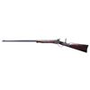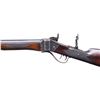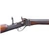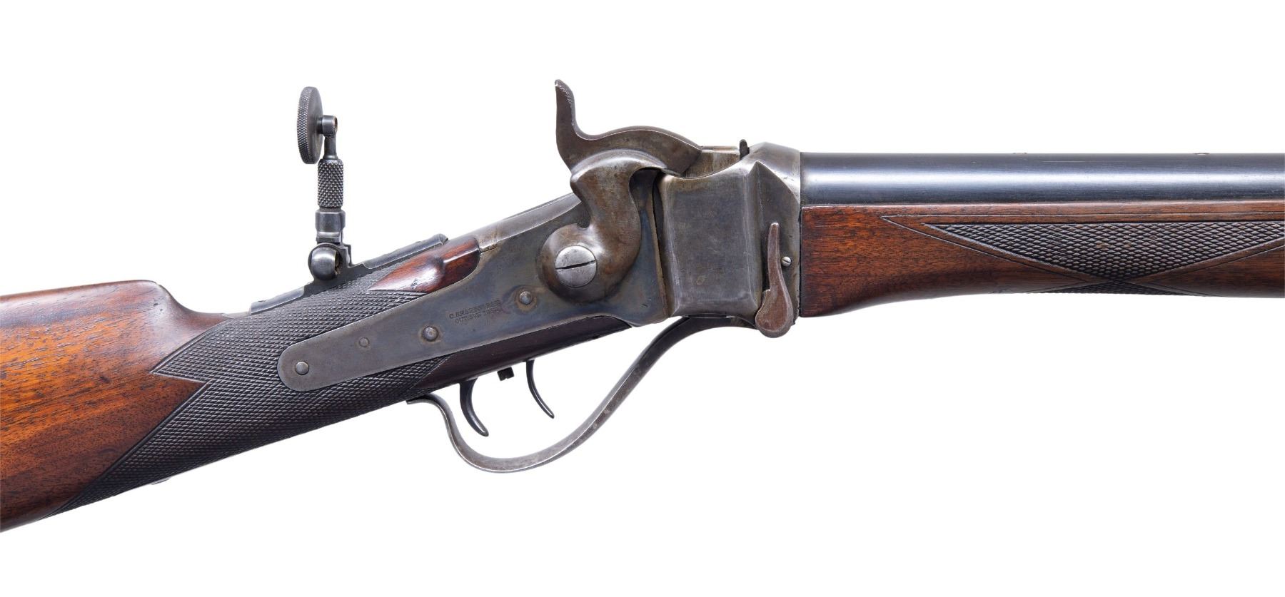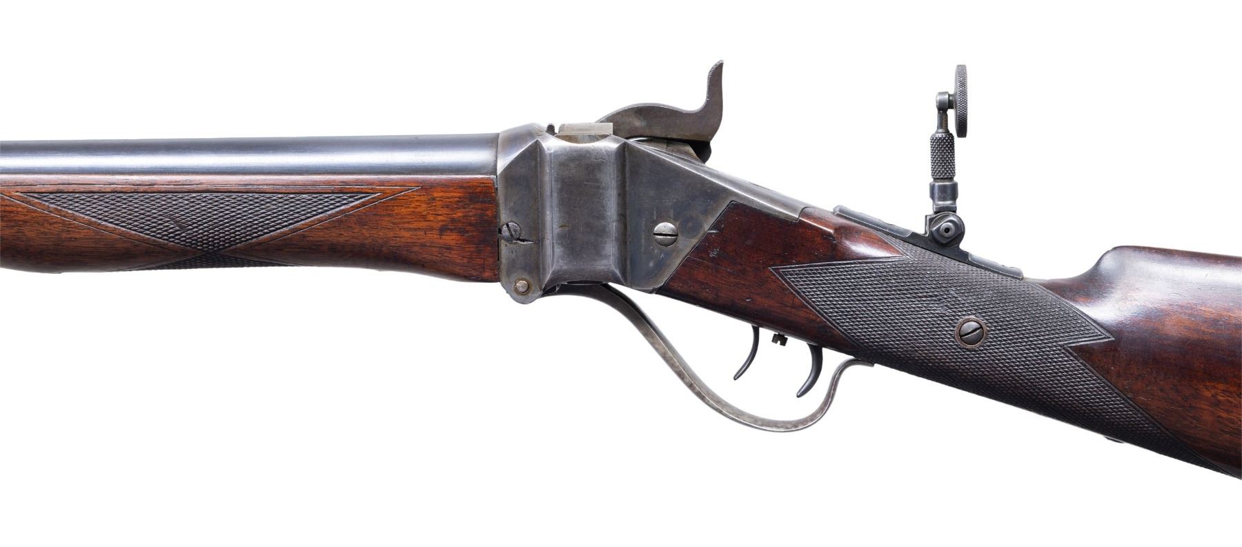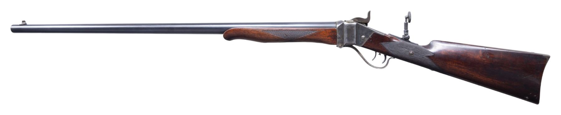 BREECHLOADING "BUFFALO RIFLE". Cal. 40-70 Sharps Bottleneck. S# 10755. Bbl. 29 1/4" tapered rnd. replacement bbl. measuring 3/4" across at the muzzle. Dovetail mounted front sight with broken bead. Rear sight holes are fitted with plug screws. Tang sight with disc aperture. Original sight holes on top tang are plugged. New Model 1859 military carbine conversion action. The primer feed mechanism is removed from the sideplate. The action has re-case colored finish and is fit with double set triggers. Straight grip walnut stock with steel carbine buttplate and point pattern hand checkering as done by Meacham at the time of conversion. Later schnabel tipped walnut forearm with a swell around the front attachment screw having coarse checkering that is not consistent with Meacham work. Weight: 10lbs, 0.8oz. CONDITION: bbl. retains 90% lightly faded Meacham blue. Action retains 70% lightly faded re-case color hardened finish. Left side of action is cracked through the extractor screw area. Forearm has good finish and checkering with a crack between the rear attachment screw and the receiver. Stock has lightly worn finish showing handling marks and small dents. Sound action and double set triggers. Bore is generally bright with strong rifling. PROVENANCE: The Esteemed Norm Greenberg Collection. (01-27773/DS). ANTIQUE. $5,000-8,000.
