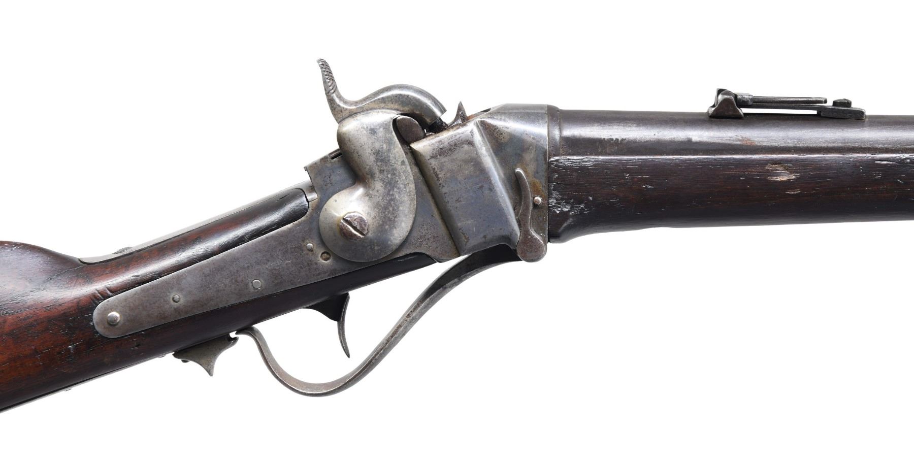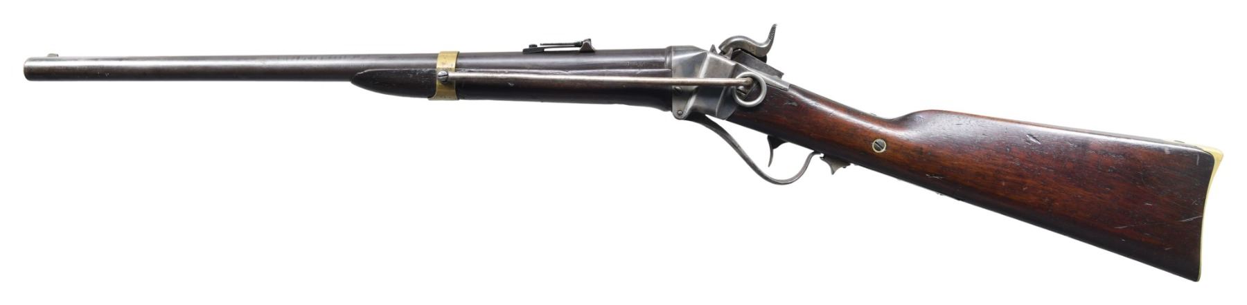 CARBINE. Cal 52. S# 15001. Standard brass mounted configuration, 37.75" overall, 21.5" barrel, adjustable long range rear sight, brass blade front sight, "SHARPS /PATENT / 1852" on lock, "SHARPS / PATENT / 1848" on back of frame and S# on tang, 9" long saddle bar. Famously nicknamed "John Brown" Sharps, as many shipped to Kansas Abolitionists May 1855, one John Brown shipped carbine was close in S# to subject, 15012. Many guns in this serial range (14800-15100) were issued to 1st California cavalry, and 1st & 2nd NY Veteran cavalry regiments. Consecutive S# 15000 was issued to 2nd NYV cavalry in 1864 from National Archives records. CONDITION: good to very good overall, all original and matching, honest well used example. Barrel overall has gray/plum patina, traces of case color on frame, smooth cleaned brass. Mechanics are fine, but Maynard capping device missing cover screws and spring, not functional, crisp rifled bore. (01-27010/JS). ANTIQUE. $2,500-3,500.