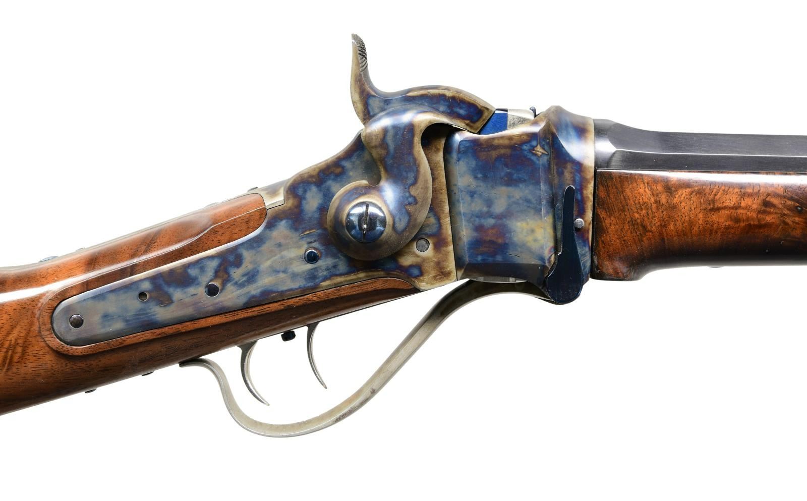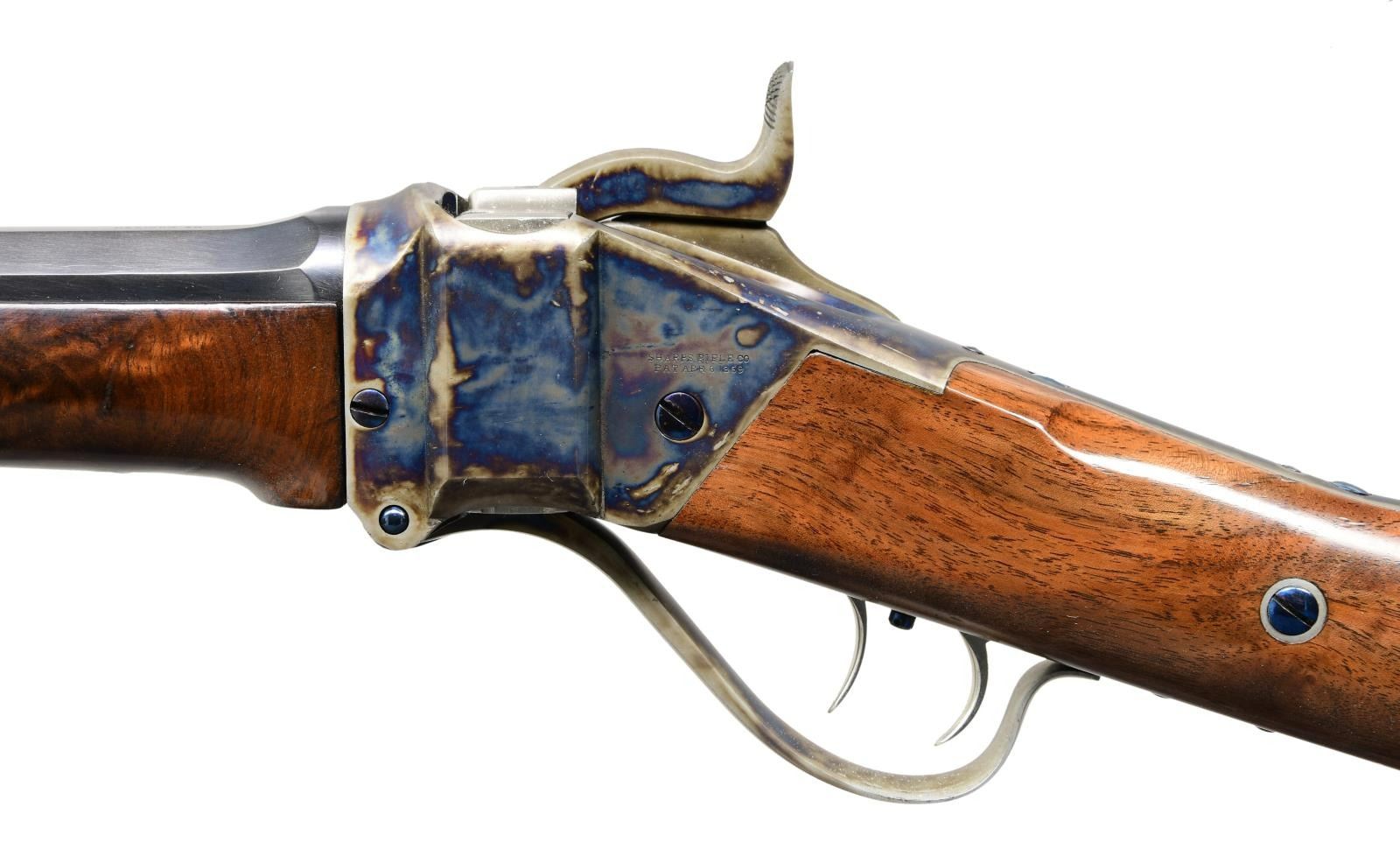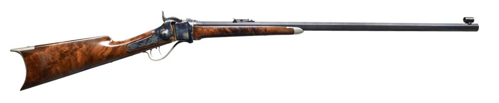 Cal. 40. S# 155051. Bbl 30". The full-length heavy octagonal barrel is stamped "SHARPS RIFLE CO HARTFORD CONN" over the top flat, with "CALIBRE 40" stamped towards the breech. Rear sight base is stamped "R.S. LAWRENCE/ PATENTED/ FEB. 15TH 1859.". Left side of the receiver is stamped "SHARPS RIFLE CO/ PAT APR 6 1869". Case-color hardened frame, lever, and hammer, with a blued barrel and sights. Nitre blued screws with nickel-plated crescent buttplate, nosecap, and double-set triggers. Smooth wood straight comb buttstock with smooth wood forend. Globe front sight with flip-up ladder rear sight. CONDITION: excellent, with metal components retaining bountiful amounts of their original factory-applied finishes overall, exhibiting few mild superficial marks from handling and storage overall. The forend nose cap is cracked on the right side but otherwise remains sturdy and serviceable. Mirror bore, exhibiting well-defined rifling throughout. Wood furniture shows scattered marks and minor impressions from handling and storage. A very attractive contemporary-production Sharps Model 1874 single-shot rifle. (23-6969/MLW). MODERN. $1,750-2,500.