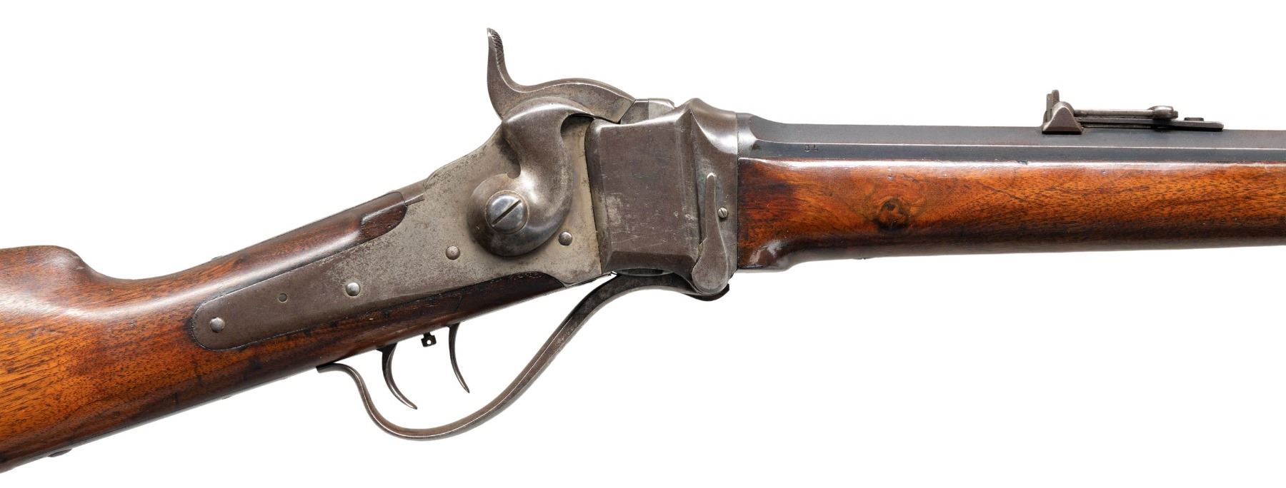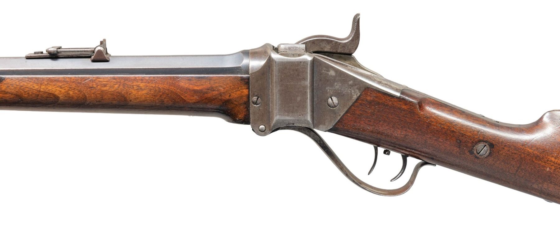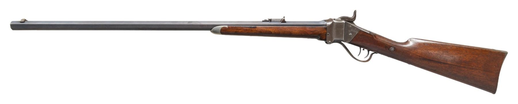 Cal. 40, 2 5/8" bottleneck. S#. 155064. Bbl. 30" octagon with Hartford address measuring 7/8" across flats at the muzzle. Sporting front with Lawrence patent rear sight. Blue finished bbl. with case colored action. Double set triggers. Pewter tipped walnut forend and straight grip stock with rifle buttplate. Weight 9 lbs, 4.4 oz. A note with the rifle indicates a ship date of November 18,1875. CONDITION: bbl. retains over 40% dull fading blue showing edge wear with spots of light corrosion. The action has largely faded to gray showing traces of case colors in protected areas. Original wood finish shows wear and age darkening with scattered scratches & marks. The bore has a darkened appearance with worn rifling. Sound action and triggers. PROVENANCE: The Esteemed Norm Greenberg Collection. (01-27762/DS). ANTIQUE. $7,000-10,000.
