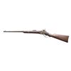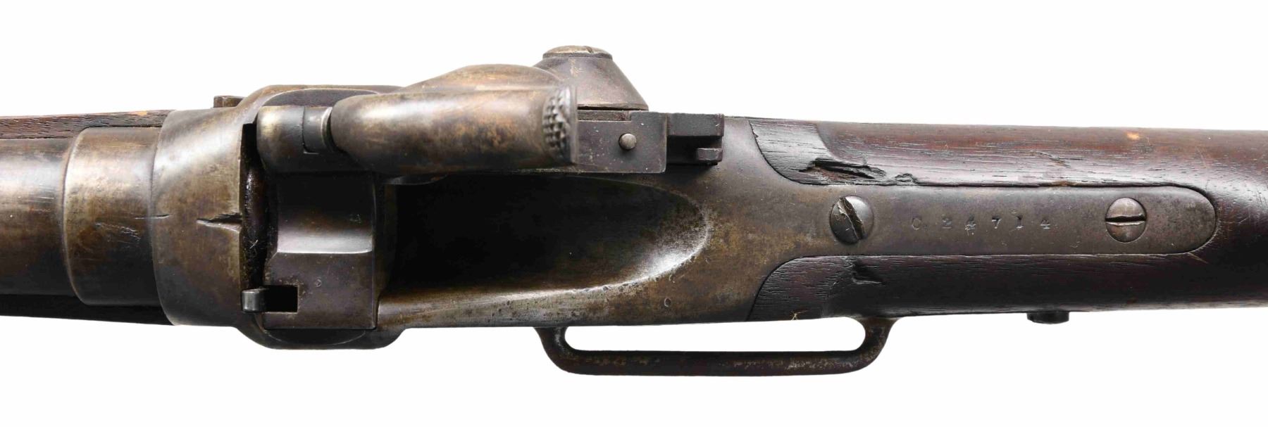 Cal. 50-70. S# C,24714. Bbl. 22" round w/ German silver blade front sight & Lawrence patent rear sight. Single shot action retains the saddle ring bar only on the left side, primer feed mechanism is intact on lockplate. Band fastened walnut forearm & straight grip stock w/ carbine buttplate. CONDITION: metal finish has faded to gray-brown showing spots of corrosion. Wood has age darkened appearance showing handling marks & small dents. Sound action. Bore is generally bright w/ strong sharp rifling. (01-25423/DS). ANTIQUE. $1,500-2,250.