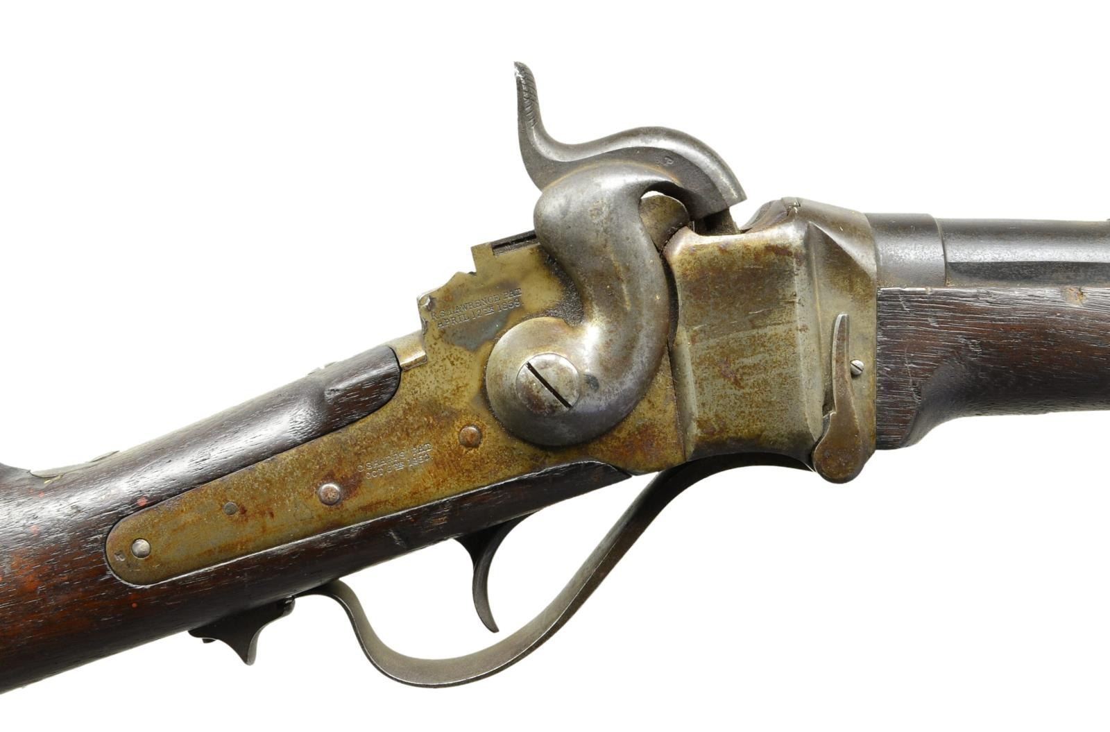 Cal. 52. S# C,30374. Barrel 30" with Hartford address. German silver blade front sight and Lawrence patent rear sight. Case colored single shot percussion action. Lock is fitted with Lawrence patent primer feed. Three band forearm and straight grip walnut stock with case colored patchbox and steel buttplate. Left ear of stock has two partially visible cartouches. Major parts have "P" or "M" inspector's initials. Estimated production of 1,000. CONDITION: bbl. finish has faded to a dark brown patina showing scattered corrosion with front portion being polished bright. Action retains some lightly visible case colors fading to gray brown and showing scattered corrosion. Top tang is cracked through forward screw hole. Stock and forearm have dark worn appearance with numerous dents, scratches and marks. Dark lightly pitted bore retains sound rifling. (01-22286/DS). ANTIQUE. $2,000-3,000.