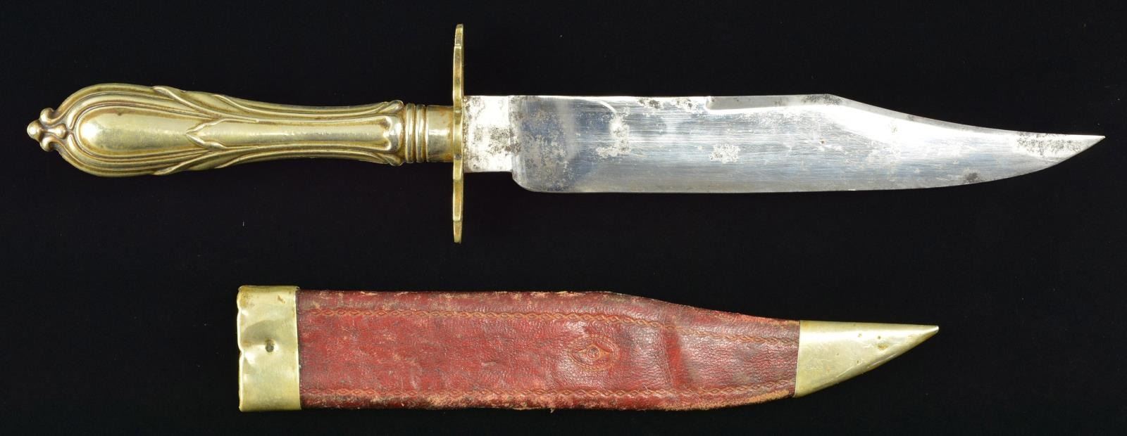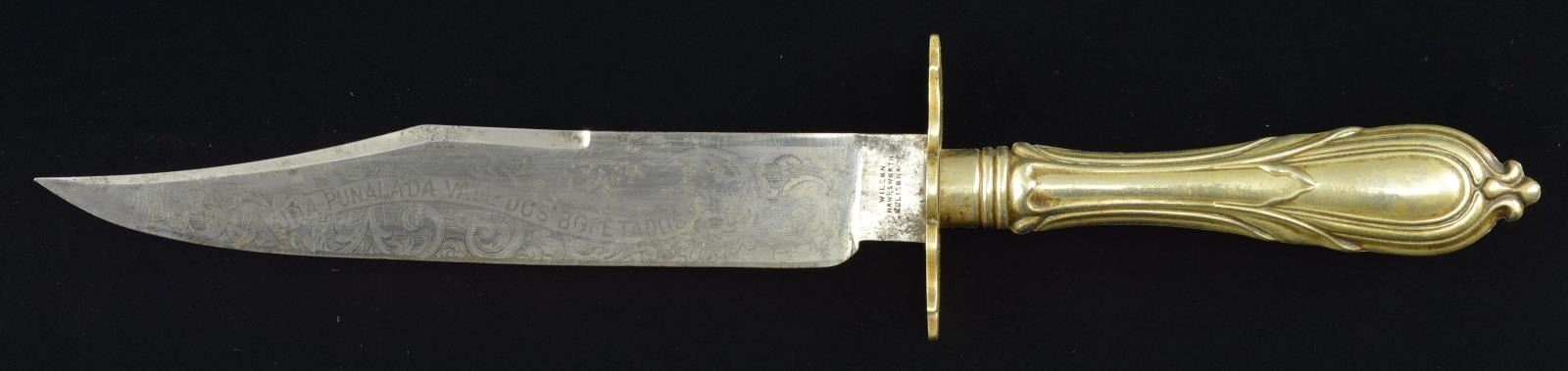 Overall length: 13 1/2". Blade length: 8”. Classic bowie blade features 3 1/2" false edge and is etched on one side with foliate motifs and a ribbon that reads “UNA PUNALADA VALE DOS BOFETADOS”. The motto roughly translates to “A stab is worth two slaps”. The ricasso is stamped “WILSON HAWKSWORTH ELLISON & CO”. This famous firm is known to have produced knives in Sheffield, England from 1857 to 1864 at their Carlisle Works. This bowie has a German silver crossguard and a German silver cutlery style grip of a naturalistic form. The sheath features a German silver throat and tip with a gold embellished red Moroccan leather body. CONDITION: blade actually has areas of original factory polish of scattered areas of light oxidation. The etching, though originally quite light, is still quite legible. Hilt shows light wear with expected tarnish. Sheath remains strong with traces of gold highlights remaining. The tip and throat show minor dents and the stud has been removed. (02-17961/BF). $800-1,200.