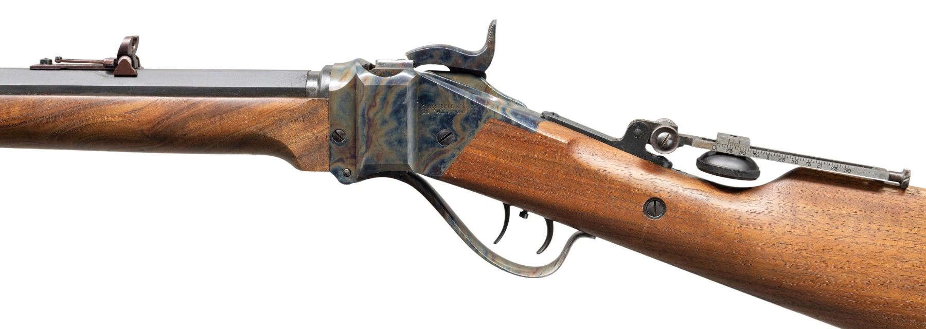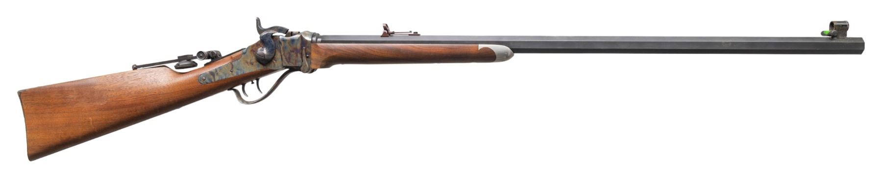 Cal. 40, 2 1/2" (40-70 Sharps). S# B9420. Oct. 30" barrel. Globe aperture front sight with spirit lever, buckhorn ladder folding rear sight & Browning tall vernier tang sight having Shaver multi aperture disk. Case hardened receiver with dbl. triggers. Walnut stock set w/ pewter forearm tip & case hardened military buttplate. CONDITION: near excellent wood & metal finish with several marks on toeline of stock. Near excellent rifling. PROVENANCE: Estate of Groves Herrick. (25-5677/MD). MODERN. $1,000-1,500.