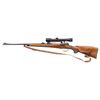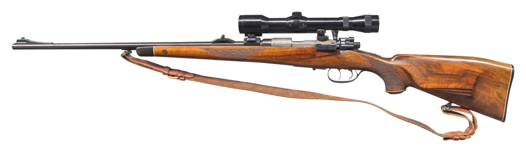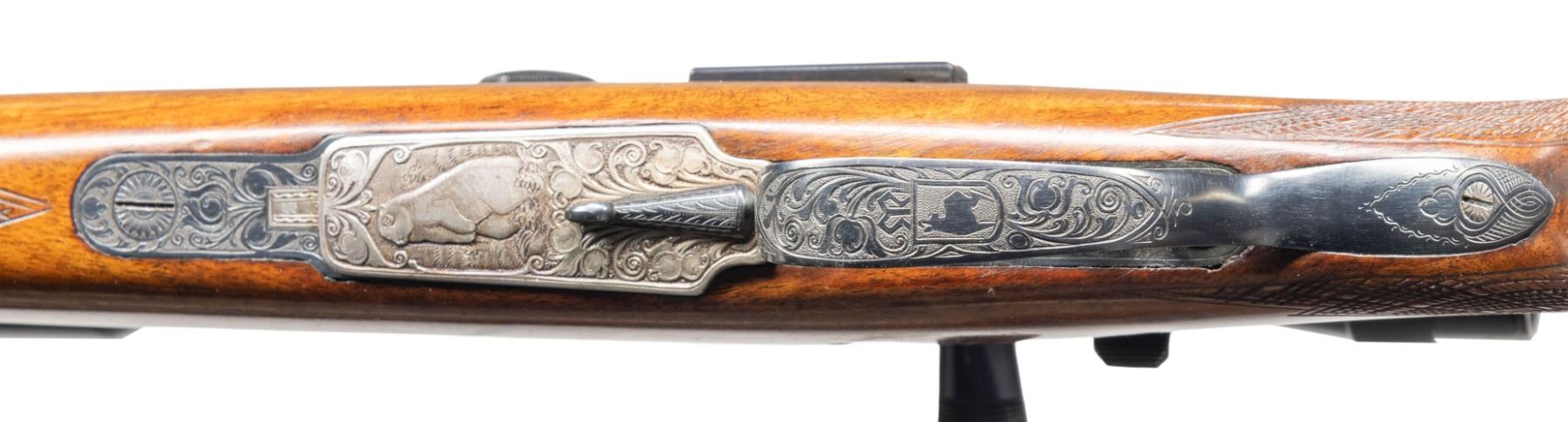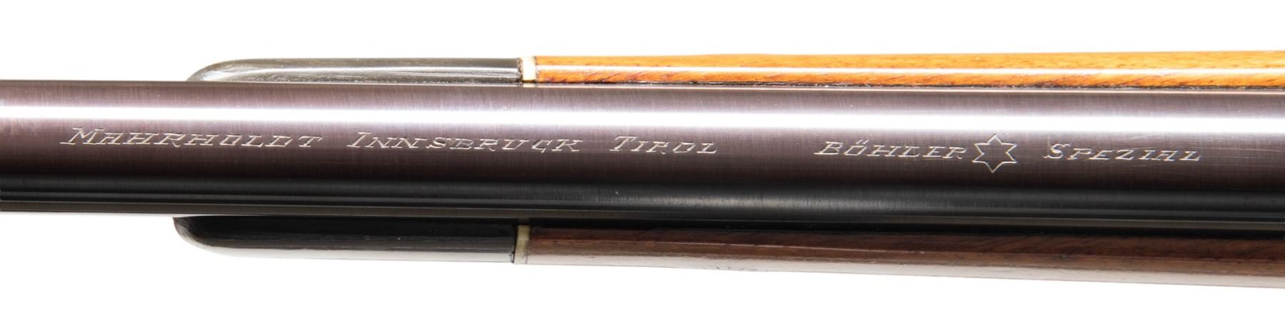 Cal. 222 Rem. S# 794.56. The 24" lightweight round barrel is fitted with "U" notch rear sight in island base and gold bead front in long ramp. Front claw scope base is fitted to breech end of barrel. Top of barrel is engraved "Marholdt Finnsbruck Tirol" and "Bohler Spezial" (steel type). Mauser 98 large ring action appears to have been professionally shortened which is certainly not beyond the capability of this famous maker and measures 6-1/2" between action screws. This alteration was done to accommodate the short 222 Remington cartridge with efficiency. Bolt handle has been replaced with very well done butter knife type and a low scope safety has been fitted to bolt shroud. Rear scope base is mounted on recontoured bridge and tang is extended and has been fitted with a safety. Bottom metal has hinged floorplate with lever release and double set triggers are fitted. Action and bottom metal are very nicely engraved with near full coverage acanthus scroll within line and geometric borders. On floorplate this fine scroll surrounds a semi-relief engraving of a ground hog. On trigger guard bow it surrounds the Marholdt logo. The pistol grip stock made of well veined and lightly figured European walnut exhibits 50's styling with white line spacers at butt, grip cap and forend tip. Stock also features fluted Tyrolean right hand cheekpiece, chin strap transition to grip and sling loops. Rifle is mounted with Nickel 4X rail scope with 3 post reticle in claw mounts (rear with windage). Original lens protector is also present. Rifle is also fitted with well made leather sling. CONDITION: very fine with metal retaining over 90% blue on barrel and French gray on action. Stock retains nearly all of its original oil finish. Bore is bright and shiny. Mechanically good. Scope is also very fine; optically clear. PROVENANCE: From the Buckstix Collection. (25-6458/MGM). CURIO. $2,500-3,500.