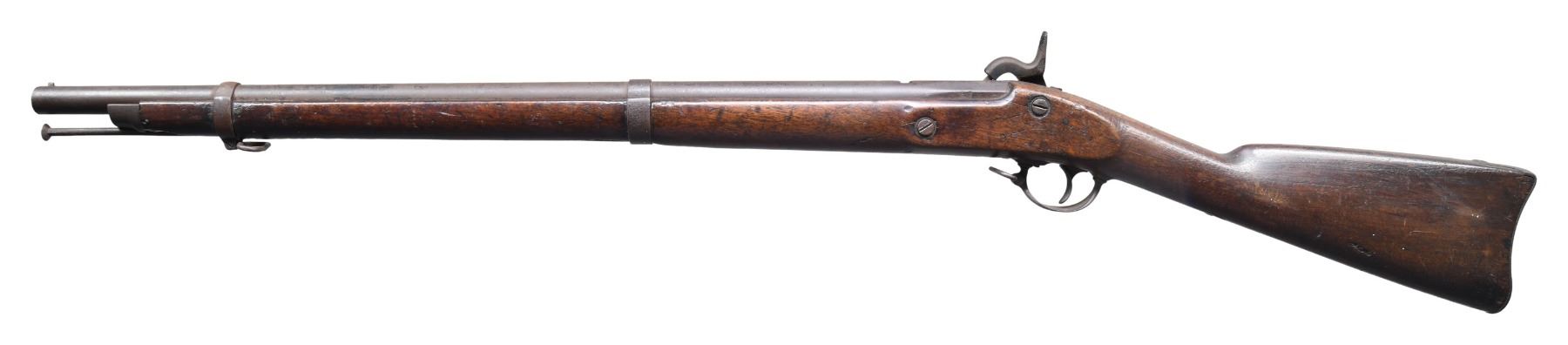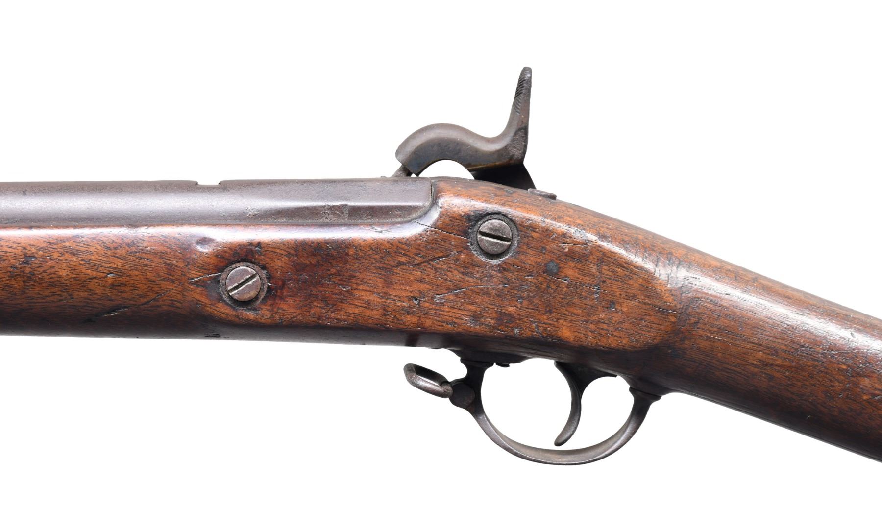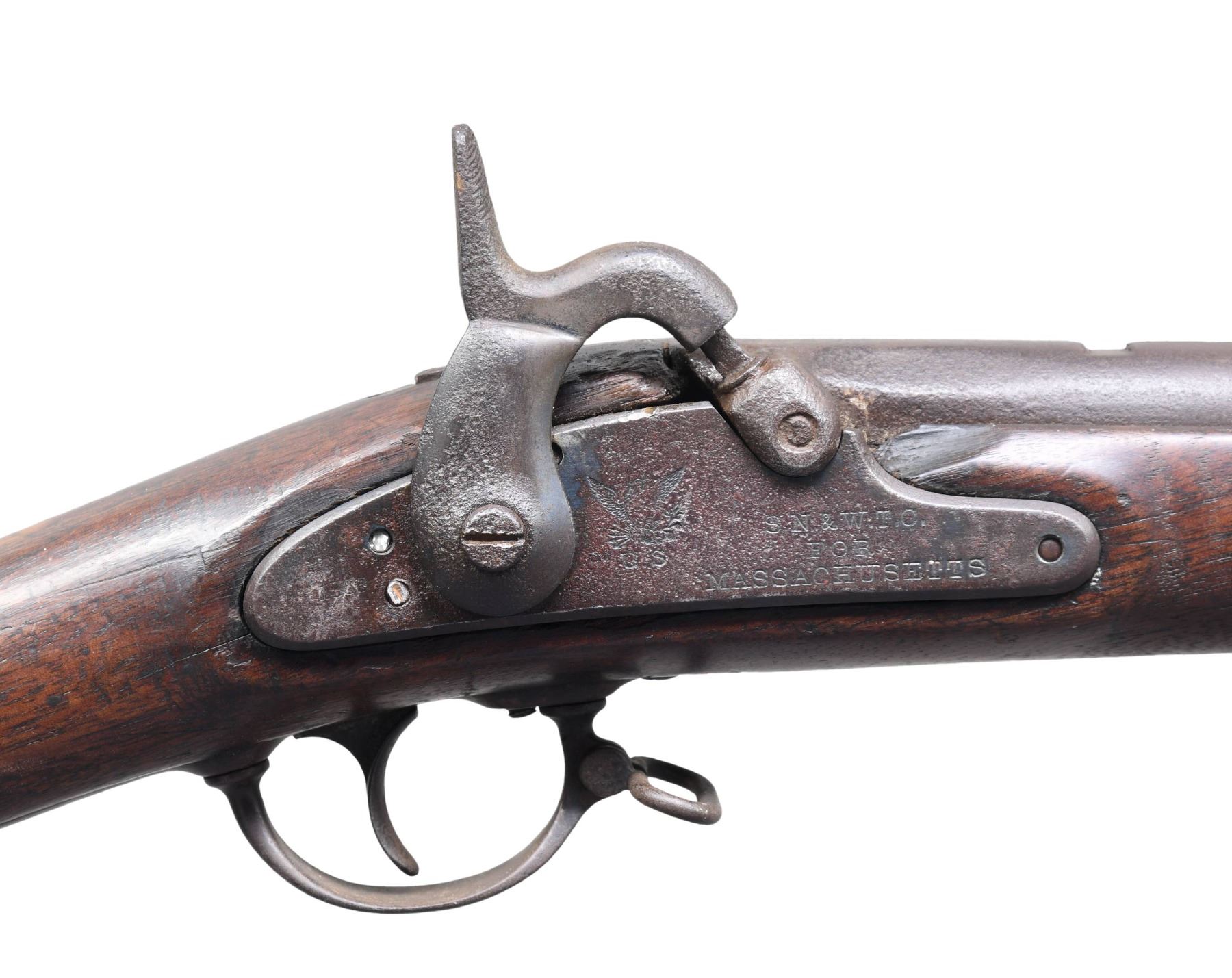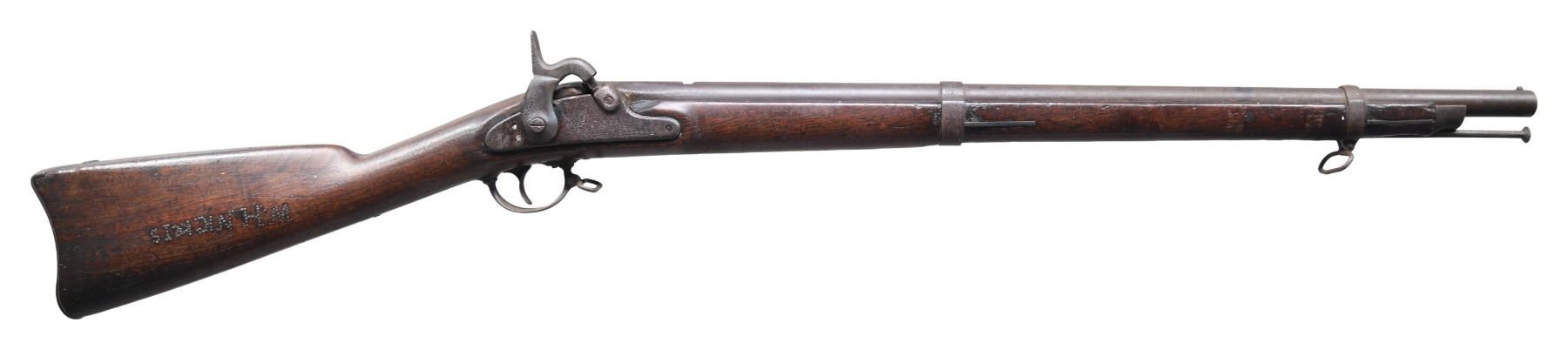 CONTRACT MODEL 1861 RIFLED MUSKET. Cal. 58. NSN. Bbl. 27 1/4". Approx. 3,000 of these rifles were contracted by the state of Massachusetts & used to arm their troops sent to the Civil War. This rifle has been shortened to cadet length. Bore has been reamed smooth and rear sight removed. Front sight is tiny inverted "V" at muzzle. Barrel has indistinct "VP" proofs. Bevelled lockplate w/ 1861 hammer is marked "S.N. & W.T.C. FOR MASSACHUSETTS". The lock carries the eagle over "US" & "1863" date. "US" marked buttplate. Marked on left side w/ very faint inspector's mark in oval. Bottom swivels. Replacement ramrod. Flat lower band w/ oval upper band. Both retained by springs. Walnut stock has been shortened & the stock tip relocated rearward. Buttstock is marked on right side w/ the name "W.H. NICHOLS" done with small brass brads. CONDITION: stock was given an early arsenal rework finish w/ slight loss of wood in inletted areas w/ extensive wear & handling marks. There are a number of cracks on both sides in breech area, one of which is on the left side & extends approx. 6" into the grip area. 3" crack behind the lower band at the bottom of the stock. Ramrod channel has notable chipping issues. Metal has turned overall patina w/ oxidation & fine pitting. Cleanout screw is broken flush w/ bolster. Lock has hobbyist gunsmith type repairs w/ Phillip's head screws & incorrect springs. Dark oxidized bore. (01-27019/RW). ANTIQUE. $300-450.
