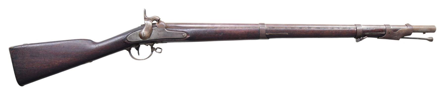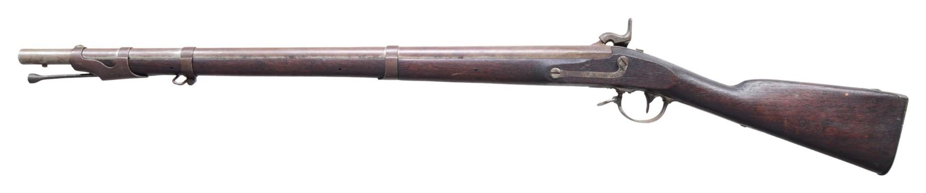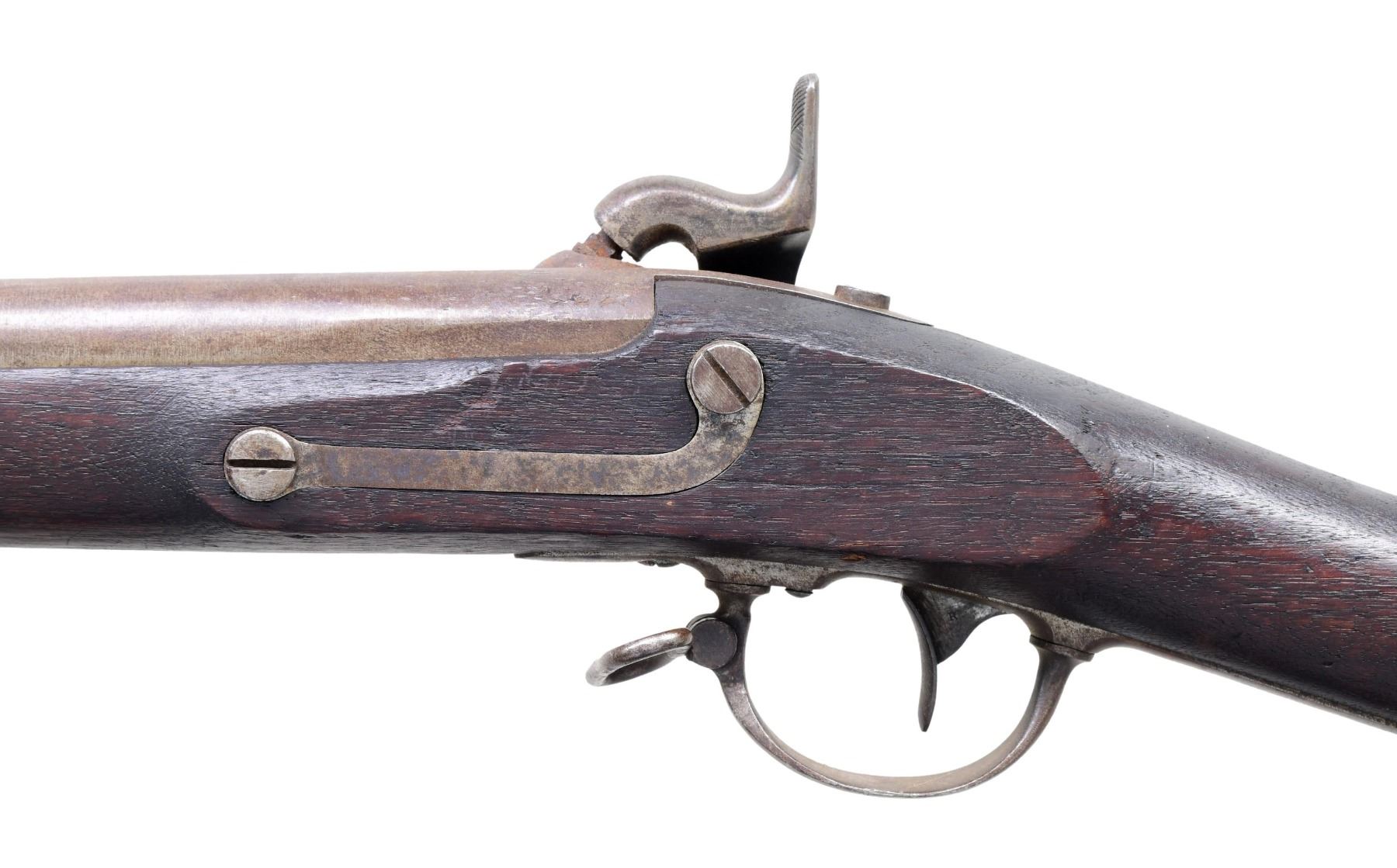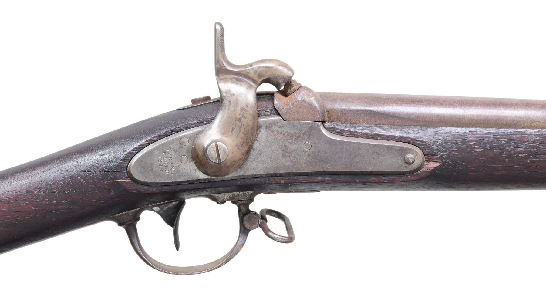 Cal. 69. NSN. Originally musket had a 42" barrel, shortened to 30", retaining all three original bands and a bayonet lug attached near muzzle. This long arm was purchased as a Confederate alteration. CONDITION: very good, appears complete and original as configured, rear sling swivel is still attached but cracked, 1849 dated lock markings are discernible, barrel proofs are crisp, Barrel date not discernible. Good mechanics, clear dirty bore. (01-26904/JS). ANTIQUE. $500-700.