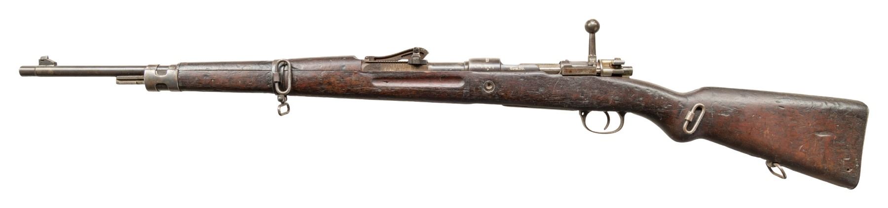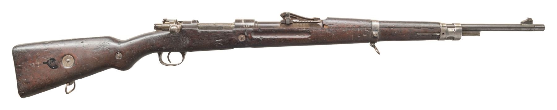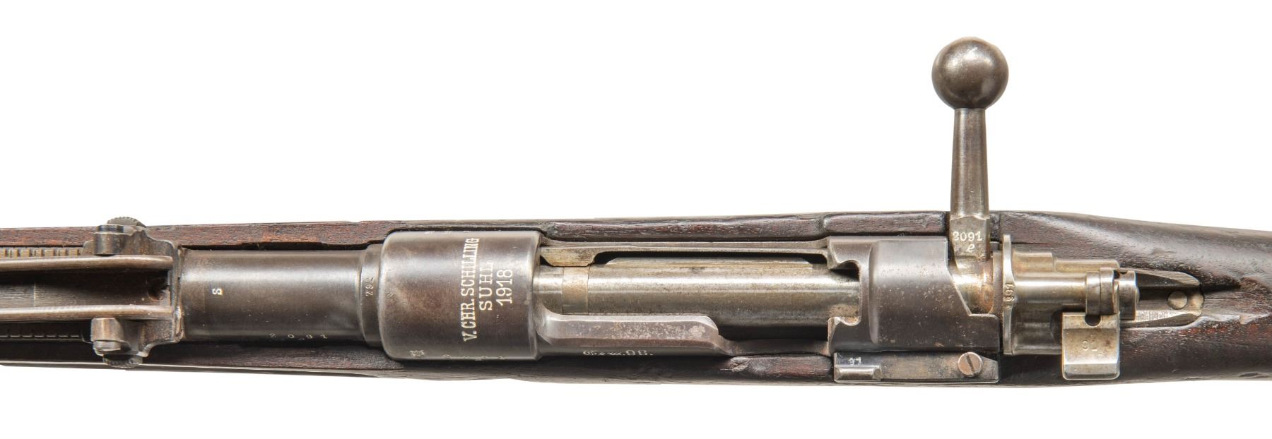 Cal. 8mm Mauser. S# 2091e. Bbl. 24 3/4" shortened. Blade front sight. Roller coaster rear sight graduated to 2000m. Matching numbers on receiver, bbl., rear sight, all bottom metal parts & all bolt parts except for cocking piece. Other parts are unnumbered or mismatched. Modified & shortened 1918 VCS Gew 98. Reblue finish. VZ-24 replacement stock & bands. Bottom mounted & left side sling swivels. No cleaning rod or small locking screws present. CONDITION: stock has a darkened appearance with a crack behind upper tang, some chips most notable on right rear of handguard, a patch of black staining behind disc, scattered dings, gouges, scratches & handling marks. Metal shows a fading old reblue with front band having a silvery appearance, some dings, scattered oxidation, handling marks & edge wear. Action functions properly when hand cycled. Bright very good plus bore. (25-5477/MJC). MODERN. $400-600.