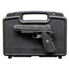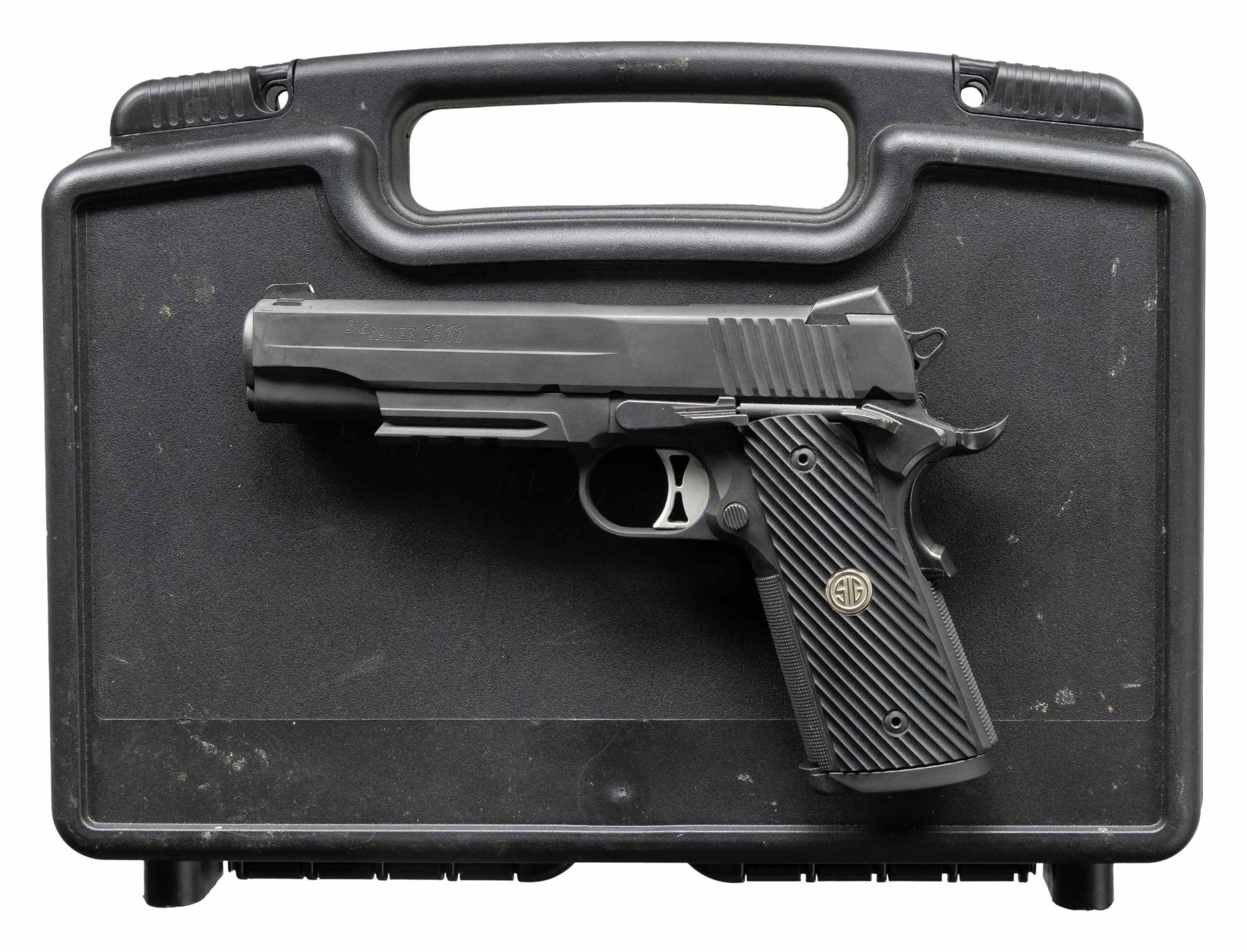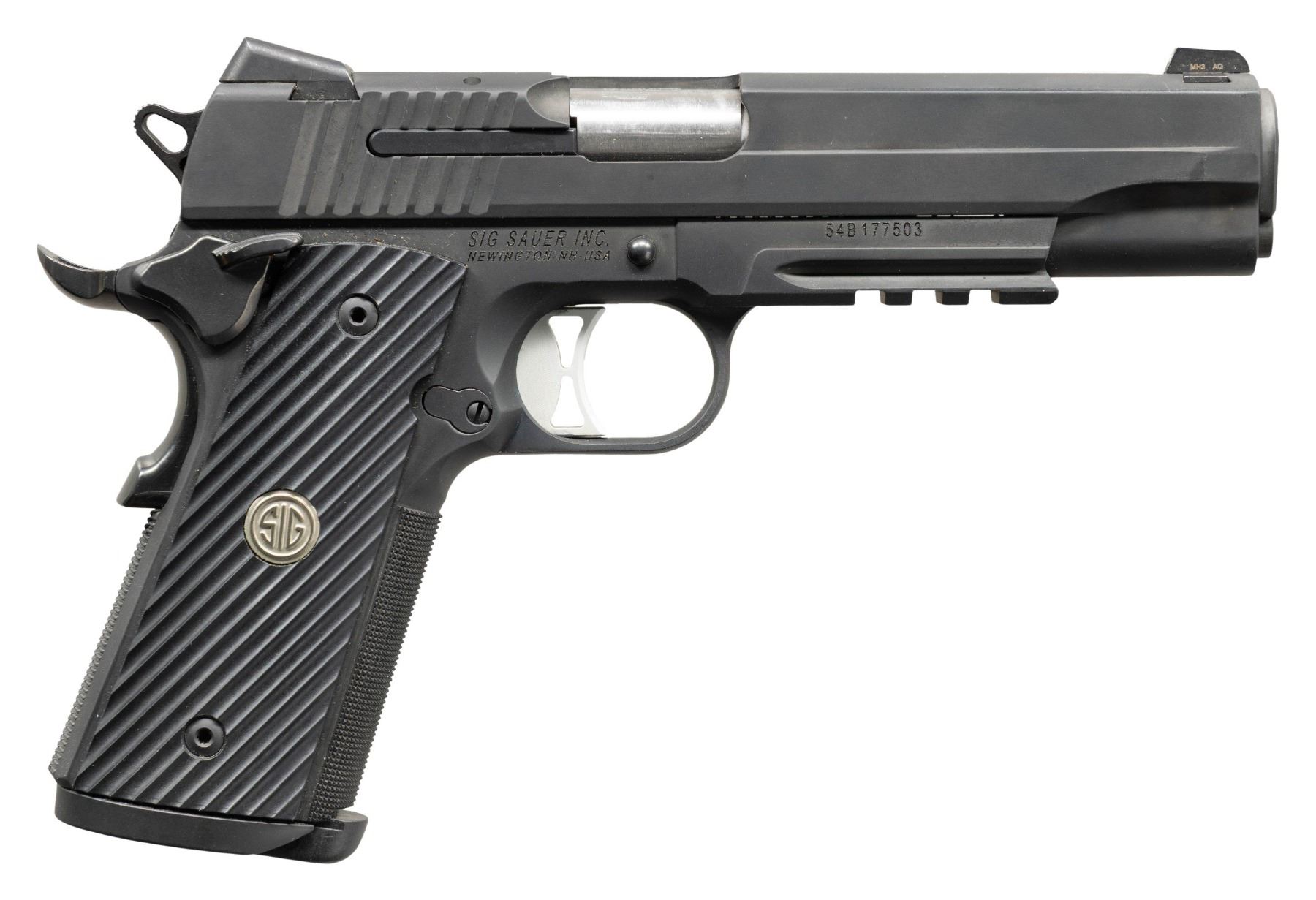 Cal. 10mm Auto. S# 54B177503. Bbl. 5". Three dot sights with MH3 front. Ambi safety. Extended blued beavertail grip safety. Balance of metal has gray Nitron finish. Frame has stippling on both grip straps & half length picatinny rail. Enlarged mag well. Grooved grips with Sig monograms. MAGS: 1 factory 8 rd. UNATTACHED ACCESSORIES: matching factory black plastic case with packaging. CONDITION: grips show light handling wear. Metal retains 98% Nitron finish with some light handling & usage wear. Action functions properly when hand cycled. Bright near excellent bore. (25-4612/MJC). MODERN. $500-800.