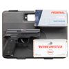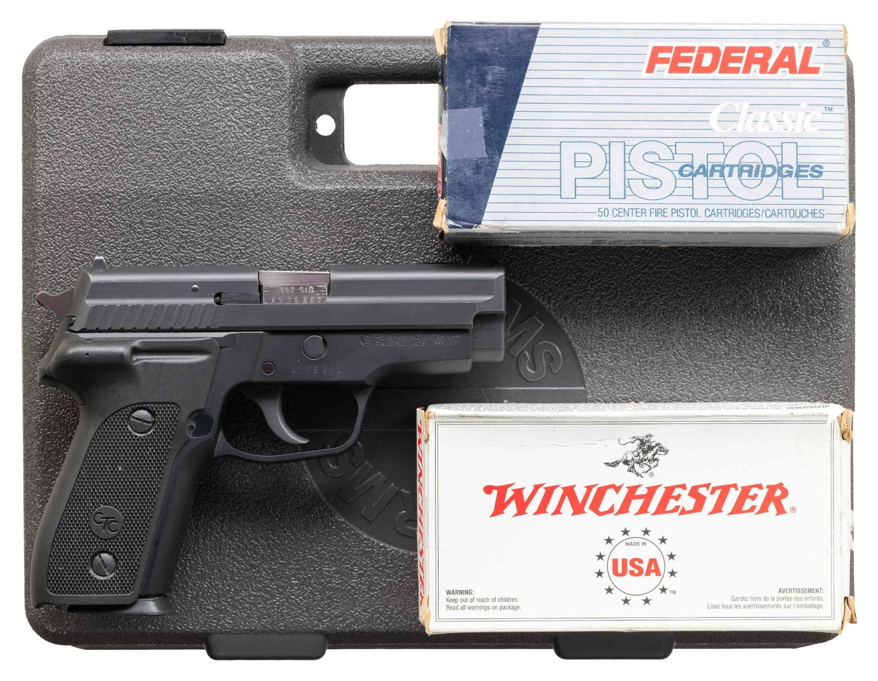 Cal. 357 Sig. S# AD36982. Bbl. 3 7/8". White dot front sight. Square notch rear sight with white stripe. German made frame assembled in Exeter, NH. Slide has matte gray finish. Frame has matte black finish. Crimson Trace red laser grips that appear functional. MAGS: 1-10 rd. UNATTACHED ACCESSORIES: factory hardcase, manual, one 50 rd. box of Federal Classic 125 gr. FMJ ammo. & one 50 rd. box of Winchester White Box 125 gr. FMJ ammo. CONDITION: grips show scattered light handling marks & some slot wear to screws. Metal shows light handling & edge wear. Action functions properly when hand cycled. Bright near excellent bore. (25-6111/MJC). MODERN. $400-550.
