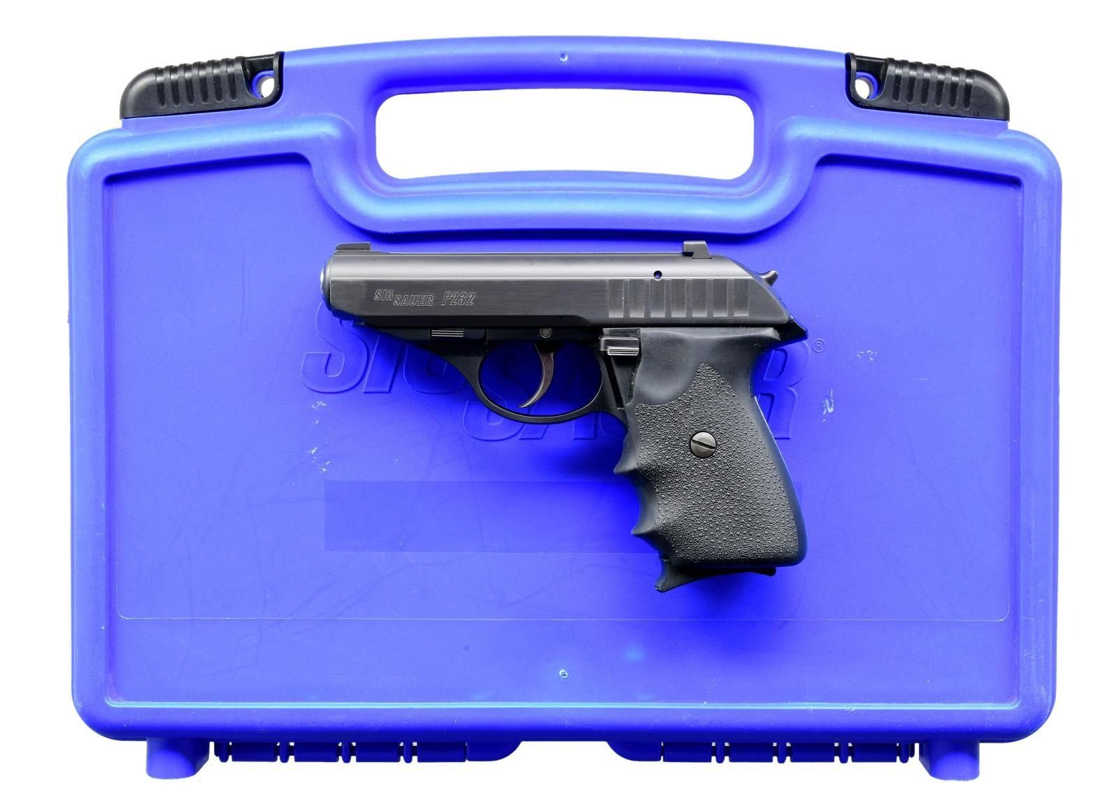 Cal. 380 ACP. S# S 313 980. Bbl. 3 3/4". Three-dot night sights. German-made Sig P232 pistol with Exeter, NH, import marking. Blued slide. Matte black frame. Hogue finger groove black rubber grips. MAGS: 2-7 rd. UNATTACHED ACCESSORIES: matching-numbered factory hardcase and spare three-dot sight set. CONDITION: all aspects are near excellent. (24-1718/MJC). MODERN. $300-500.