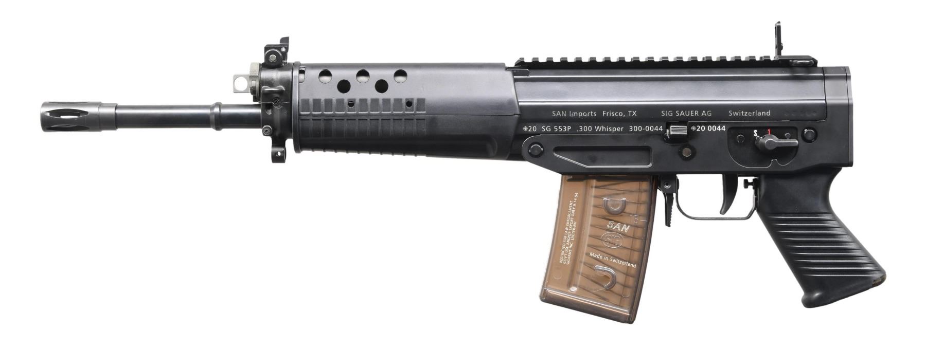 Cal. 300 Whisper. S# 20 0044. Bbl. 13 3/4" with flash hider. Flip up sights with aperture rear. Top mounted picatinny rail. Swiss made Sig 553 pistol with San import marking on left side of receiver. Ambi safety. Blued bbl., other parts have parkerized & dull black finishes. Black handguard & pistol grip. MAGS: 1-30 rd. & 1-20 rd. Total of 2. UNATTACHED ACCESSORIES: matching numbered factory hardcase with manual & cleaning kit. CONDITION: all aspects near excellent. (24-5219/MJC). MODERN. $800-1200.