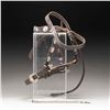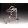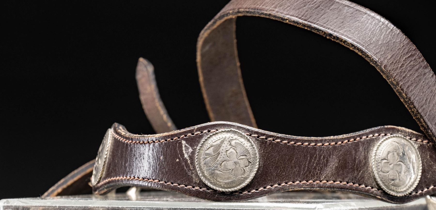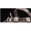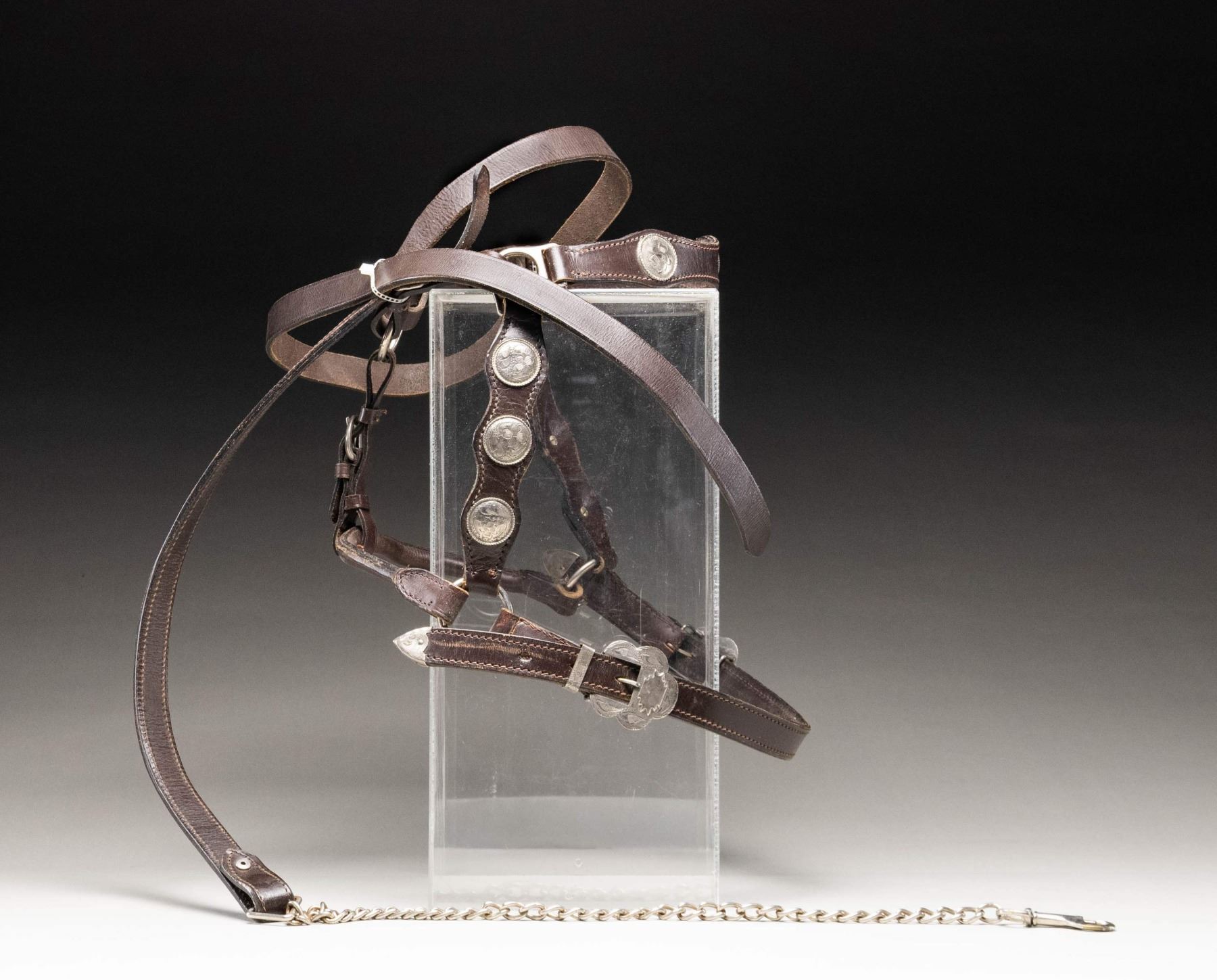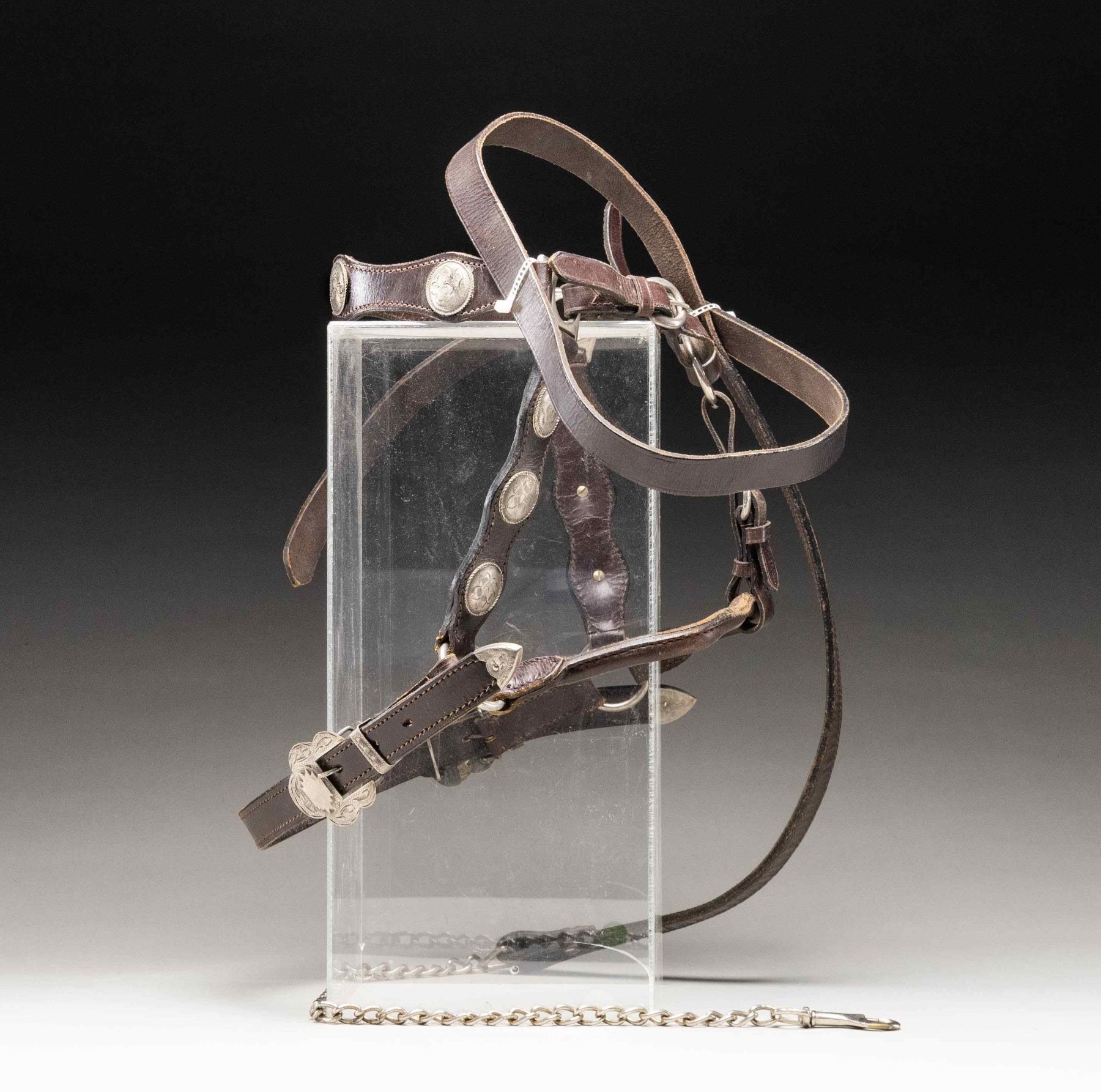 Black leather horse bridle with silver hardware. Some hardware has flower decorations. CONDITION: silver parts show some light tarnishing & areas dulling. Leather shows scattered crazing & normal age related wear. (02-25266/MJC). $250-350.