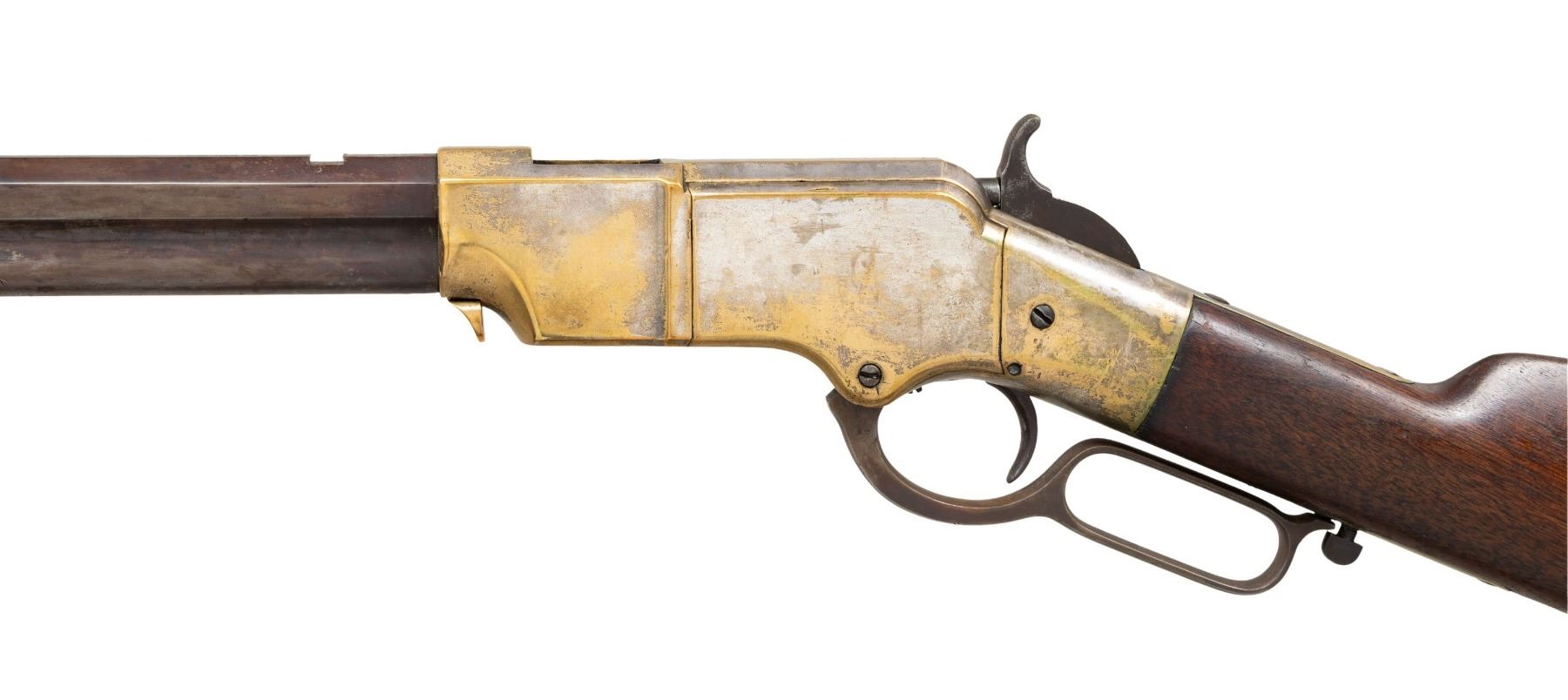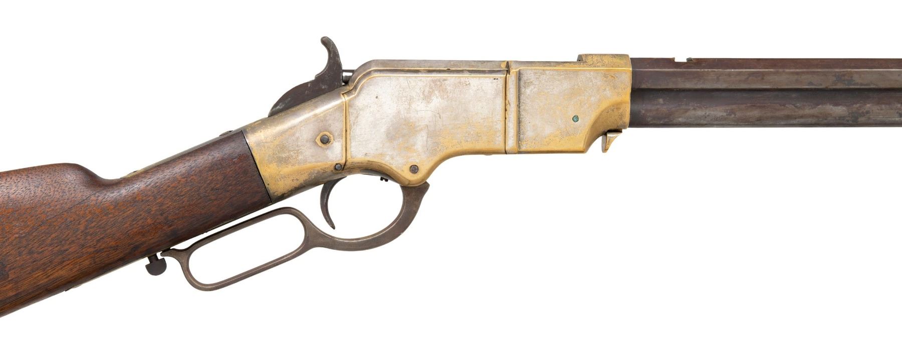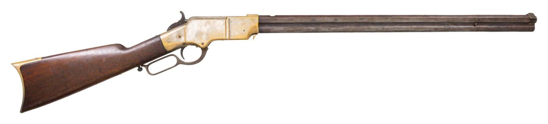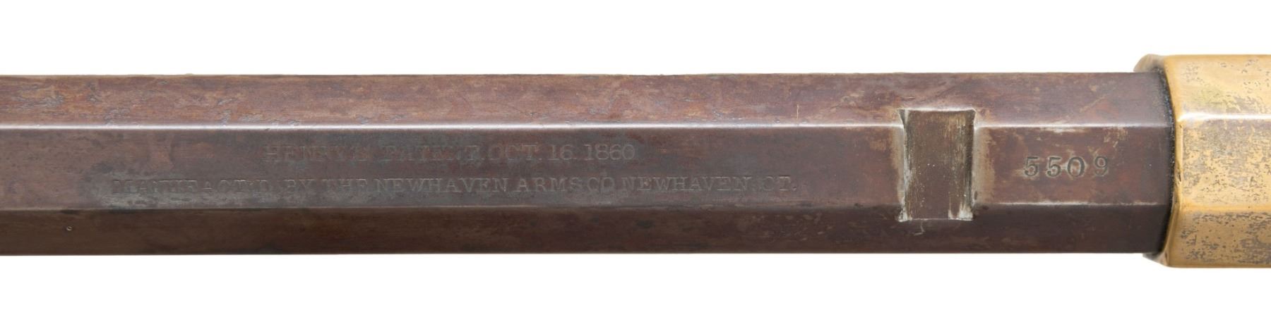 Cal. 44. S# 5509. This honest survivor was made in 1864 and has all the characteristics proper for this 5th variant. Matching serial numbers are found on 24" octagon barrel, stock, and 2nd type pointed buttplate. Frame & buttplate are silver plated which is rarely seen. Sling swivels are mounted on the left side of stock and barrel. More Henrys were made in 1864 than any other year, estimated production at about 4000 with many if not most being sold privately for use in the Civil War.CONDITION: good to very good overall, complete and matching, missing rear sight. Brass retains about half its silver plate, less on buttplate. Barrel is mottled dark gray/plum. The proper 2-line all serif barrel address is very good, as are all serial number stamps. Stock is sound with normal handling marks. Mechanically fine with crisp rifled bore. (01-26797/JS). ANTIQUE. $9,000-14,000.